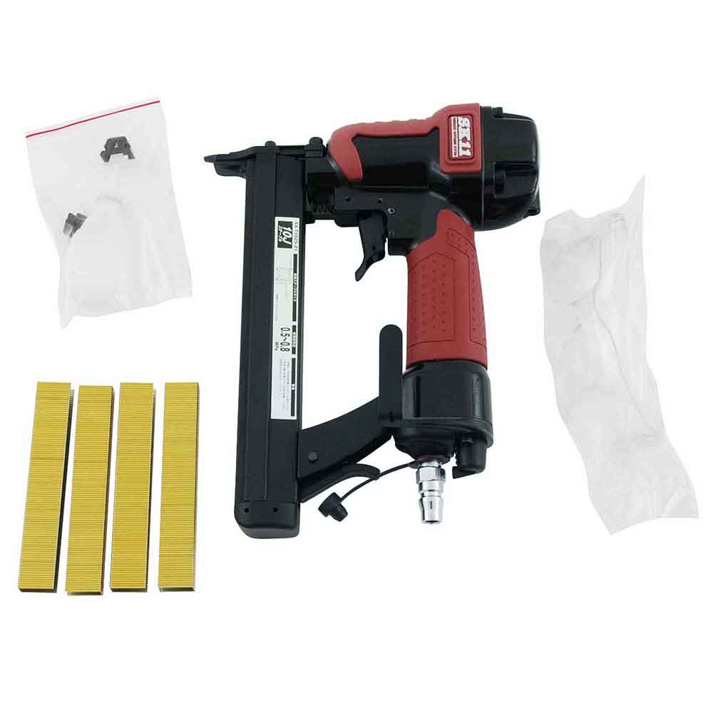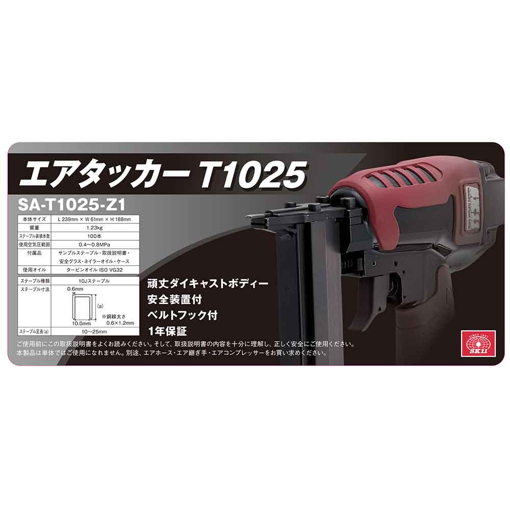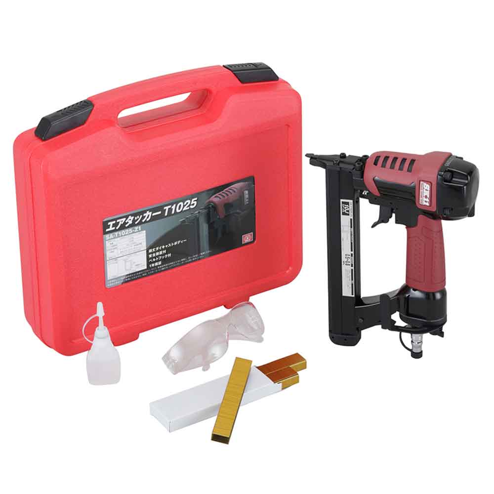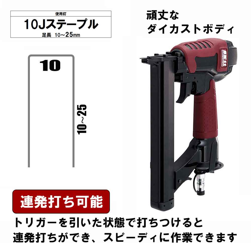 頑丈なダイカストボディのエアータッカーです。 木材の止めや石膏ボード貼り作業等。 先端を部材に当てないと発射しない安全装置付きです。 ベルトフック付で持ち運びがらくらくできます。 ●本体サイズ:L239XW61XH188mm。 ●重量:1230g。 ●ステープル装填本数:100本。 ●使用空気圧範囲:0.5~0.8MPa。 ●使用オイル:タービンオイルISOVG32。 ●ステープル種類:10Jステープル。 ●ステープル足長:10~25mm。 ●鋼線太さ:0.6X1.2mm。 ●セット内容:本体・サンプルネイル・安全グラス・ネイラーオイル・ケース・取扱説明書。