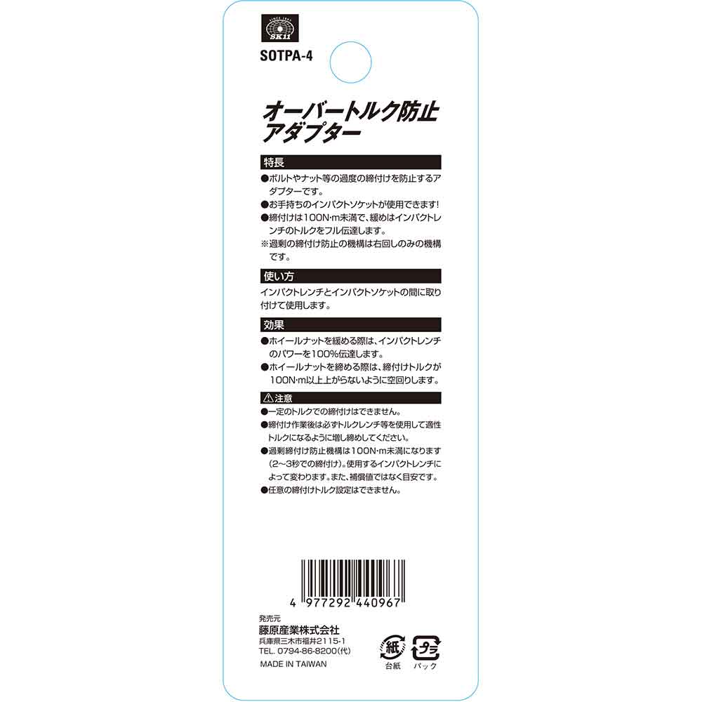 ボルトナット等の過度の締付を防止します。 タイヤの交換等のボルトナットの締付作業。 タイヤのホイルナットを締め付ける際、締めすぎを防止します。 右回転時は、フルパワーで回しても100N・m以上になりません。 ●ソケット差込角:12.7mm。