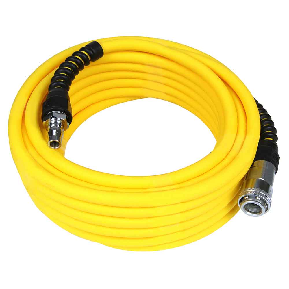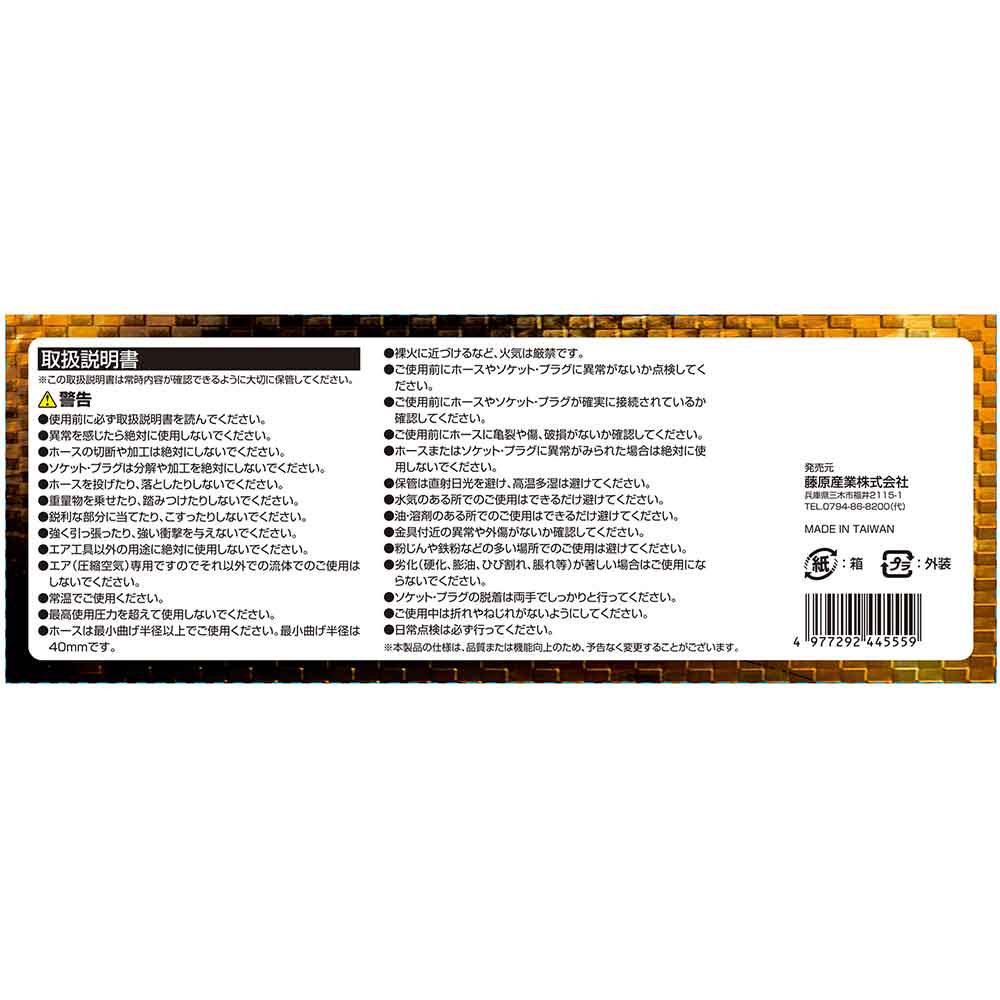 柔らかいくて扱いやすいエアーホースセットで、疲労軽減や作業性向上に最適です。 エアーコンプレッサーの圧縮空気専用樹脂ホース。 常圧汎用で最高1.5MPaまで使用できます。 常圧汎用ワンタッチソケットとプラグ付きで接続が簡単です。 ホースガード付きで柔らかいホースのソケットやプラグの付け根の折れを軽減します。 作業中にはっきり目立つイエローカラーを採用しています。 PVC樹脂採用で耐水性がアップしています。 ●サイズ:内径6.5mm×外径10.7mm。 ●ホース長:10m。 ●最高使用圧力:1.5MPa。 ●常用圧力:1.0MPa。 ●接続:常圧汎用ワンタッチソケット、プラグ。 ●接続継ぎ手:20SN・20PN。 ●最小曲げ半径:40mm。
