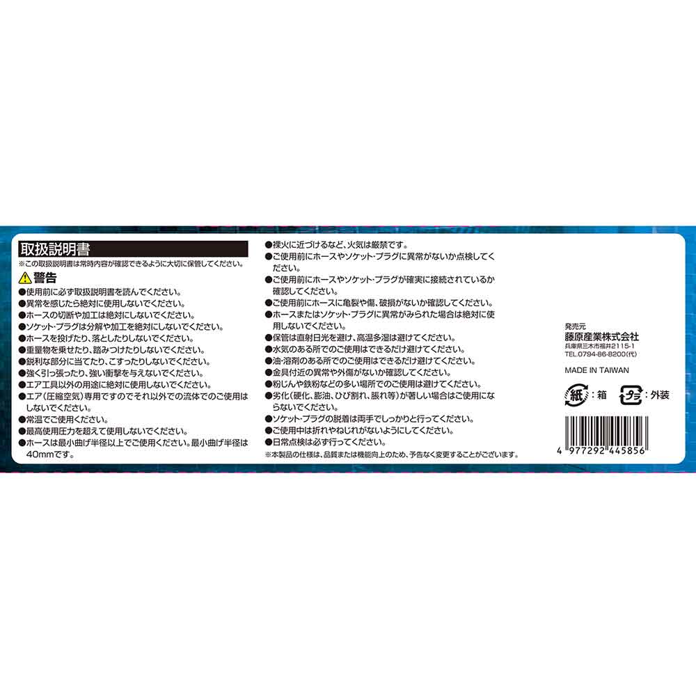 本製品の仕様は、品質または機能向上のため、予告なく変更することがございます。使用前に必ず取扱説明書を読んでください。異常を感じたら絶対に使用しないでください。ホースの切断や加工は絶対にしないでください。ソケット・プラグは分解や加工を絶対にしないでください。 ホースを投げたり、落としたりしないでください。重量物を乗せたり、踏みつけたりしないでください。鋭利な部分に当てたり、こすったりしないでください。強く引っ張ったり、強い衝撃を与えないでください。 エア工具以外の用途に絶対に使用しないでください。エア(圧縮空気)専用ですので、それ以外での流体でのご使用はしないでください。常温でご使用ください。最高使用圧力を超えて使用しないでください。