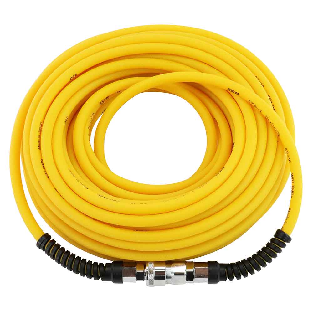 日本製のソフトエアホースです。 エアーホース。 特殊エラストマー樹脂採用でやわらかいホースです。 常圧エアホースでワンタッチソケット・プラグ付きです。 ホースガイド付きなので、ホース折れの心配がありません。 ●サイズ:内径6.5mm×外径10.0mm。 ●ホース長:20m。 ●最高使用圧力:1.5Mpa。