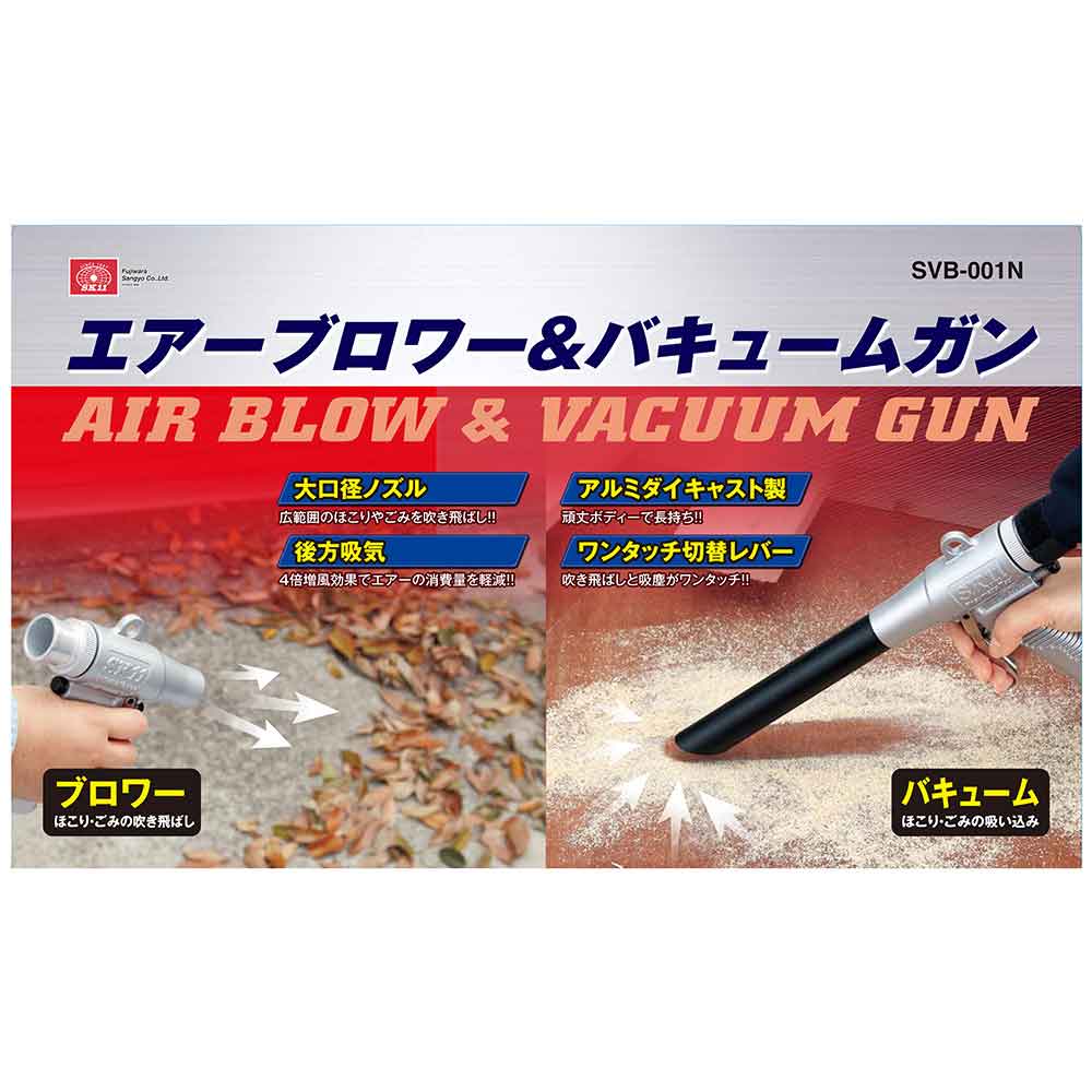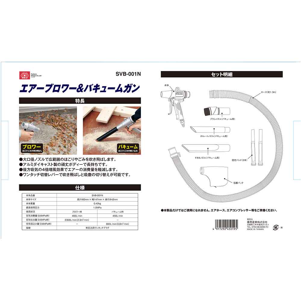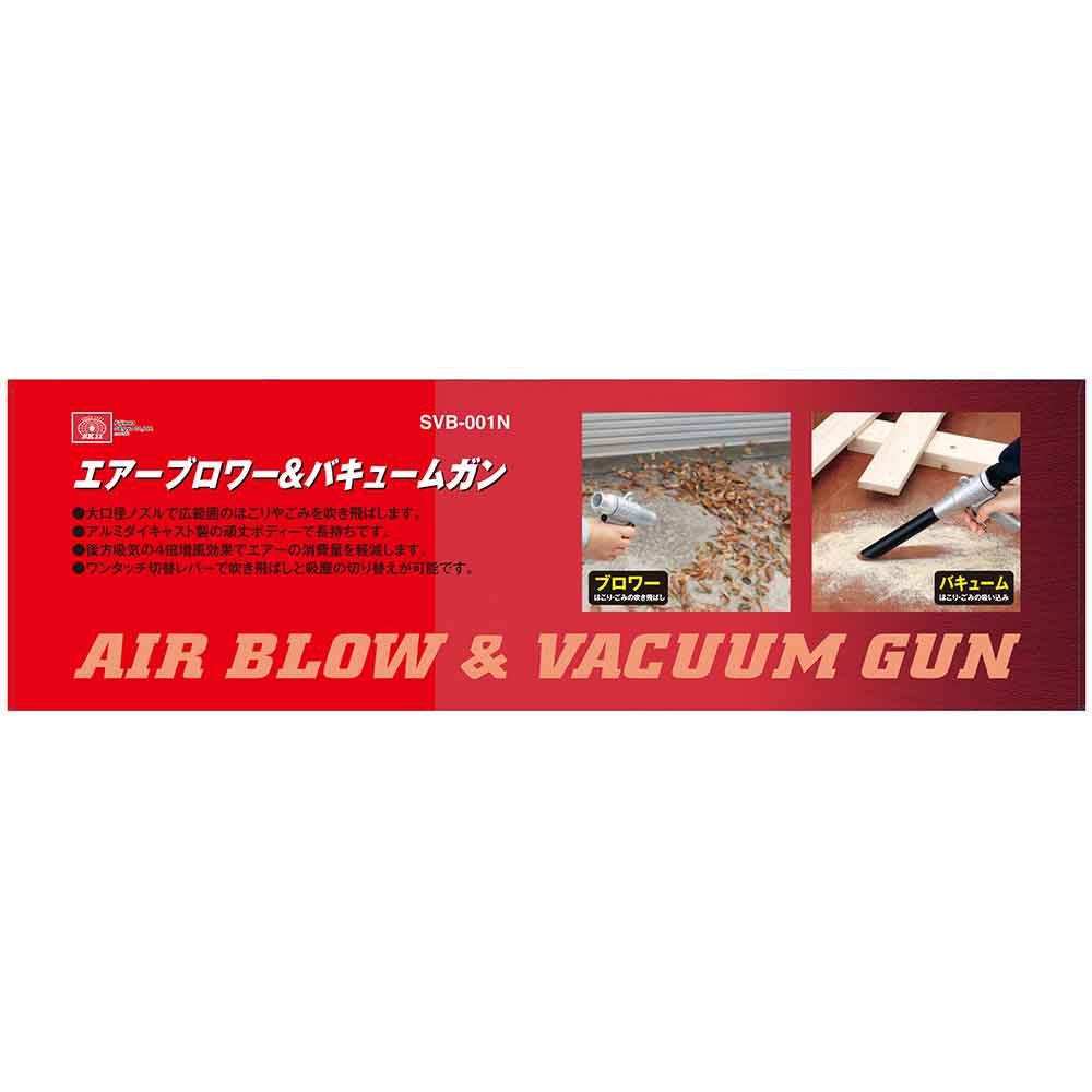 エアー吹き出しでごみの吹き飛ばしや乾燥作業、吸引で掃除が出来る1台2役の機能を持っています。 エアー吹き出しでほこりやごみの吹き飛ばしや乾燥作業・冷却など、エアー吸引でごみや木くずの掃除。 ワンタッチ切替レバーで吹き飛ばしと吸塵の切り替えが可能です。 吸引用ノズルが3種類付きで用途によって使い分け出来ます。 後方吸気の4倍増風効果でエアーの消費量を軽減します。 アルミダイキャスト製の頑丈ボディーで長持ちします。 ●本体サイズ:高さ160mm×幅147mm×奥行き42mm。 ●本体重量:0.42kg。 ●最高使用圧力:1.0MPa。 ●空気消費量(0.6MPa時):ブロワー時460L/min。 ●空気吐出量(0.6MPa時):ブロワー時2300L/min。 ●空気消費量(0.6MPa時):バキューム時450L/min。 ●空気吸込み量(0.6MPa時):バキューム時800L/min。 ●接続:常圧汎用ワンタッチプラグ。 ●セット内容:本体・ホース(約1.3m)・ブラシノズル(バキューム用)・ストレートノズル(バキューム用)・すきまノズル(バキューム用)・固定バンド2本・吸塵バッグ。