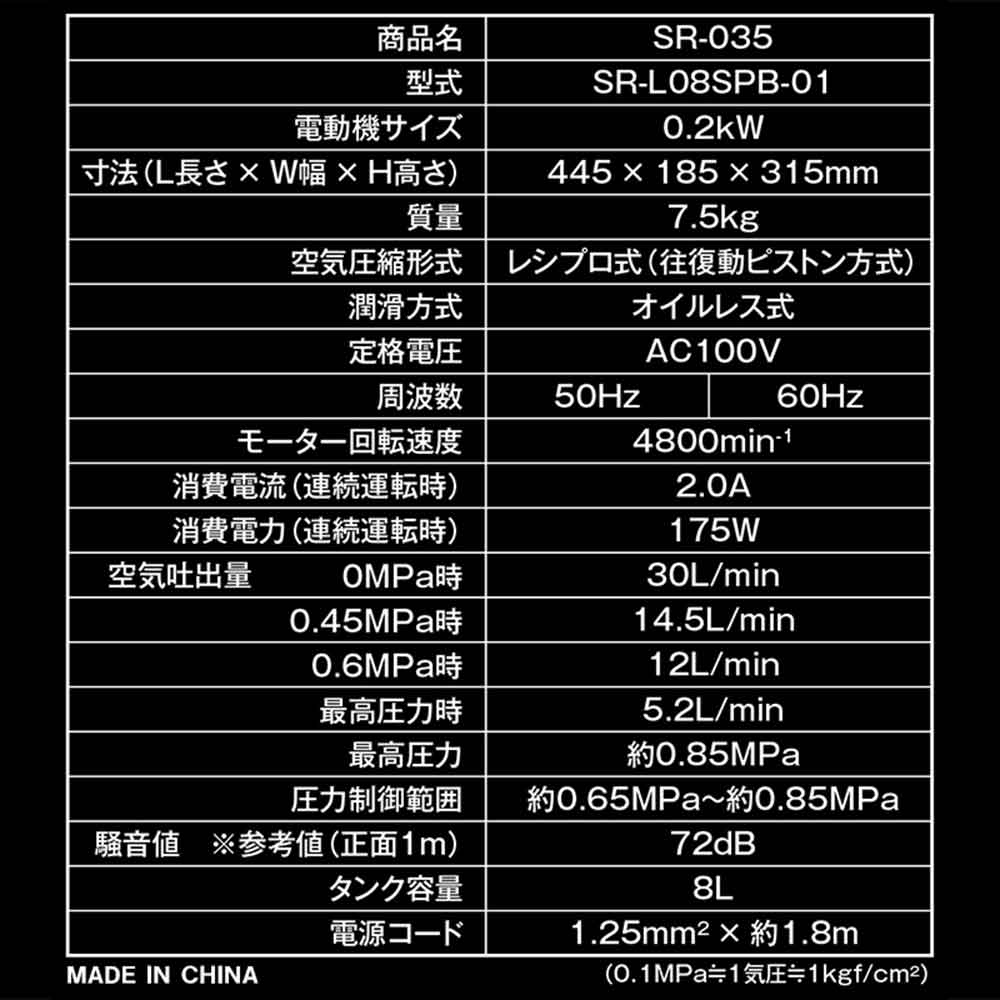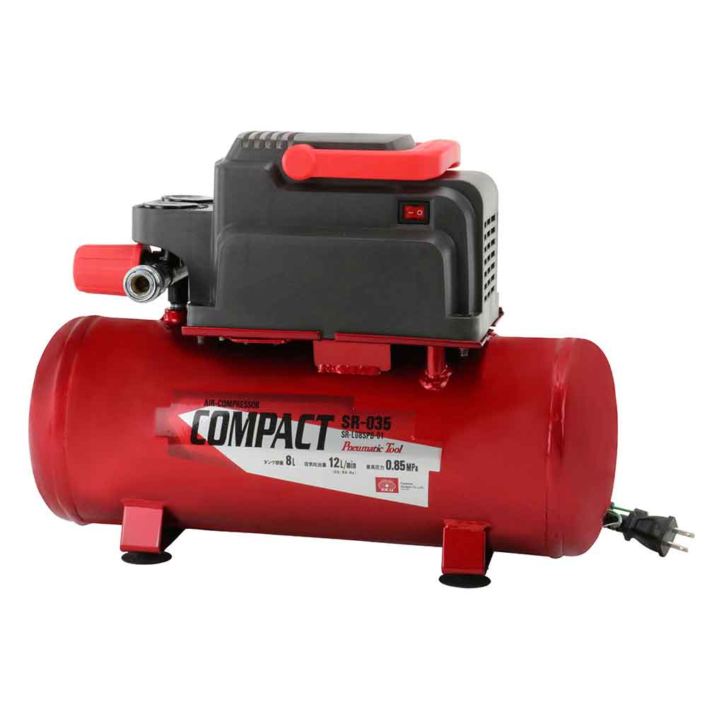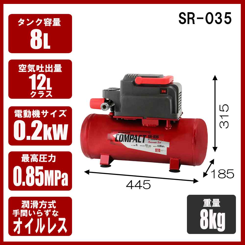 移動・収納に便利な小型で軽量なコンプレッサーです。 タイヤやボールの空気入れ・ホコリ飛ばしや小物塗装、エアタッカーの使用。 横幅44cmx高さ40cmx厚さ16cmのスペースがあれば収まる、場所を取らないコンパクトサイズです。 本体質量約8kgの軽量設計で、ハンドル付なので楽に持ち運べます。 メンテナンス不要のオイルレスタイプです。 ●電動機サイズ:0.2kW、定格電圧:AC100V。 ●定格周波数:50/60Hz。 ●定格回転速度:4800min-1、定格消費電力:175W、定格時間:連続。 ●騒音レベル:72dB、タンク容量:8L。 ●最高使用圧力:約0.85MPa、圧力制御範囲:約0.65~0.85MPa。 ●充填時間:約3.5分(0~0.85MPa)・約1分(0.65~0.85MPa)。 ●空気吐出量(L/min):30L(0MPa時)・14.5L(0.45MPa時)・12L(0.6MPa時)・5.2L(最高使用圧力時)。 ●本体質量:約8kg、本体寸法(L×W×H):445mm×185mm×315mm、電源コード長さ:1.7m。