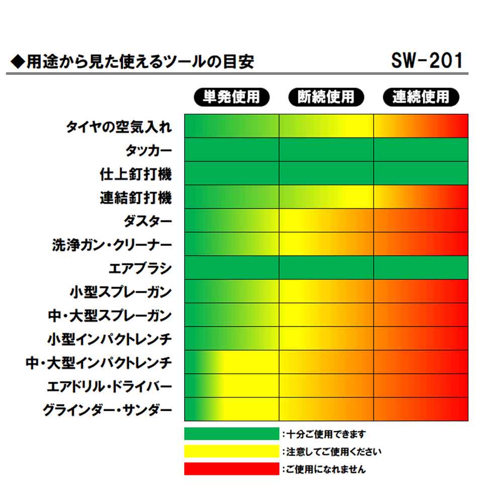 記載してある吐出空気量と、ご使用になる空圧工具、空圧機器の使用に必要な空気量(空気消費量)を確認してください。 大気を吸ってタンク内に押し込める(圧縮)過程でタンク内に水分が生じます。発生した水分はコンプレッサの鉄部の腐食を促進し、場合によっては空気に混ざって吐出されます。また大量にタンク内に滞留させますとタンク容量の低下を招き、充填できる空気量が減少します。毎使用ごとにタンク底部のドレンコックを開いて、水分を排出してください。 モーター側面や上部の吸気口や排気口を塞がないでください。モーターの空冷を妨げ異常加熱を引き起こします。シリンダー上部にフィルターを取り付けない状態で使用しないでください。大気中のチリやホコリがシリンダー内に侵入し、故障の原因となります。