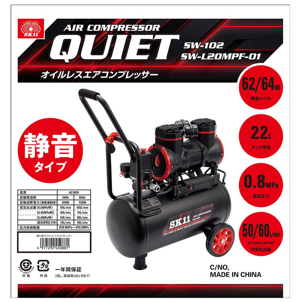 メンテナンス不要のオイルフリー式で作動音が小さい静音エアーコンプレッサーです。 各種空圧工具、空圧機器作動用の空気圧縮機。 オイルを併用しないピストン・シリンダを採用したオイルフリー式なので、オイル量チェックや補充、交換などのメンテナンスがいりません。 ●定格電圧AC100V・周波数50/60Hz・消費電流6.7/7.2A(50/60Hz)。 ●消費電力610/720W(50/60Hz)・電動機サイズ0.75kW。 ●最高圧力0.8MPa・圧力制御範囲0.6~0.8MPa・タンク容量22L・定格時間連続。 ●吐出空気量(50Hz):0MPa時95L/分・0.45MPa時65L/分・0.6MPa時50L/分・0.8MPa時35L/分。 ●吐出空気量(60Hz):0MPa時105L/分・0.45MPa時75L/分・0.6MPa時60L/分・0.8MPa時40L/分。 ●本体質量約19kg・本体寸法長さ約570×幅330×高さ555mm。 ●付属品:タイヤ×2・タイヤ取り付け用ボルト・ナット×各2・ゴム足×1・ゴム足取り付け用ボルト・ナット×各1・フィルター×2。