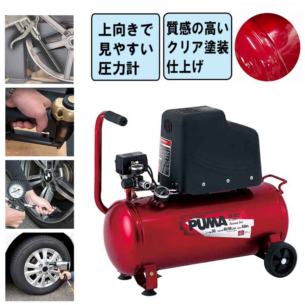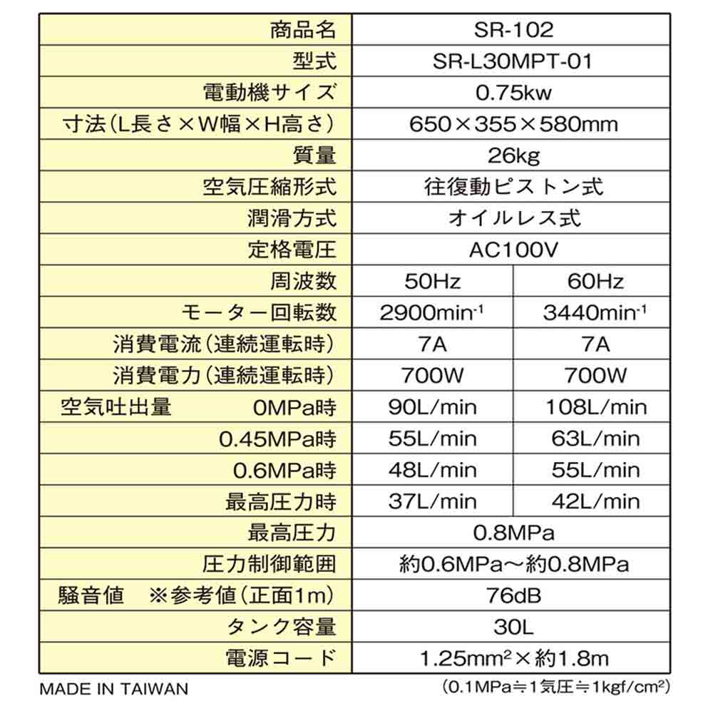 日曜大工やいろんな用途が広がるレギュラーサイズのオイルレスエアーコンプレッサーです。 空圧工具・空圧機器用空気圧縮機。 オイルレスの為、オイル交換の手間がかかりません。 余裕の30Lタンクを搭載しています。 吐出量55Lクラスです。 手が汚れにくく、開閉しやすいバブル式ドレンコックです。 圧力ゲージが確認しやすい上向きに配置されています。 ●タンク容量:30L。 ●空気吐出量(50Hz):0Mpa時90L/min・0.45Mpa時55L/min・0.6Mpa時48L/min・最高圧力時37L/min。 ●空気吐出量(60Hz):0Mpa時108L/min・0.45Mpa時63L/min・0.6Mpa時55L/min・最高圧力時42L/min。 ●圧力制御範囲:約0.6~0.8Mpa。 ●消費電力:700W・出力:0.75kW。 ●常圧仕様(1/4カプラ仕様)・電動機サイズ:0.75kW。 ●空気圧縮方式:往復動ピストン方式・潤滑方式:オイルレス方式。 ●最高圧力:0.8Mpa。