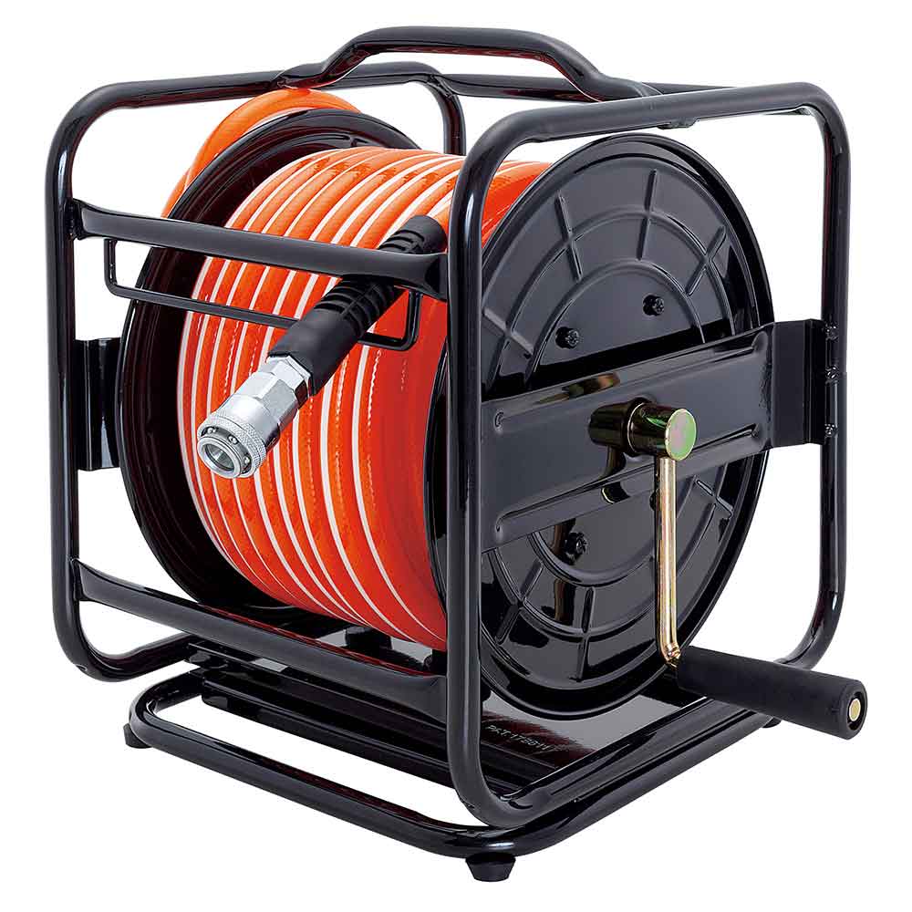大流量8.5mm太いホースの回転台付きエアリール25m巻きです。 空圧工具とコンプレッサーとエアー源との配管接続、長尺の圧縮空気用エアホースの巻取り収納。 工具が能力を十分に発揮できるエアー流量を供給できる8.5mm内径太径ホース採用、ホースが長くなるにしたがって大きくなる圧力損失を軽減し回転系エアー工具やダスターの連続作業に最適です。 作業現場での視認性が抜群で、鮮やかなオレンジ色の軽くて丈夫な素材ポリウレタンホースを使用し、脱着が簡単なワンタッチソケット、プラグ、折れ曲がりによるホースの破損を軽減するホースガード付きです。 25mのエアホースもハンドル操作だけで簡単に素早くまとめられ収納も簡単で、35cm四方のスペースがあれば収納できるコンパクトサイズです。 軽量で丈夫なウレタン樹脂製ホース採用しています。 ●再考使用圧力:1.5MPa、常用圧力:1.0MPa、適応流体:空気。 ●本体寸法:約高さ335x幅250x奥行280mm、本体質量:約5.8kg。 ●ホースサイズ:内径8.5mm、外径:12.5mm。 ●引き出し側ホース長:25m、コンプレッサ接続側ホース長:1m。