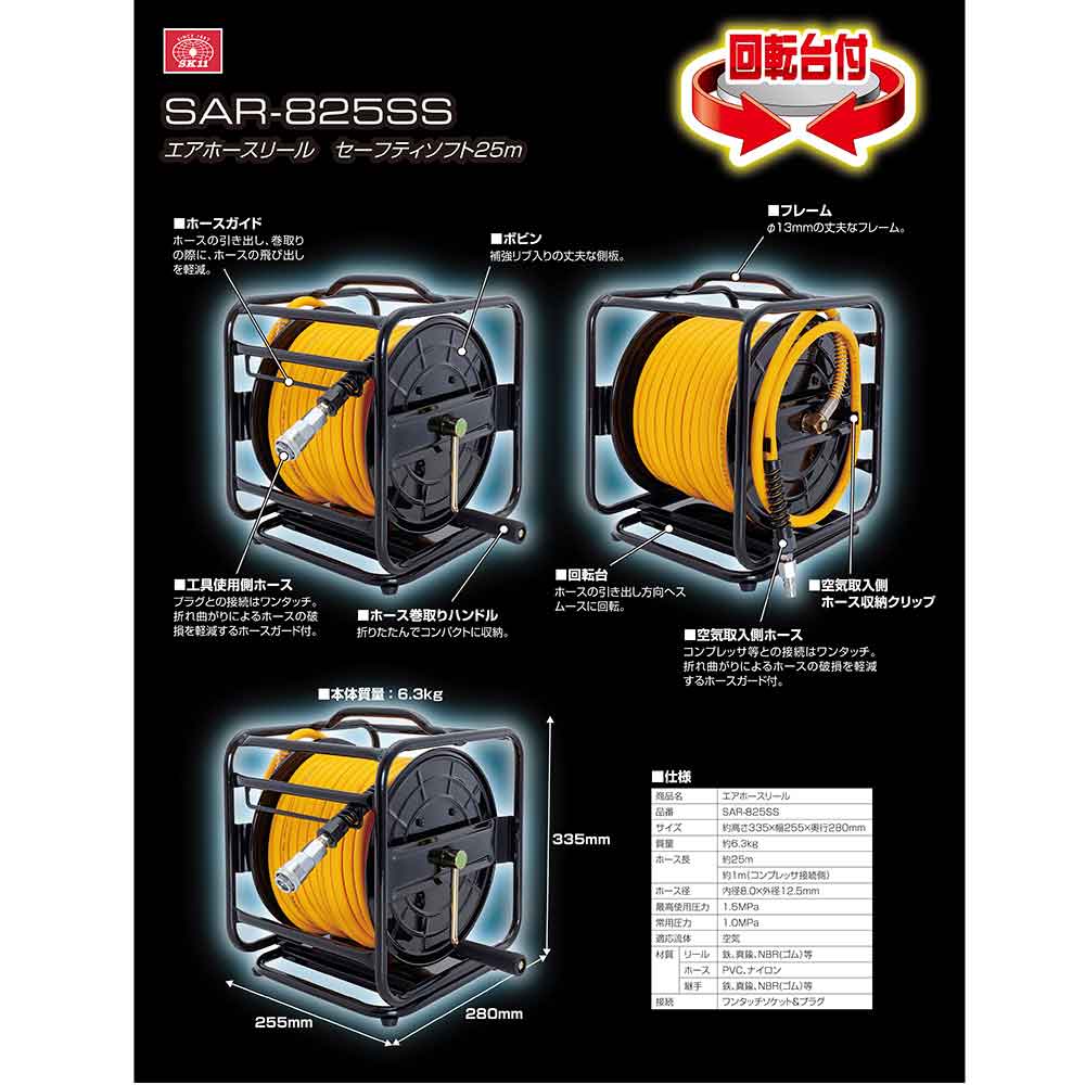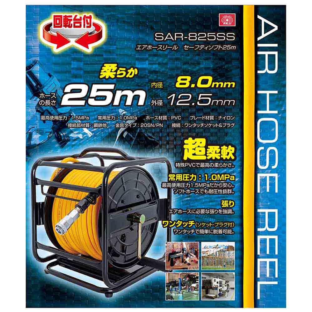 大流量8.0mm太い、柔らかいホースの回転台付きエアリール20m巻きです。 空圧工具とコンプレッサーとエアー源との配管接続、長尺の圧縮空気用エアホースの巻取り収納。 工具が能力を十分に発揮できるエアー流量を供給できる8.0mm内径太径ホース採用、ホースが長くなるにしたがって大きくなる圧力損失を軽減し回転系エアー工具やダスターの連続作業に最適です。 脱着が簡単なワンタッチソケット、プラグ、折れ曲がりによるホースの破損を軽減するホースガード付きです。 25mのエアホースもハンドル操作だけで簡単に素早くまとめられ収納も簡単で、35cm四方のスペースがあれば収納できるコンパクトサイズです。 柔軟で、取り回しがしやすく、巻きグセがつきにくいソフト塩ビ製ホース採用しています。 ●再考使用圧力:1.5MPa、常用圧力:1.0MPa、適応流体:空気。 ●本体寸法:約高さ335x幅250x奥行280mm、本体質量:約6.3kg。 ●ホースサイズ:内径8.0mm、外径:12.5mm。 ●引き出し側ホース長:25m、コンプレッサ接続側ホース長:1m。