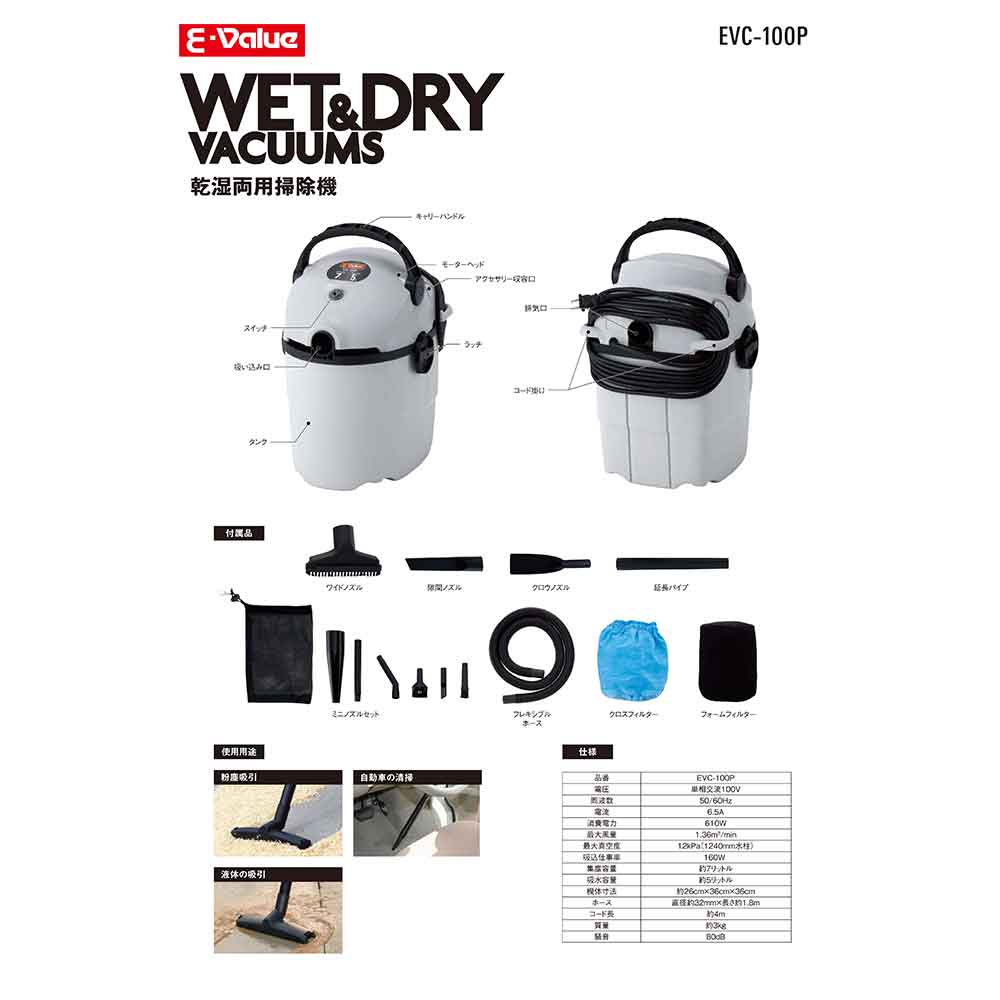 小型・軽量(3.0kg)、軽くて錆びない樹脂タンクを採用しています。 粉塵・液体の吸引・自動車の清掃。 錆びないプラスチックタンク、ほこりの入らない防塵スイッチを採用しています。 ブロワーとしても使用可能です。 小型軽量で、ご家庭での屋外用、車掃除用として最適です。 乾湿両用です。 極細ノズルセット付きです。 ●機体サイズ:約26×36×36cm。 ●電源:単相交流100V・電流:6.5A・定格消費電力:610W。 ●最大真空度:12kPa・最大風量:1.36m3/min。 ●吸込仕事率:105W。 ●集塵容量:7L・吸水容量:5L。 ●電源コード長:約2.5m。 ●騒音値:80dB。 ●質量:約3kg。 ●セット内容:汎用ノズル・隙間ノズル・クロウノズル・延長パイプ・フレキシブルホース・クロスフィルター・フォームフィルター・ミニノズルセット。