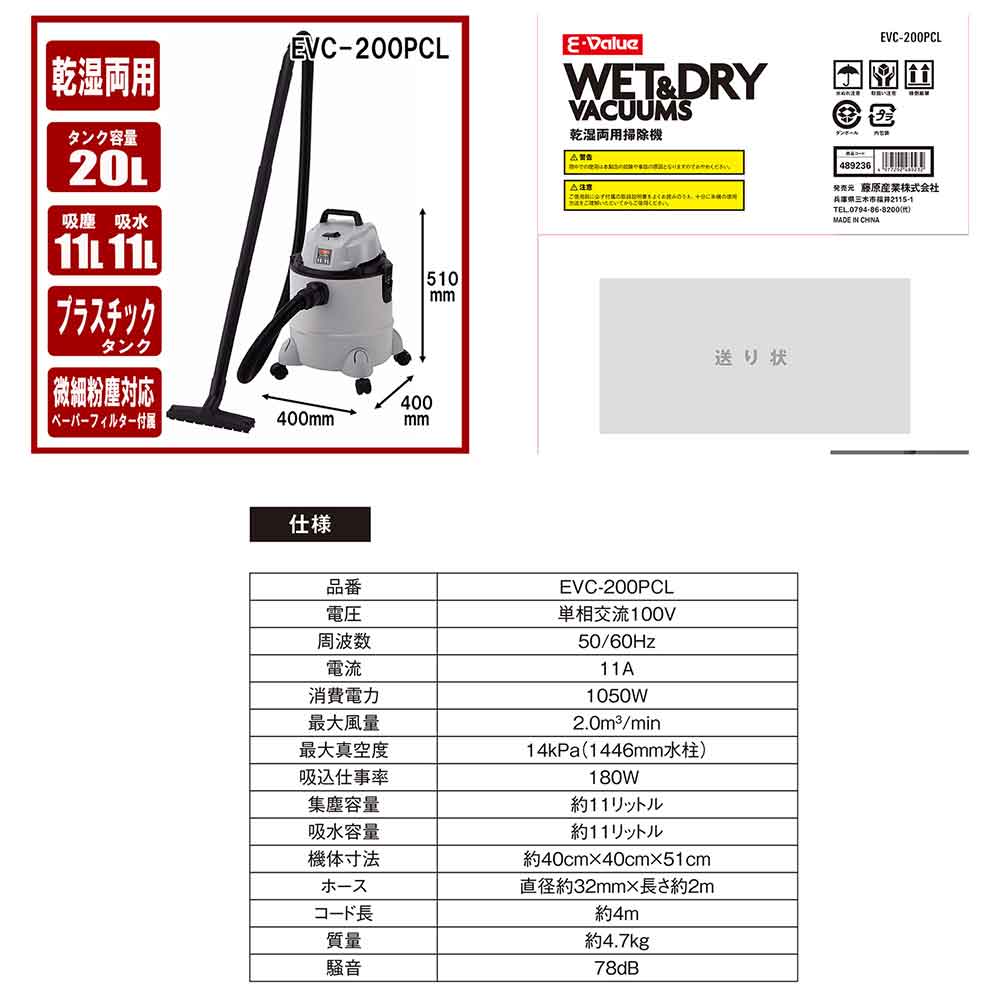 乾湿両用掃除機20L EVC-200PCL メーカー直送 ▼返品・キャンセル不可【他商品との同時購入不可】