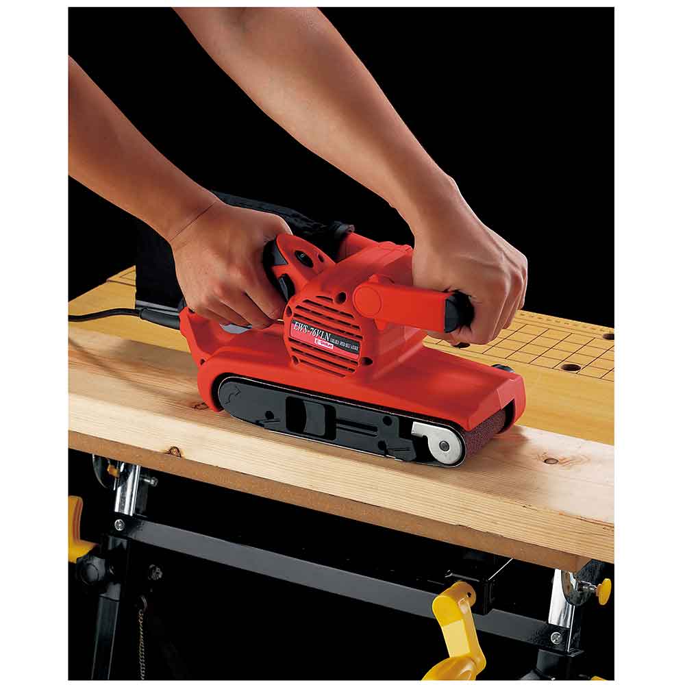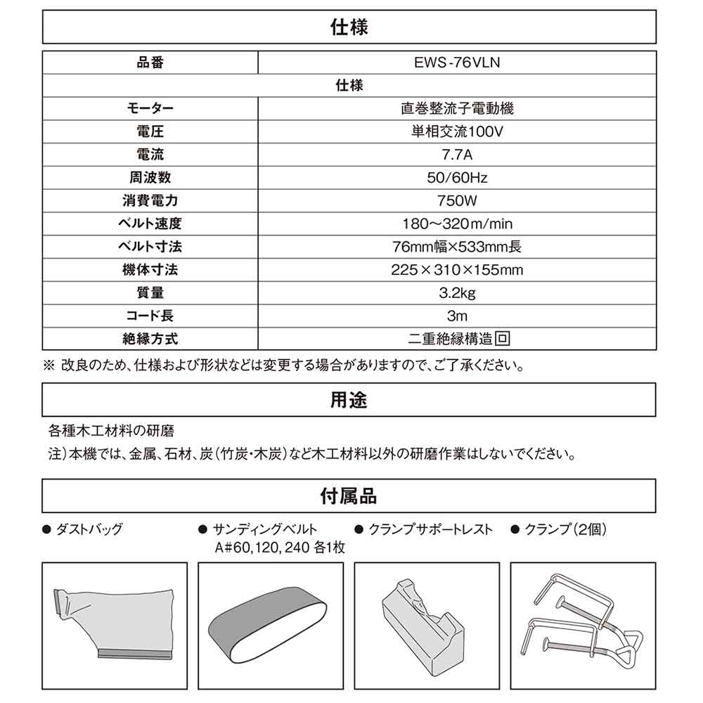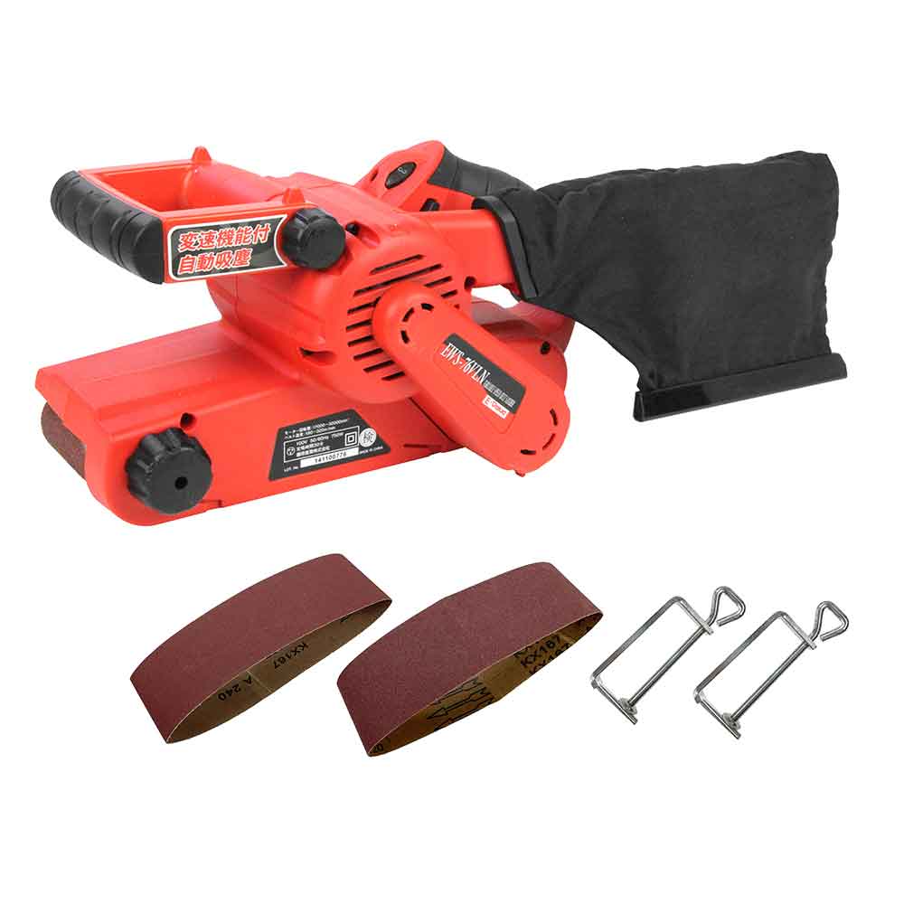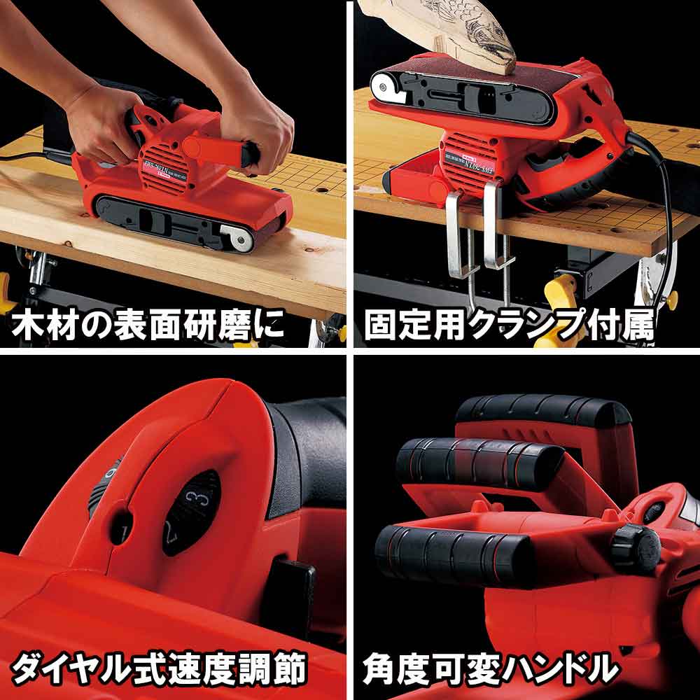 自動集塵機能付きで快適な研磨作業ができます。 自動集塵機能・速度調整機能付きベルトサンダー。 自動集塵機能付きで、発生した粉塵は自動的に集塵袋へ収容でき、粉塵の少ない快適な研磨作業ができます。 ダイヤル式回転速度調整機能付きで、材料や作業の内容に合わせて最適な回転数に調整が可能(調整範囲180m~320m/分)、小物の研磨や粒の小さいペーパーを使った仕上げ研磨は低速回転がおすすめです。 作業状態や自分の好みに合わせて、ハンドル角度を3段階に調整可能です。 強力750Wモーターは短時間で広範囲の研磨作業ができます。 ●ベルトサイズ:幅76mm×長533mm。 ●機体サイズ:約255×310×155mm。 ●ベルト速度:180~320M/分。 ●コード長:約3.0m。 ●本体質量:約3.2kg。 ●電源:単相交流100V(50/60Hz共用)。 ●電流:7.7A。 ●消費電力:750W。 ●セット内容:サンディングベルト(粒度60・120・240各1枚)・ダストバッグ・クランプサポートレスト・クランプ(2個)。