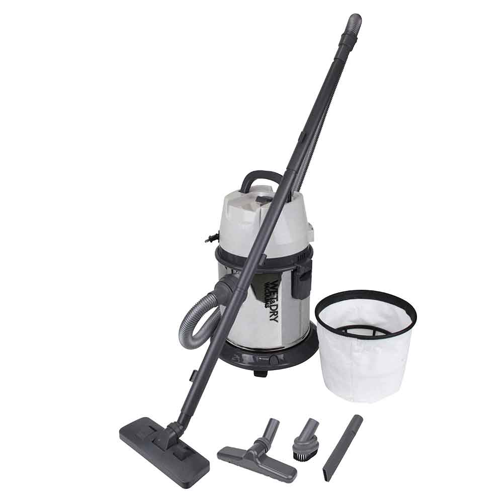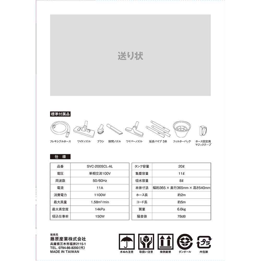 モーターヘッドが平らな乾湿両用掃除機です。 作業場での集塵や水の吸引。 錆びにくく、丈夫なステンレスタンクです。 収納時に便利なオートコードリール機能付きです。 ヘッド部分が平坦なので、移動・収納の際に本体の上に荷物を積むことができます。 ホース収納時に固定できるバンド付きです。 ●電源:100V・電流:11A・消費電力:1100W。 ●タンク容量:20L。 ●電源コード長:約5.0m・ホース長:約2m。 ●騒音値:78dB。 ●絶縁方式:二重絶縁構造。 ●サイズ:約365×365×540mm・質量約6.6kg。 ●最大風量:1.58m3/min・最大真空度:14kPa。 ●集塵容量(11L)・吸水容量(8L)。 ●セット内容:フレキシブルホース・延長パイプ3本・ワイドノズル・ワイパーノズル・隙間ノズル・丸毛ブラシ・布フィルターバック・ホース固定用マジックテープ。