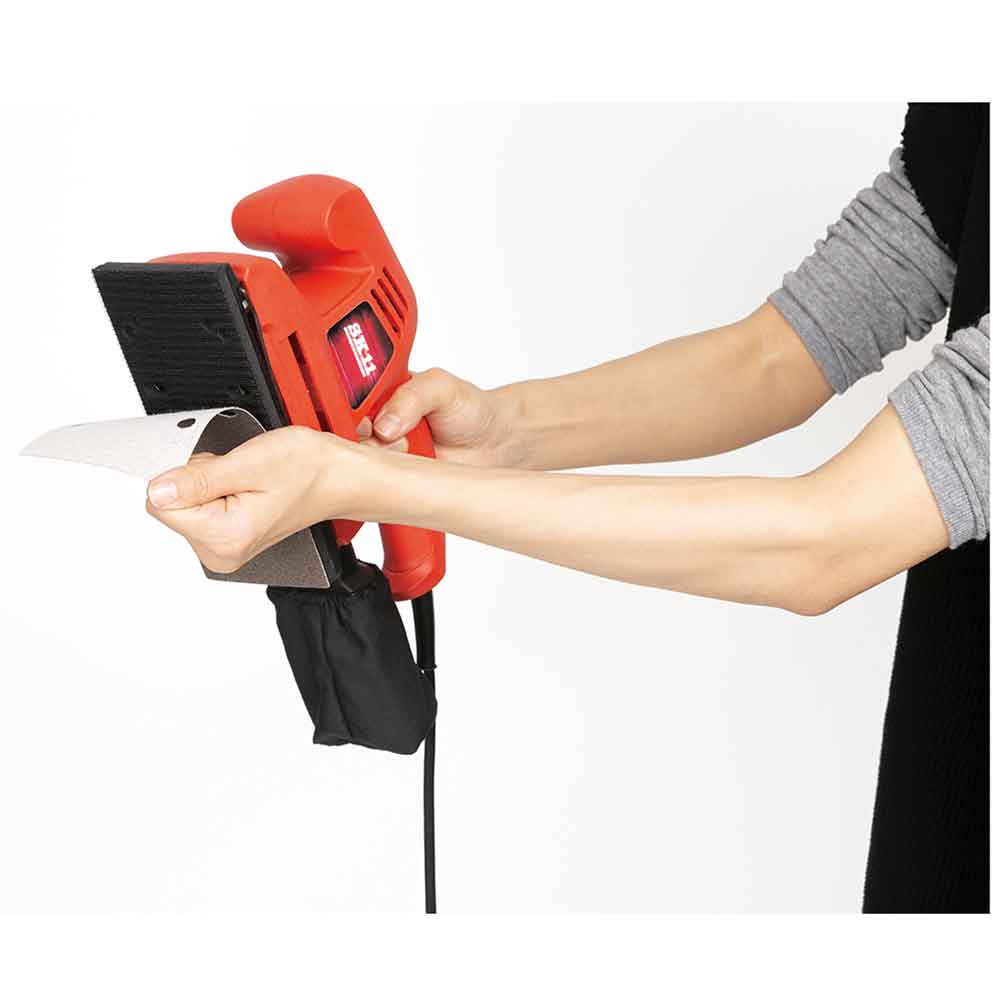 木工仕上げの磨き作業や塗装面の研磨作業に便利なオービタルサンダーです。 木工仕上げの磨き、塗装面の研磨作業。 マジックペーパーを使って取り付けたり、市販のサンドペーパーをクランプで固定可能な兼用タイプです。 本体重量が約1.3kgの軽量タイプで取り回しが楽に行なえます。 シングルファンで振動を軽減しています。 内蔵ファンによりダストバックに自動集塵される機能付きです。 簡単操作のスライドオンスイッチを採用しています。 ●電源:単相交流100V(50/60Hz共用)。 ●消費電力:200W。 ●回転数:12000回転/分・振動数:20000回/分。 ●パッド寸法:92×185mm。 ●パッド起動幅:2mm。 ●絶縁方法:二重絶縁。 ●定格使用時間:30分。 ●コード長:約2.0m。