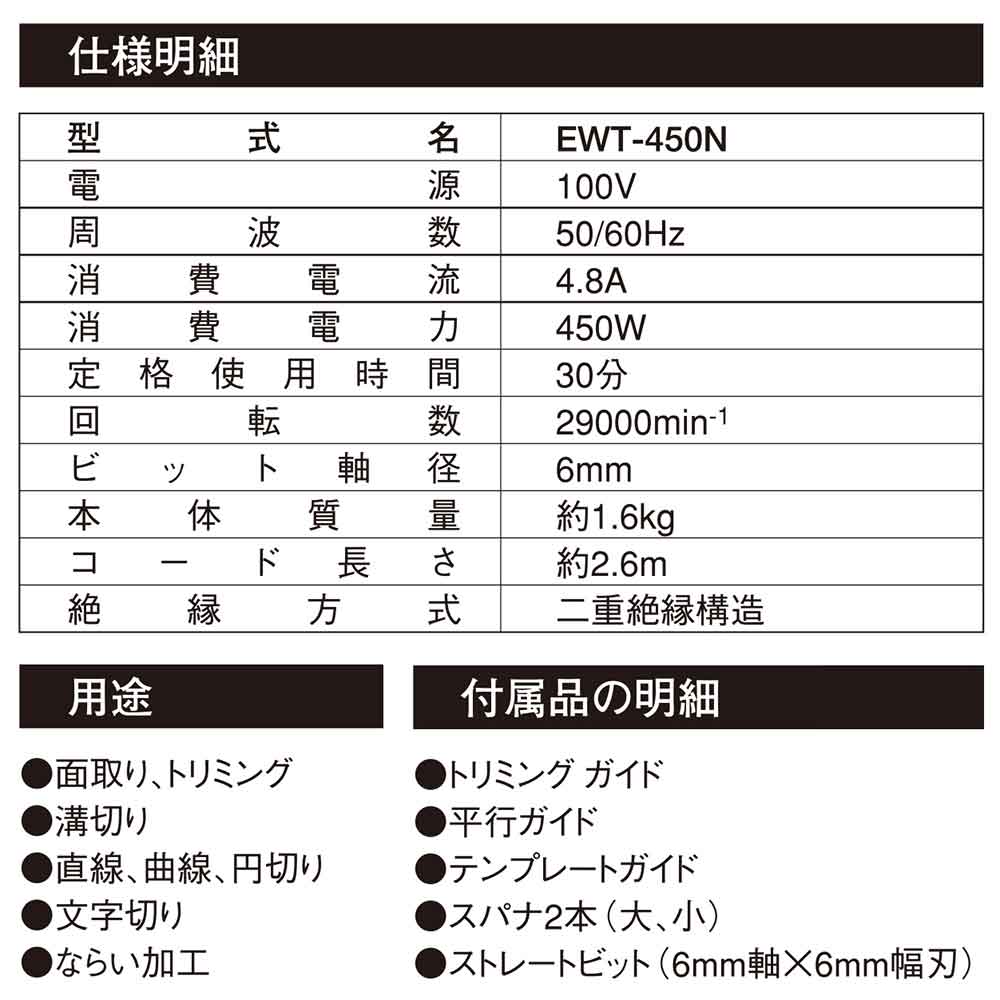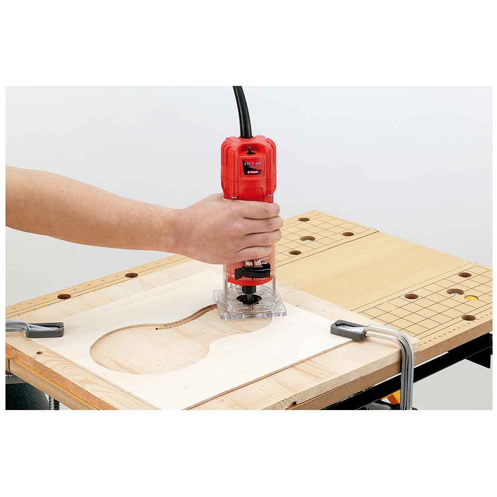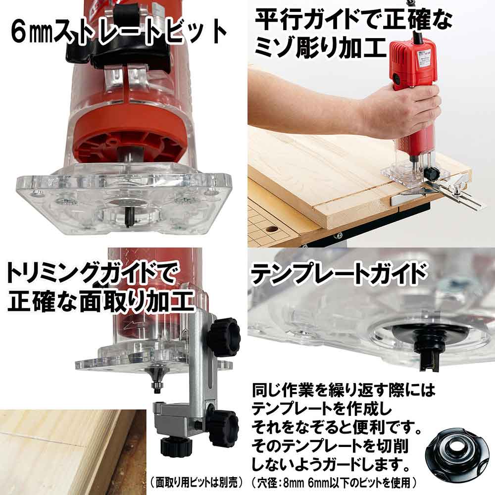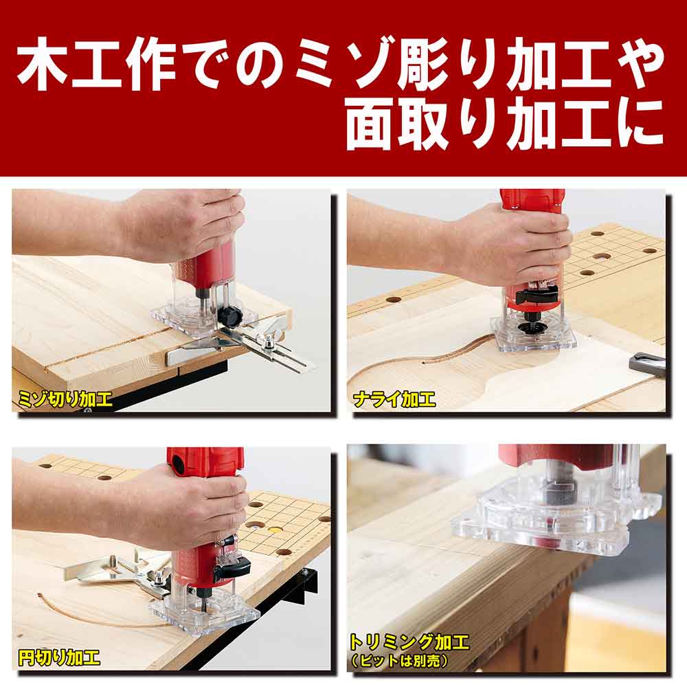 ウッドクラフトの定番商品です。 木材の縁の飾り面加工、文字彫り、溝掘り加工。 握りやすく、操作しやすい細径ボディです。 ゴムローラ式で切り込み深さの微調整が簡単です。 ワンタッチ式ベースロック機能でベースの固定・解除が簡単です。 収納・移動に便利なケース入りです。 ●電源:100V(50/60Hz)。 ●電流:4.8A。 ●消費電力:450W。 ●回転数:29000回転/分。 ●ビット軸径:6mm。 ●コード長:約2.6m。 ●絶縁方式:二重絶縁方式。 ●セット内容:キャリングケース・トリミングガイド・ストレートビット6mm・スパナ2本・平行定規・テンプレートガイド。