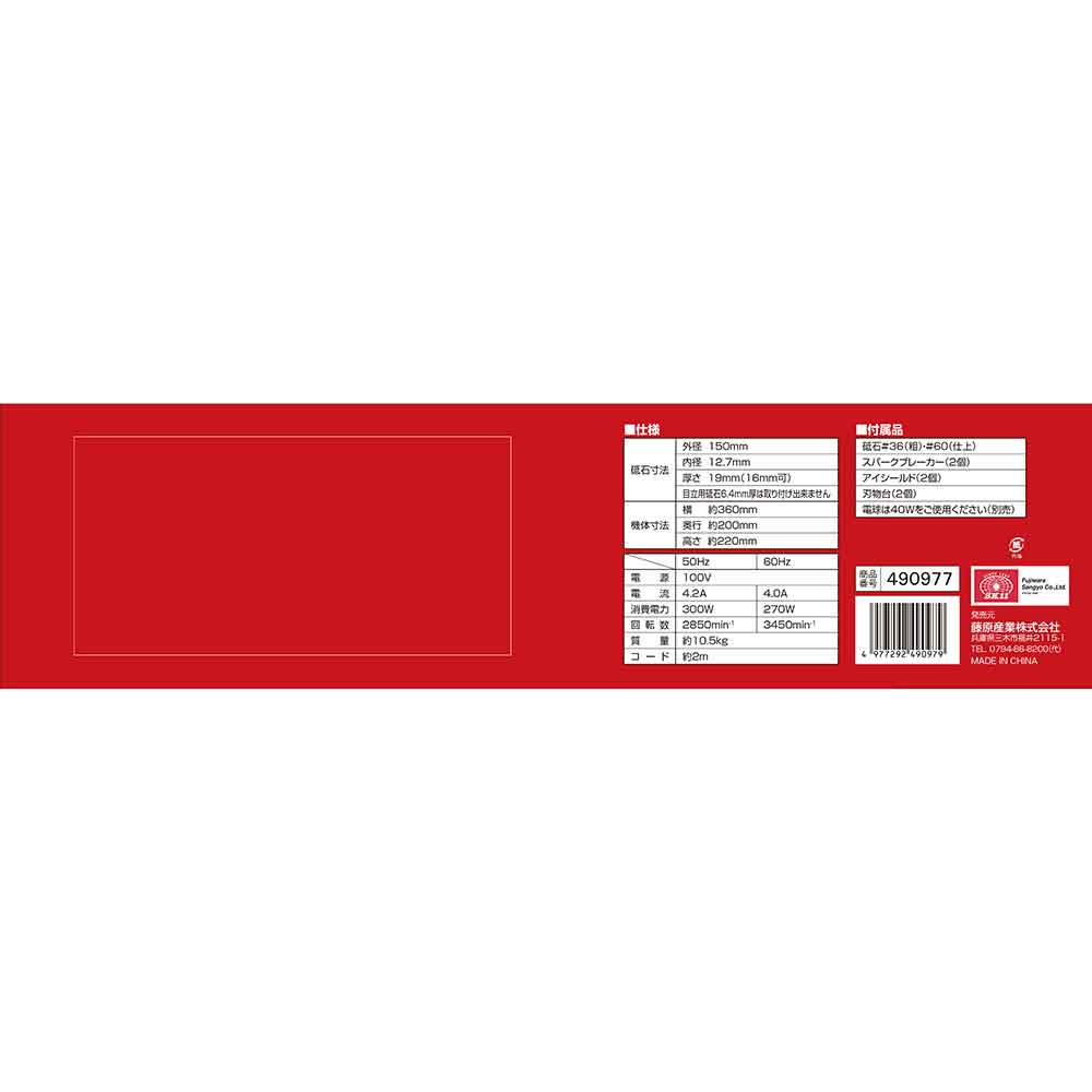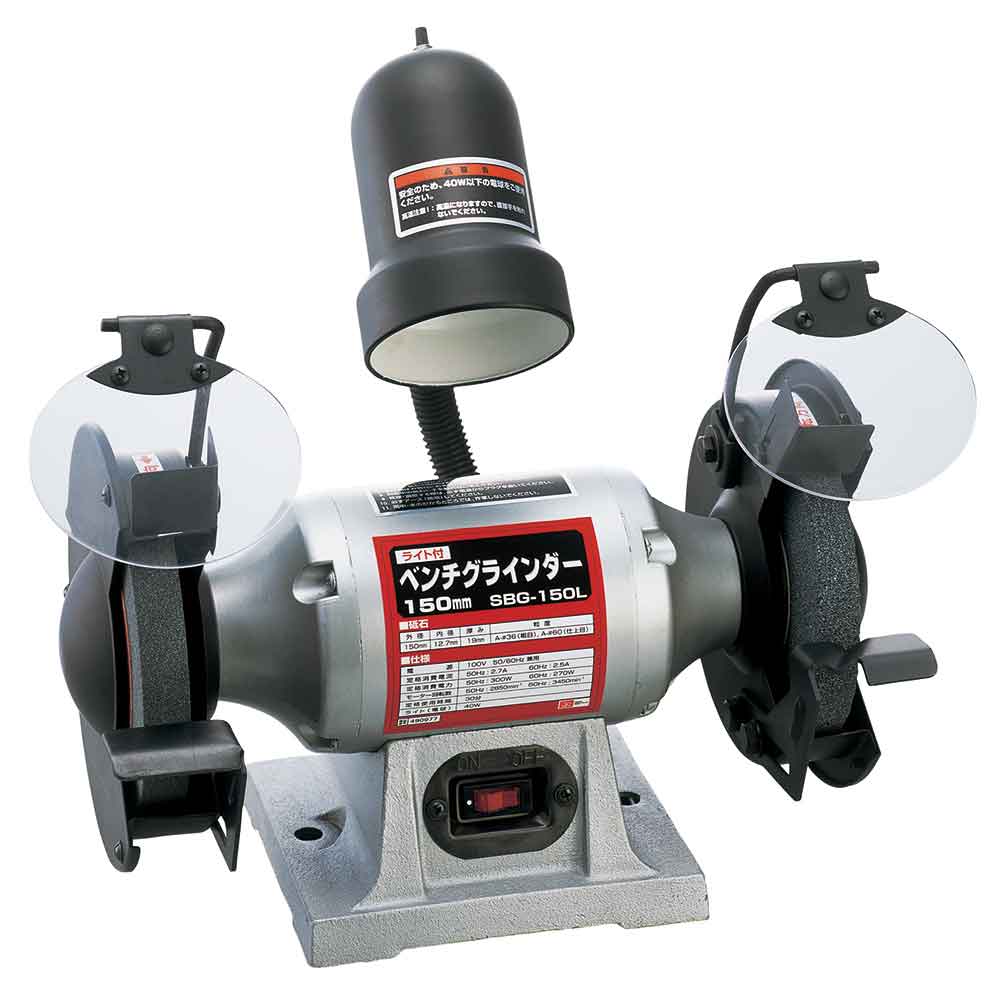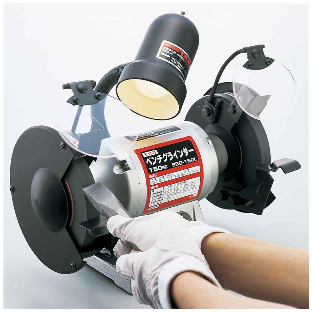 一般鋼材・工具類の研削・バリ取りや超硬合金・石材・木材の研削に最適です。 金属の研削・研磨・バリ取り。 強力300Wモーター搭載です。 低振動、静音設計です。 作業部を明るく照らすライト付です(電球は別売)。 大型アイシールド付です。 ●本体サイズ:横約360×奥行約200×高さ約220mm。 ●電源:単相交流100V(50/60Hz共用)。 ●電流(50Hz/60Hz):3.3A/3.0A。 ●消費電力(50Hz/60Hz):330W/270W。 ●作業ライト電球(別売):40Wまで。 ●回転数(50Hz/60Hz):2850回転/分・3450回転/分。 ●砥石寸法:外径150×厚さ19×内径12.7mm・砥石粒度:A36・A60。 ●コード長:2.9m。 ●セット内容:砥石(鉄工用・粒度36荒目・粒度60仕上げ目)・スパークブレーカー(調整片)×2・刃物台×2。