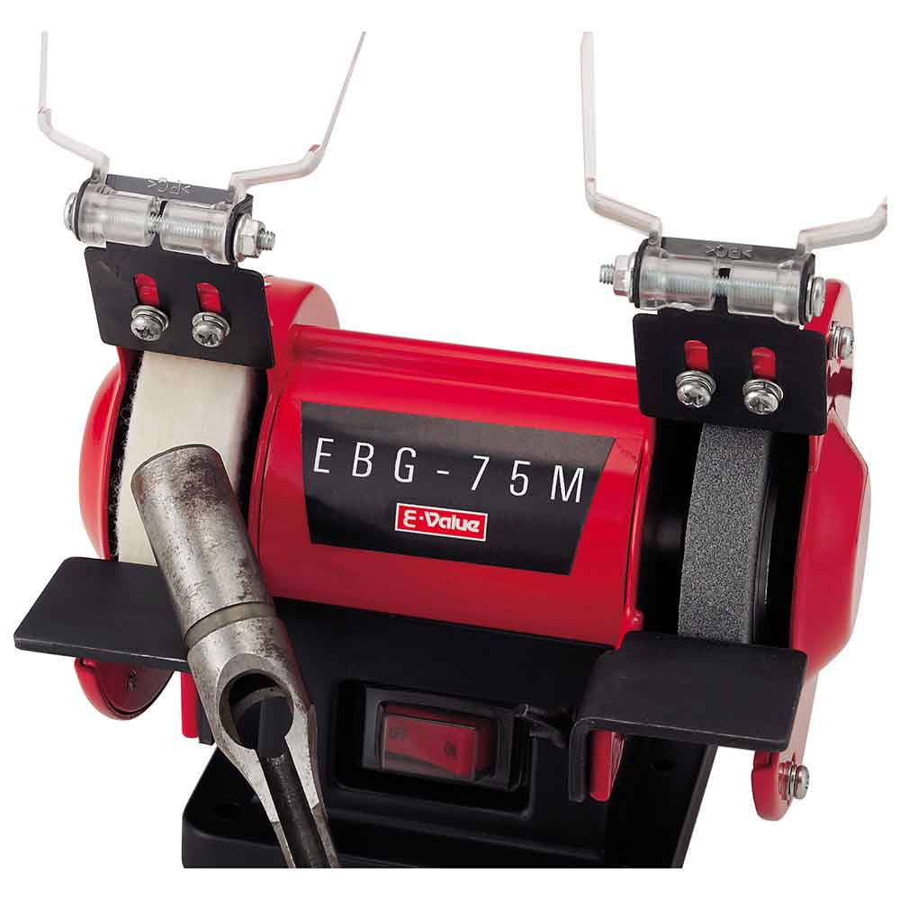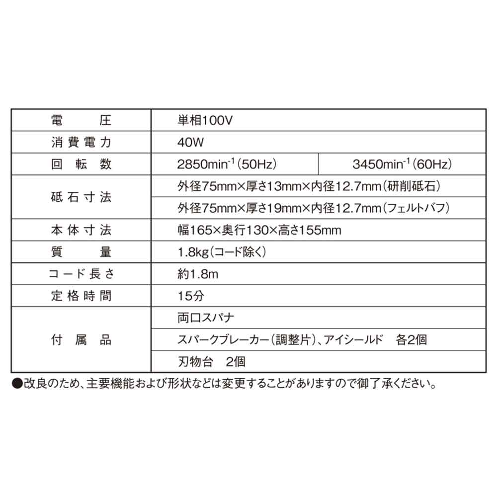 全長165mm・2.1kgの小型・軽量モデルです。 金属の研削・研磨・バリ取り。 金属・プラスチックのツヤだし・各種金属の研削・道具の手入れから工作・ホビーに用途は色々です。 砥石によるバリ取り・研削作業、バフによる研磨・ツヤ出し作業が机の上でできます。 屋内でも作業できる低振動・低騒音設計です。 ●本体サイズ:幅165×奥行130×高さ155mm。 ●電圧:単相100V・電流:0.4A。 ●消費電力:40W。 ●回転数:(50Hz)2850回転/分・(60Hz)3450回転/分。 ●研削砥石:外径75mm×厚さ13mm×内径12.7mm。 ●フェルトバフ:外径75mm×厚さ19mm×内径12.7mm。 ●コード長:1.8m。 ●定格時間:15分。 ●セット内容:両口スパナ・スパークブレーカー(調整片)×2・アイシールド×2・刃物台×2。