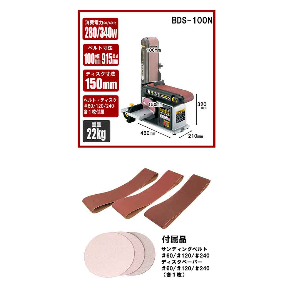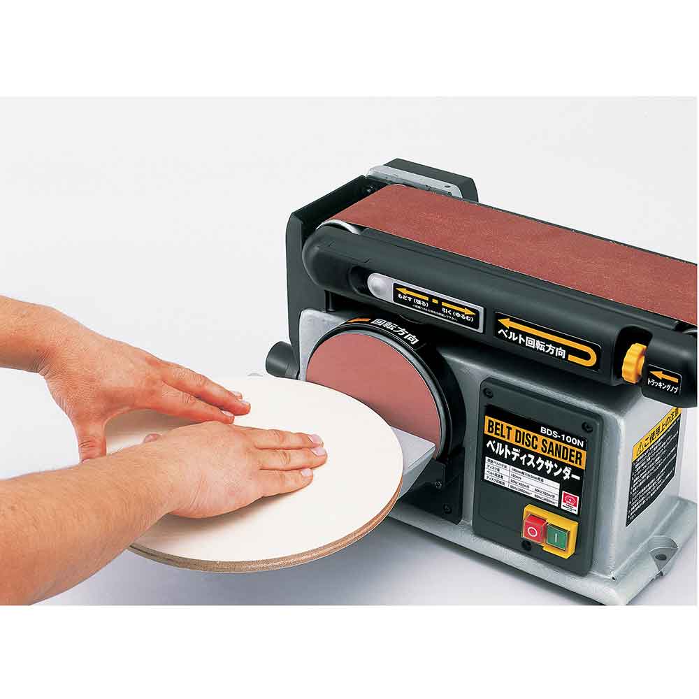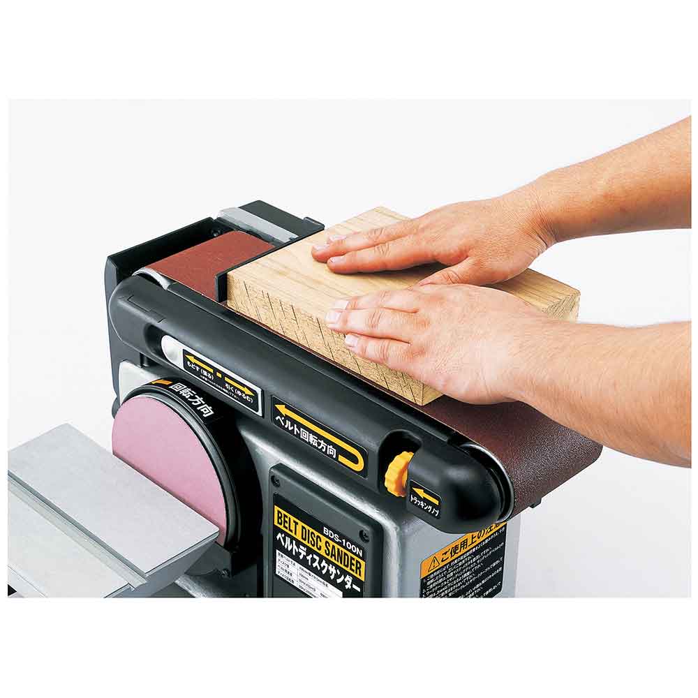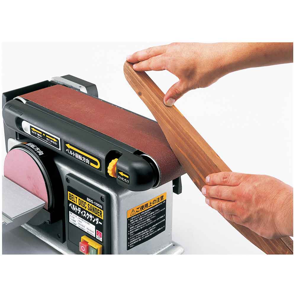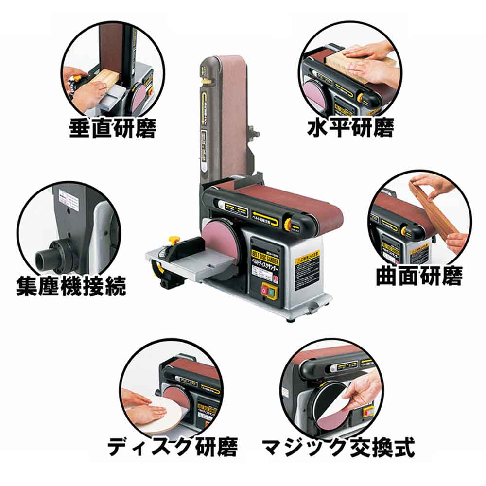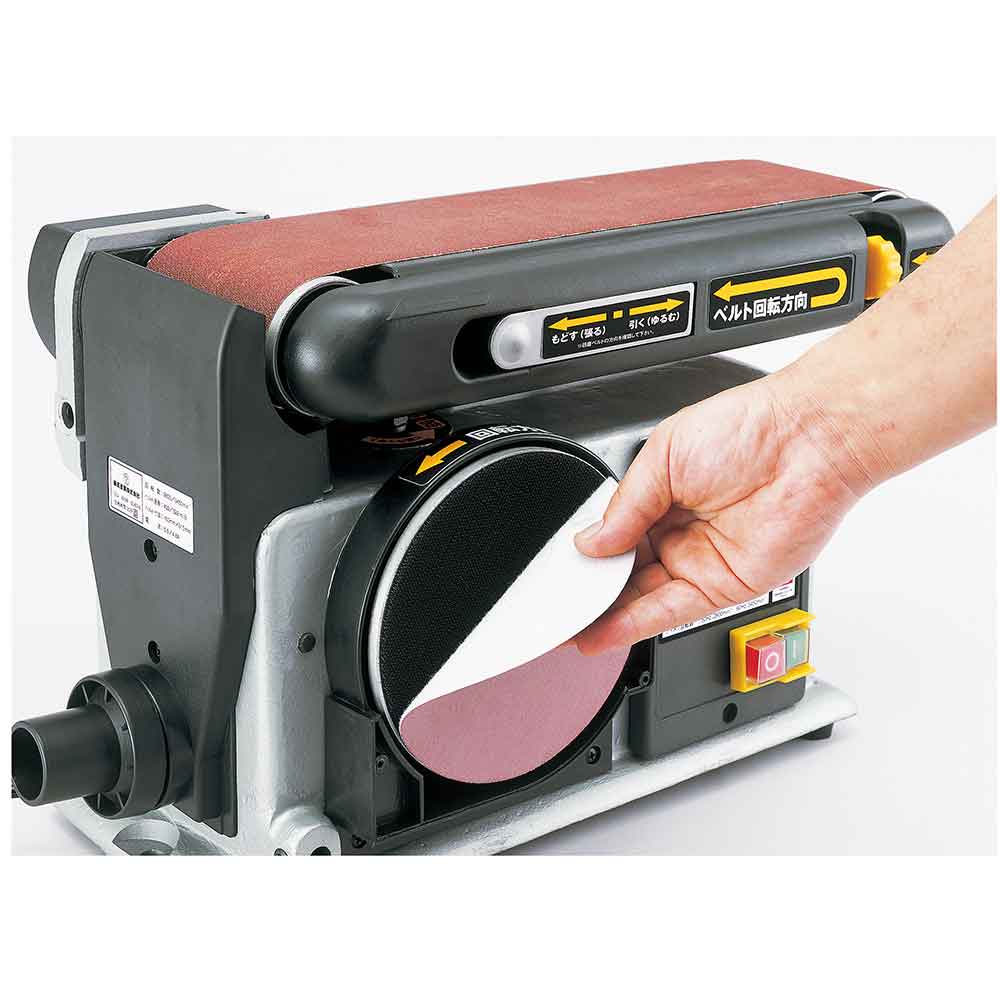 据え置き型で安定感のあるベルト&ディスクサンダーです。 ベルトサンダーとディスクサンダーの1台2役です。 大型100mm幅のベルトペーパー採用、またディスクペーパーはマジックテープ式で交換が簡単です。 ベルトサンダーの研磨台は水平・垂直どちらでも作業できます。 ディスクサンダーのテーブル角度を調整すれば木材の角度削りが可能、また、ベルトサンダーの先端部で内丸面の研磨も可能です。 ●電源:単相交流100V(50/60Hz共用)。 ●電流(50Hz/60Hz):3.4A/4.0A。 ●消費電力(50Hz/60Hz):280W/340W。 ●研磨ベルト寸法:100mm幅×915mm周長。 ●ベルト速度:50Hz:432m/分・60Hz:522m/分。 ●ディスクペーパー径:150mm。 ●ディスク回転数:50Hz:2855回転/分・60Hz:3450回転/分。 ●コード長:約2.0M。 ●付属品:サンディングベルト(♯60・120・240各1枚)・ディスクペーパー(♯60・120・240各1枚)・マイターゲージ・六角棒レンチ6mm・ワークレスト・集塵アダプター。