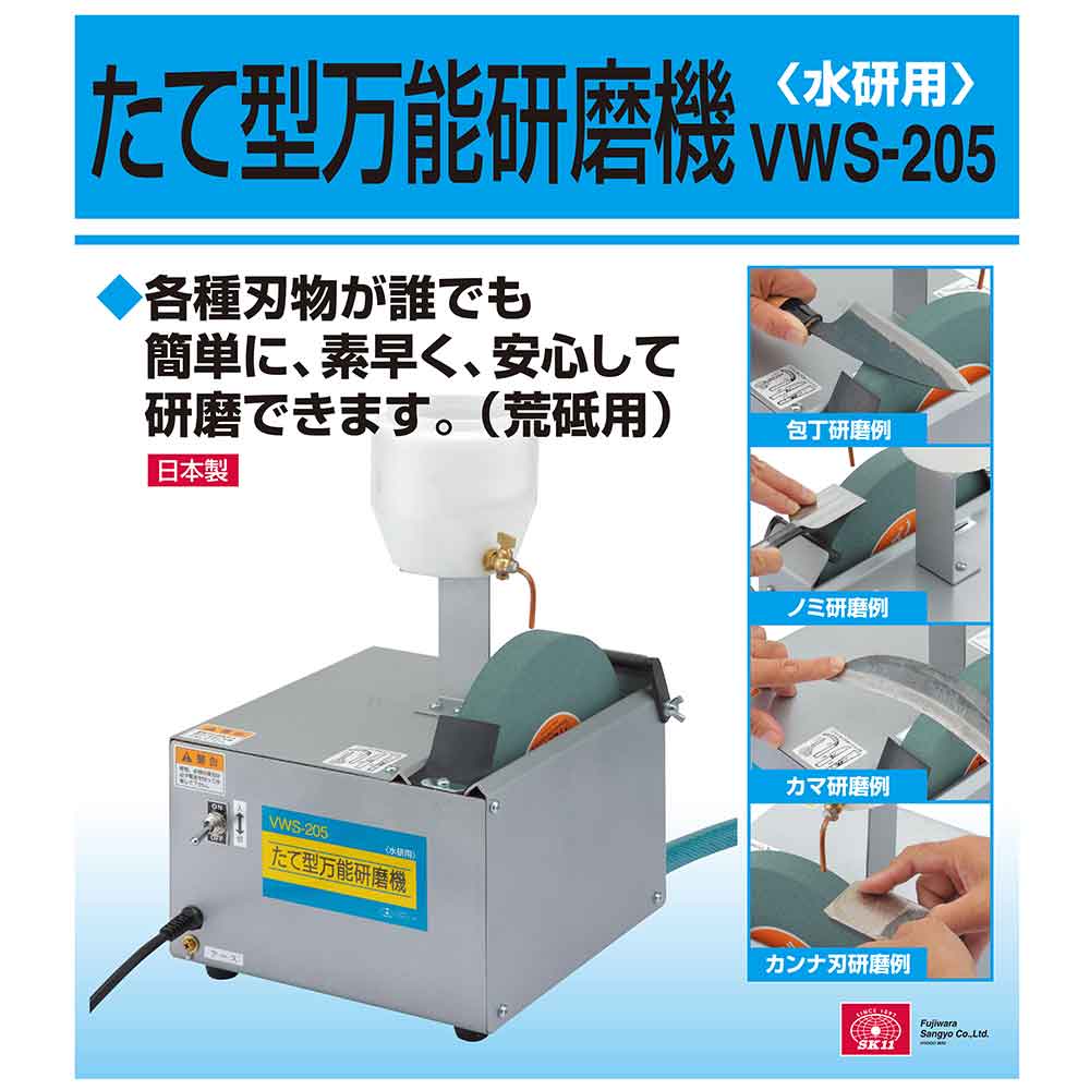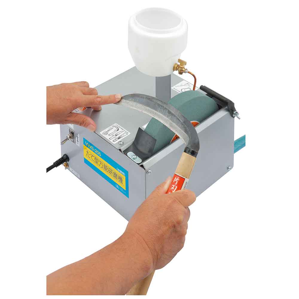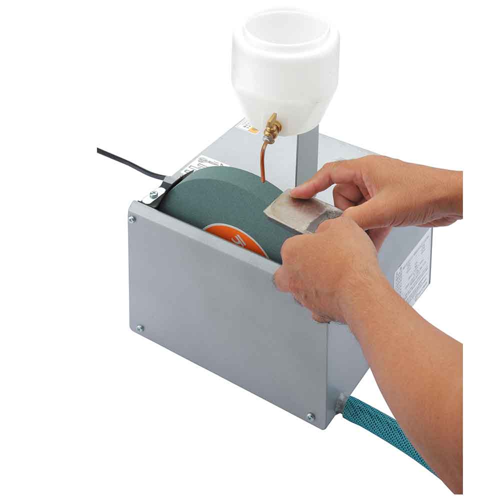 各種家庭用刃物・園芸用刃物の水研ぎ研磨機、水砥ぎ式のため刃物の焼き戻りがありません。 カンナ刃・ノミ・ハサミ・包丁・カマ・ナタ等の小型刃物の荒・中研磨。 低速ギアーモーター搭載で連続運転可能です。 粒度GC120の荒砥石が標準でついており、刃物の刃こぼれの修正に最適です。 砥石が両方向より使用できるため、刃物に合わせて砥石へ当てる方向が選べます。 別売品で、中320・仕上600の砥石もあります。 ●電源:100V単相交流50/60Hz共用。 ●電流:50Hz:0.87A・60Hz:0.74A。 ●回転数:50Hz:420回転/分・60Hz:520回転/分。 ●消費電力:40W。 ●定格時間:連続、コード長:2.3m。 ●本体サイズ:250×270×390mm・質量:約11kg。 ●砥石寸法:205×25×19mm、粒度:GC120。 ●標準付属品:水タンク、砥石GC120(荒研)。 ●付属部品:砥石取り外し用スパナ。