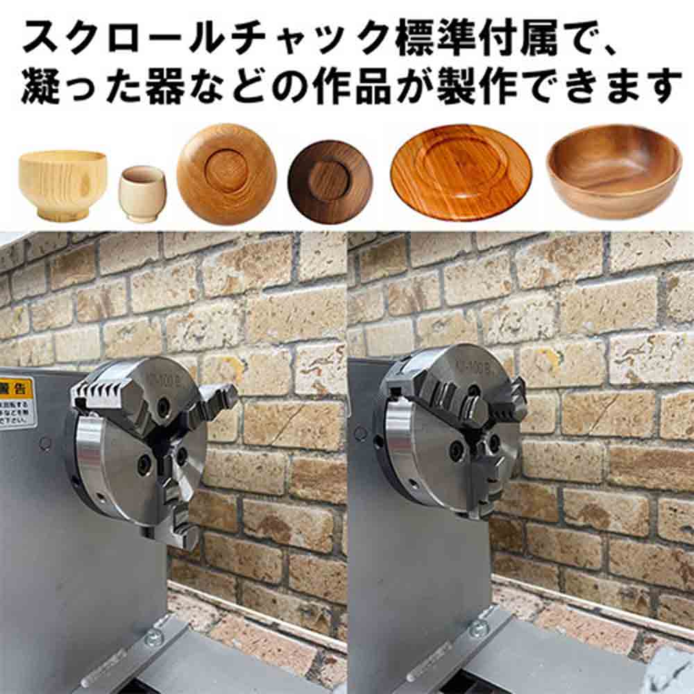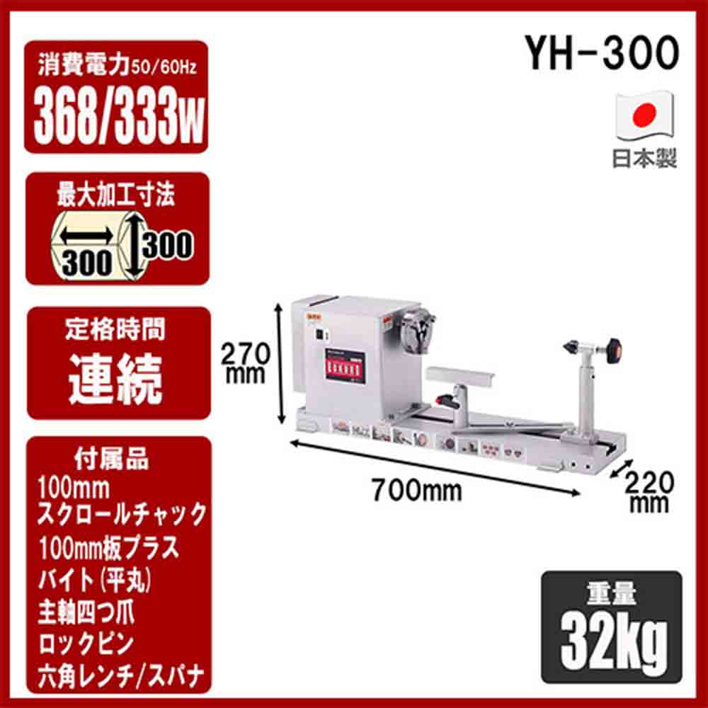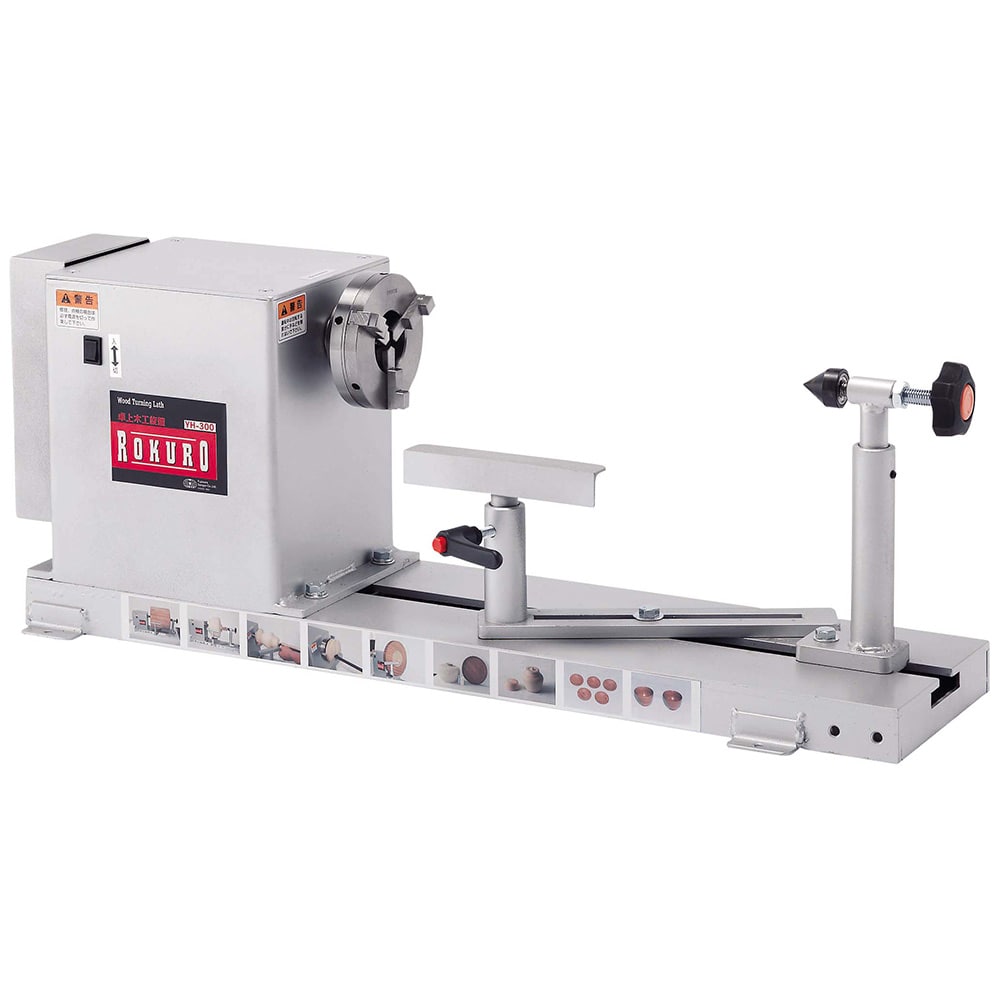 中級・上級者にも満足の本格派木工旋盤です。 各種木・竹の加工茶托・菓子器花瓶・うき・サラダボール・小物入れなどの加工。 棒、筒状の加工はもちろん、付属の板プラスやスクロールチャックを使ってお椀やお盆の製作も可能です。 切れ味に優れた替刃式ハイスバイトが標準付属です(平丸1本)。 別売の延長ベッド300mmを継ぎ足せば最大長さ600mmまで加工できます。 ●電源:単相交流100V(50/60Hz共用)。 ●電流(50Hz/60Hz):5.5A・4.8A。 ●消費電力:(50Hz)368W・(60Hz)333W。 ●定格時間:連続。 ●主軸回転数:(高速)50Hz:1060回転/分・60Hz:1280回転/分。 ●主軸回転数:2段ベルト掛換(低速)50Hz:547回転/分・60Hz:660回転/分。 ●最大加工寸法:径300mm・長さ300mm。 ●コード長:約2.3M。 ●セット内容:100mm板プラス・六角棒レンチ・スパナ2本・主軸四ツ爪・ロックピン・100mmスクロールチャック(Y-2101)・替刃式手バイト(Y-1211)・シャフトロックピン。