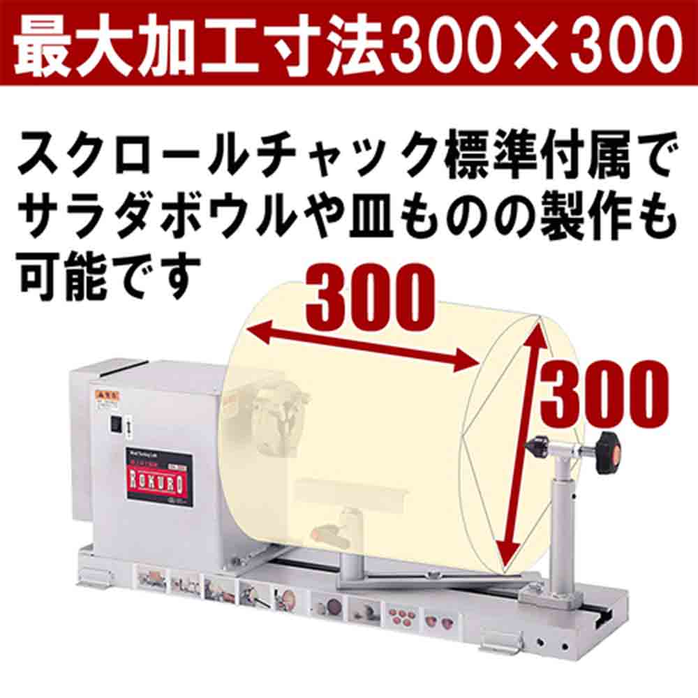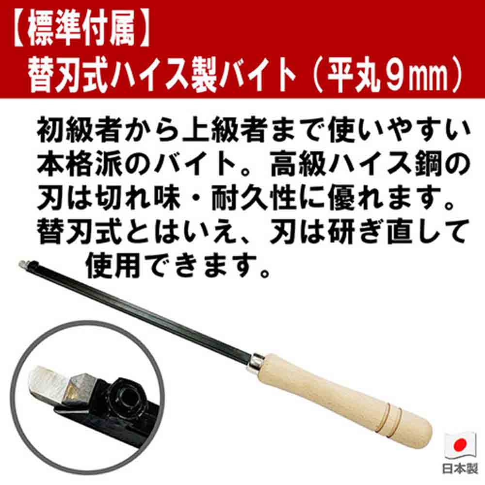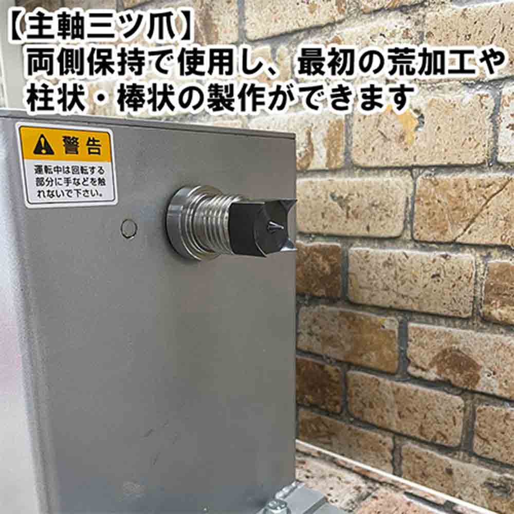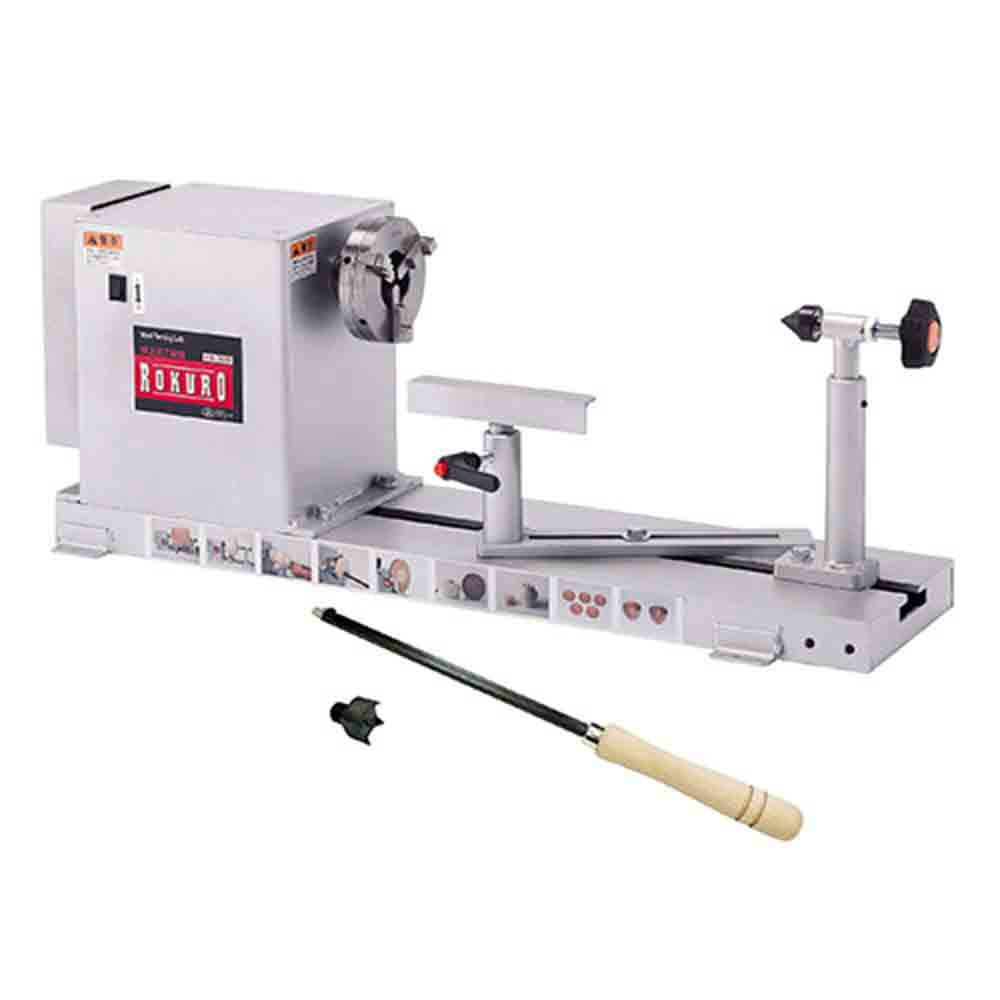 中級・上級者にも満足の本格派木工旋盤です。 各種木・竹の加工茶托・菓子器花瓶・うき・サラダボール・小物入れなどの加工。 棒、筒状の加工はもちろん、付属の板プラスやスクロールチャックを使ってお椀やお盆の製作も可能です。 切れ味に優れた替刃式ハイスバイトが標準付属です(平丸1本)。 別売の延長ベッド300mmを継ぎ足せば最大長さ600mmまで加工できます。 ●電源:単相交流100V(50/60Hz共用)。 ●電流(50Hz/60Hz):5.5A・4.8A。 ●消費電力:(50Hz)368W・(60Hz)333W。 ●定格時間:連続。 ●主軸回転数:(高速)50Hz:1060回転/分・60Hz:1280回転/分。 ●主軸回転数:2段ベルト掛換(低速)50Hz:547回転/分・60Hz:660回転/分。 ●最大加工寸法:径300mm・長さ300mm。 ●コード長:約2.3M。 ●セット内容:100mm板プラス・六角棒レンチ・スパナ2本・主軸四ツ爪・ロックピン・100mmスクロールチャック(Y-2101)・替刃式手バイト(Y-1211)・シャフトロックピン。