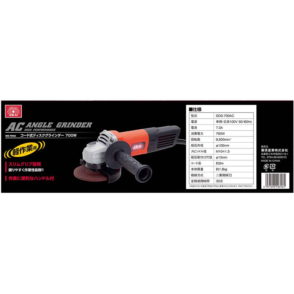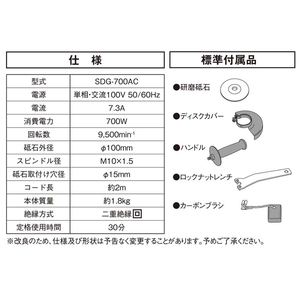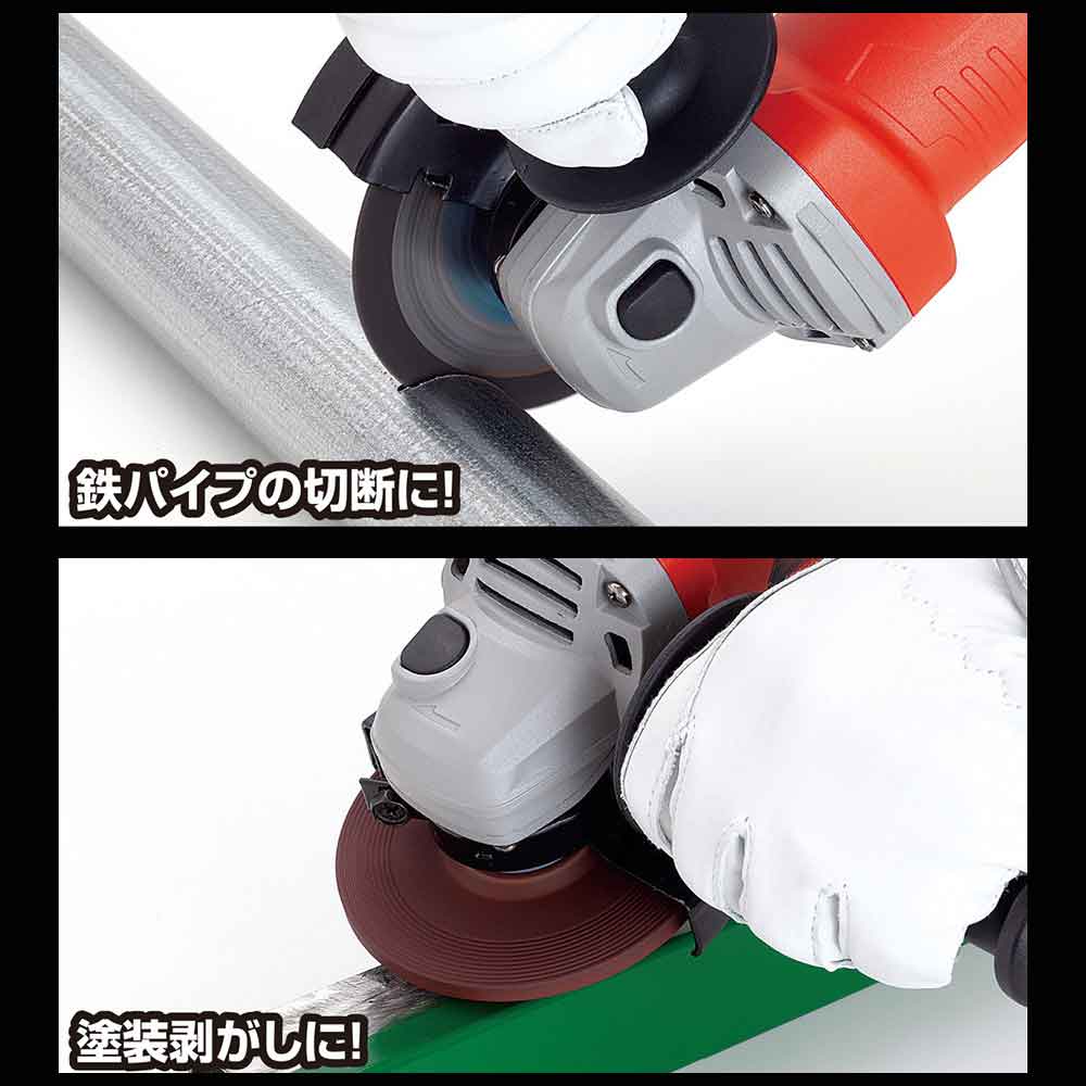 軽作業用のディスクグラインダーです。 金属の切断、木材・金属の研磨、サビ落とし、塗装落とし作業。 金属の切断、研磨作業、木材の研磨作業に最適です。 握りやすく、疲れにくい56mm細径グリップです。 しっかりと安定して作業ができるサンドハンドル付きです。 鋭利な切削くずが侵入してもモーターが傷付きにくいコーティングモーターを採用しています。 低温下でも柔軟性を維持し、取り回しの良いソフトコードを採用しています。 ●電源:単相交流100V50/60Hz。 ●電流:7.3A。 ●消費電力:700W。 ●回転数:9500min-1。 ●砥石外径:φ100mm。 ●スピンドル径:M10x1.5。 ●砥石取付穴径:15mm。 ●コード長:2m。 ●付属品:研削砥石・ロックナットレンチ・サイドハンドル・予備カーボンブラシ。