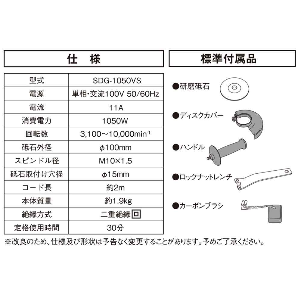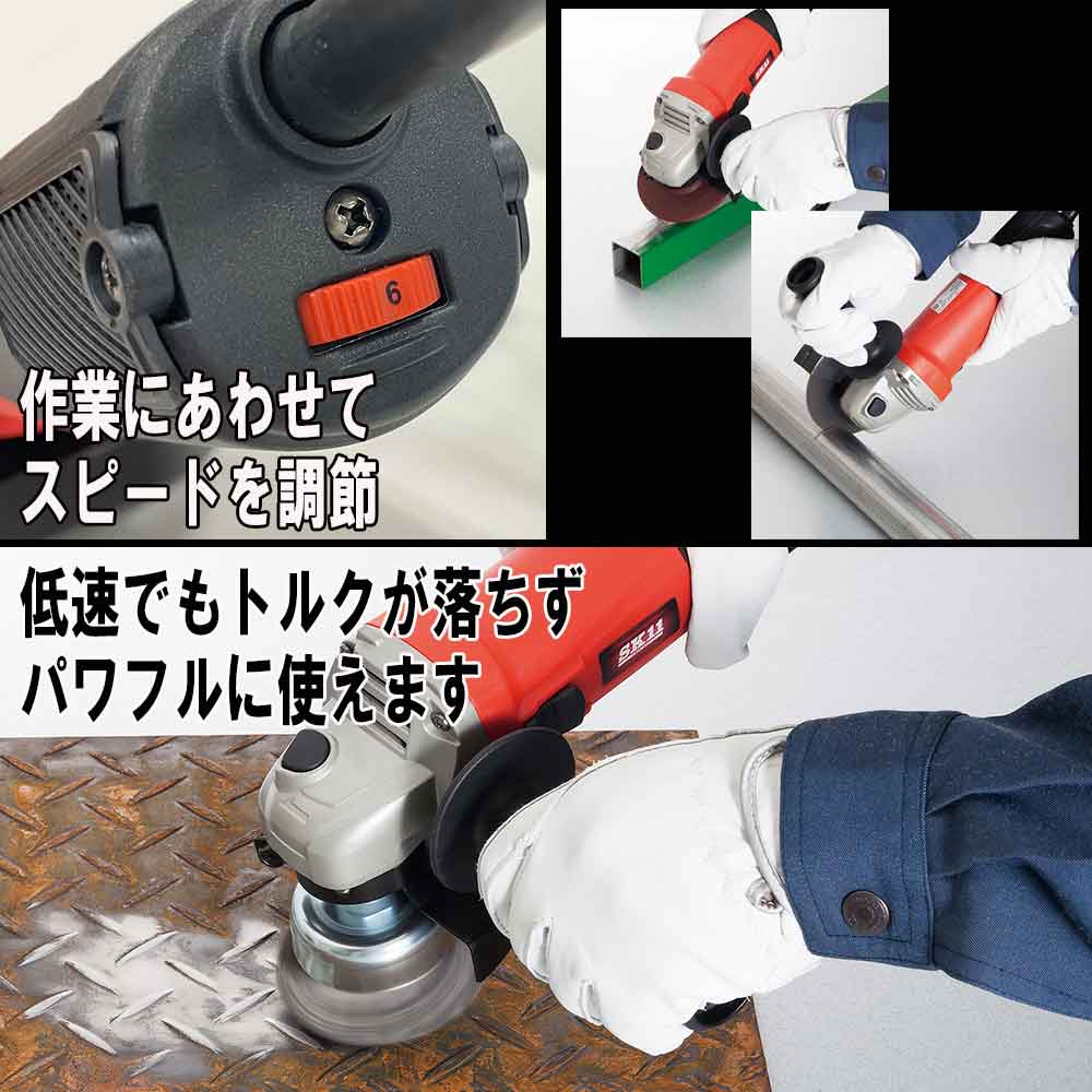 変速機能付きのディスクグラインダーです。 金属の切断・研削・研磨作業。 変速機能付きのディスクグラインダーです。 作業に便利なハンドル付きです。 作業に合わせてスピードを設定できます。 ソフトスタート機能付きです。 低速でも高トルクの性能です。 ●電源:AC100V50/60Hz。 ●消費電力:1050W。 ●回転数:3100~10000min-1。 ●スピンドル径:M10×1.5。 ●砥石取付け穴径:直径15mm。 ●本体質量:約1.9kg。 ●付属品:ハンドル・研削砥石・ロックナットレンチ・カーボンブラシ。