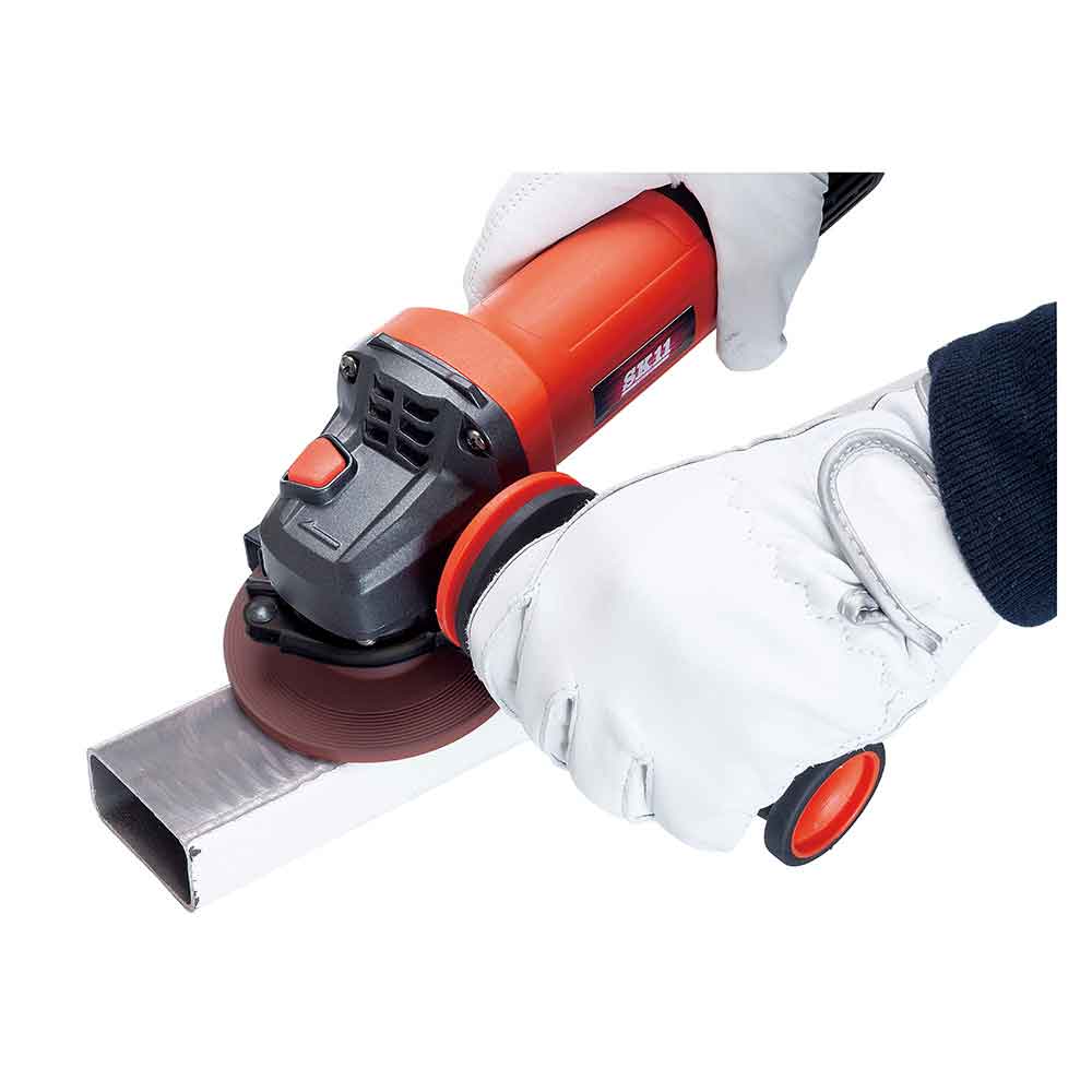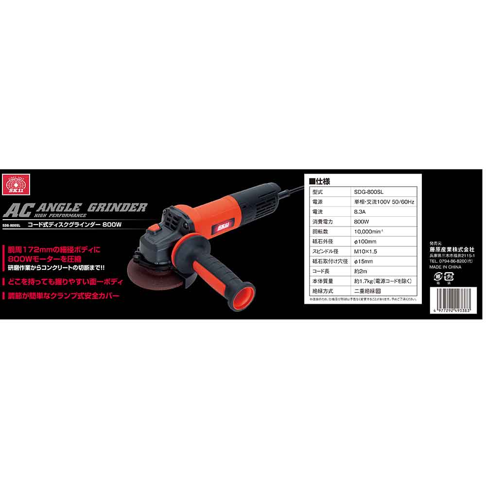 800W強力モーターで握りやすい細径のディスクグラインダーです。 木材、金属、コンクリートの切断、研磨、切断作業。 800W強力モーターです。 握り幅52mmの細径ボディです(胴周172mm)。 凹凸がなく握りやすい面一ボディ形状で、脱着、調節が簡単なクランプ式安全カバー採用し、握りやすくて、丈夫な大型サイドハンドルです。 各種金属の切断、研磨、木材の研磨作業、コンクリートの研磨、筋付け、切断作業に最適です(それぞれ市販の専用先端工具が別途必要です)。 ●電源:単相交流100V50/60Hz、消費電力:800W、電流:8.3A。 ●無負荷回転数:10000min-1。 ●砥石外径:100mm、スピンドル径:M10x1.5P、砥石取付穴径:15mm、。 ●本体質量:約1.7kg、本体寸法:約295幅x100高x120奥行mm、電源コード長:約2m。 ●付属品:予備カーボンブラシ(2個1組)・サイドハンドル・金属研削用砥石・ロックナットレンチ・安全カバー。
