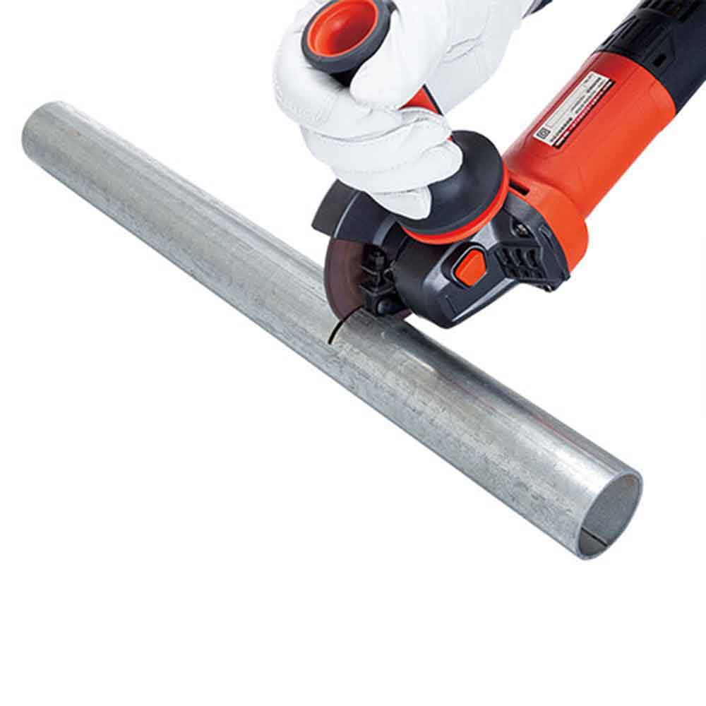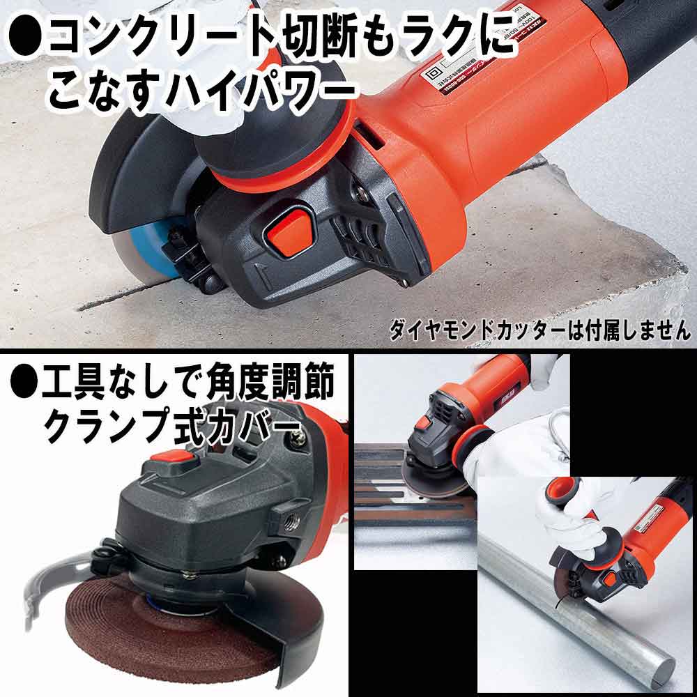 ご使用に際しては必ず取扱説明書をよくお読みのうえ、操作方法、安全に関する注意事項について十分に理解したうえで作業してください。 著しく回転が低下するような過度な荷重で材料に押し付けて作業をされますと、切断の効率が落ちるだけでなく、本体が焼損する恐れがあります。また、キックバックによる事故の原因にもなりますので、先端工具の回転を生かすように、切り(削り)進むペースに合わせて適度に押し付けながら作業してください。 本製品に付属の砥石は金属研削用の研削(オフセット)砥石です。金属以外の研磨や切断作業にはそれぞれの材料や作業に対応した、市販の砥石や刃物をご購入ください。また先端工具によってはそれぞれ専用のカバーやアダプターリング、アタッチメントが必要な場合がありますので、それぞれの先端工具の使用方法、注意事項をご確認のうえ合わせてご購入してください。