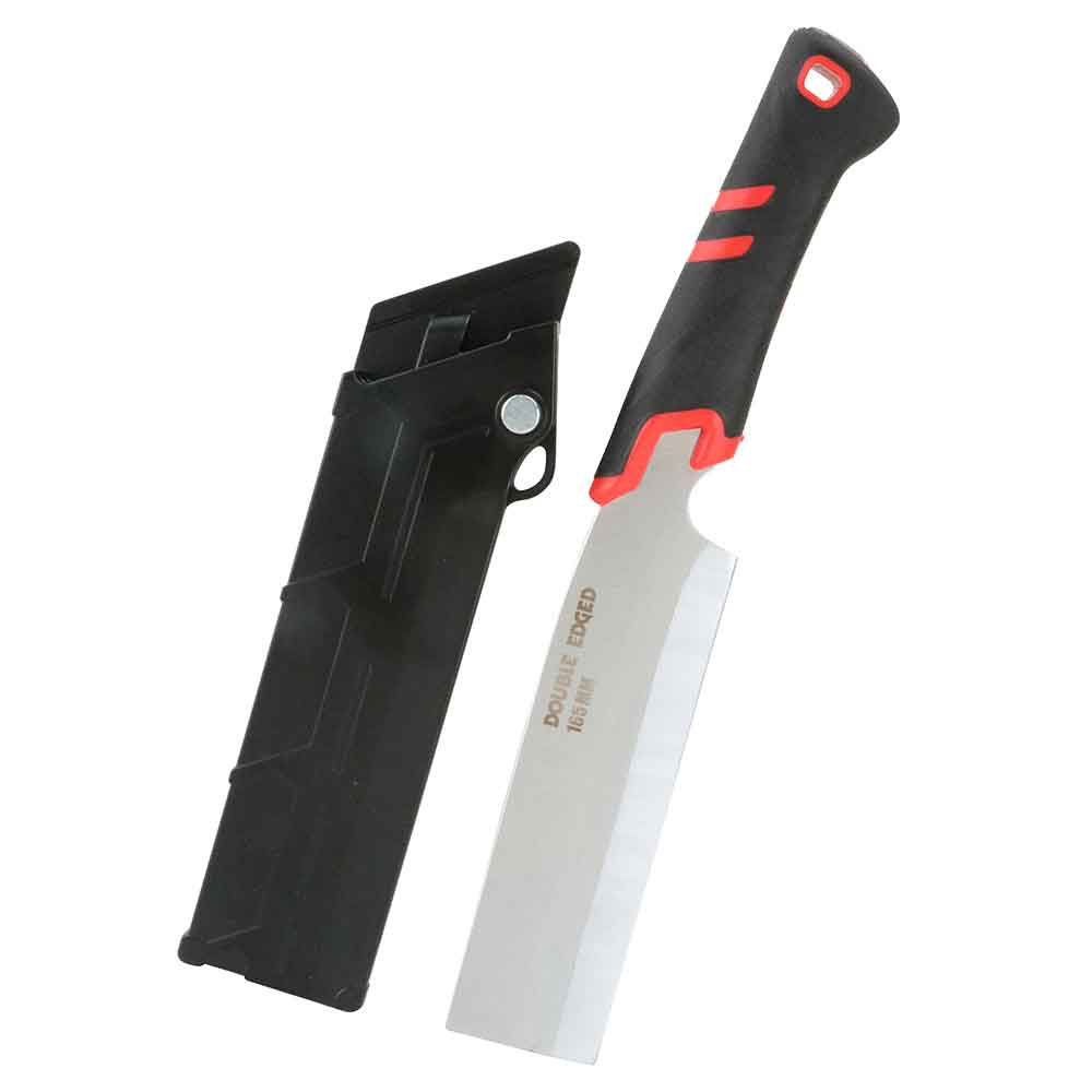 枝払い、薪割り作業におすすめの両刃鉈です。 枝払い、薪割り作業に。 ブレードがハンドルの末端まで貫通しているフルタング仕様です。 ワンタッチリリース機能で、従来のケースと比べ簡単・安全・スピーディに脱着が行なえます。 TPRグリップなので、滑りにくいです。 しっかり握れる事で正確に扱える為、作業性の向上と事故を防ぎます。 ストラップホール付が付いています。 ●刃タイプ:両刃。 ●板厚:約6.0mm。 ●ハードクロームメッキ処理。 ●鞘付。