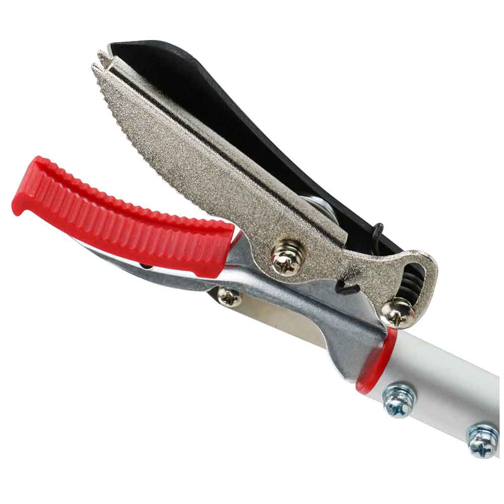 あと少し届かない箇所の剪定作業に便利です。 剪定・整枝作業。 全長47cmで抜群の取り回しで、剪定鋏では届かない少し高い所や、奥まった場所の剪定作業に便利です。 アンビル刃タイプで切れ味抜群です。 ハサミで切って掴みます。 簡単・安心ロック付きです。 ●アンビル刃タイプ。 ●全長:470mm。 ●重さ:約300g。