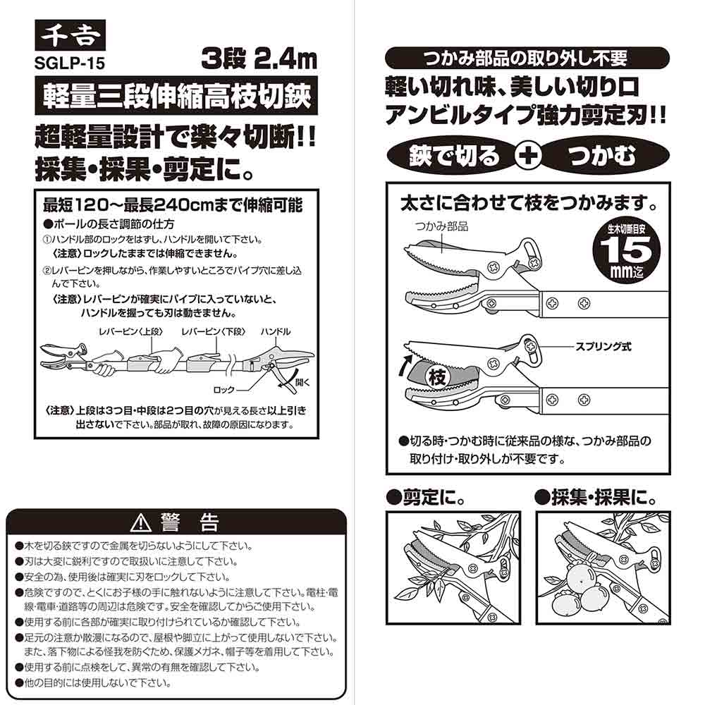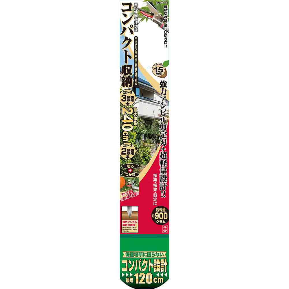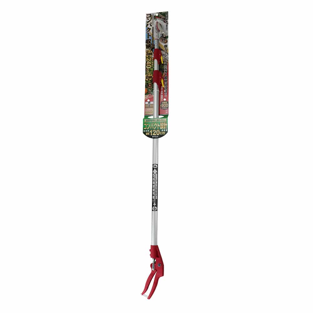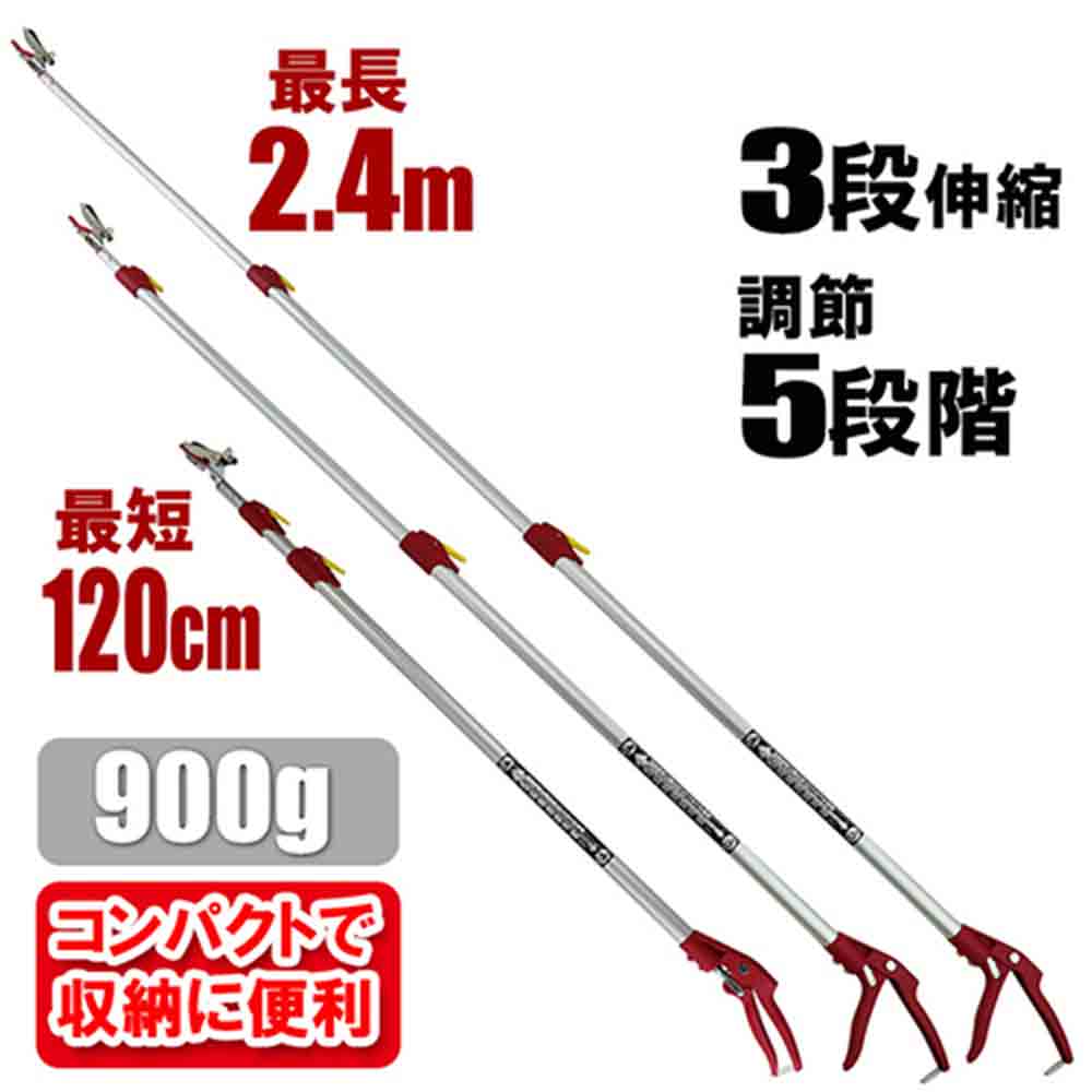 3段タイプの収納場所に困らない、コンパクト高枝切鋏です。 剪定・整枝作業。 軽量タイプの3段伸縮高枝切鋏です。 スプリングキャッチ機能で「切る」「つかむ」が、部品の付け外し無しで行えます。 アンビルタイプ刃採用で15mmまでの生木を強力に切断可能です。 ●タイプ:3段伸縮。 ●アンビル刃。 ●最短時:1200mm。 ●最長時:2400mm。