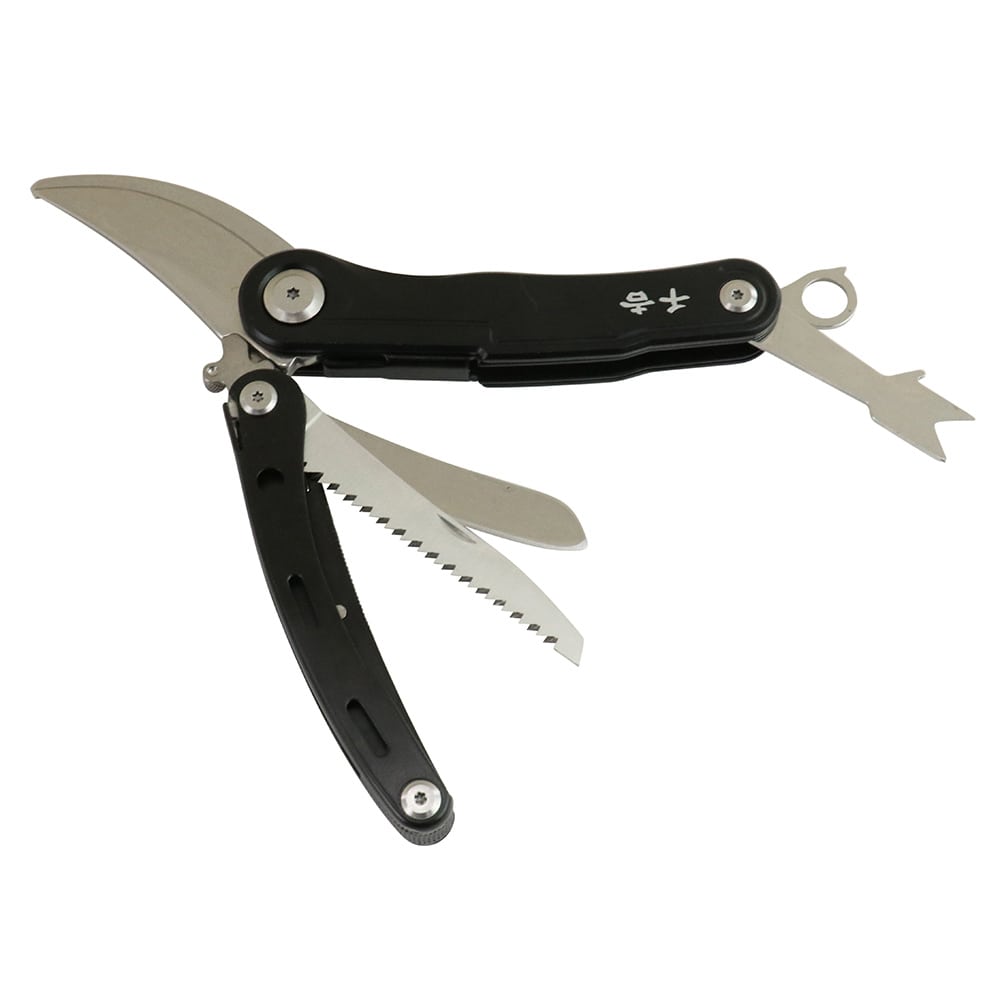 剪定鋏、鋸、ナイフ、樹皮はがし、キーリングの5つの機能を持った、多機能な剪定鋏です。 園芸作業、アウトドア。 剪定鋏、鋸、ナイフ、樹皮はがし、キーリングの5つの機能です。 携帯に便利な折りたたみ式で、持ち運びに便利です。 刃はサビに強いステンレス製です。 ●機能:剪定鋏・鋸・ナイフ・キーリング・樹皮剥がし。