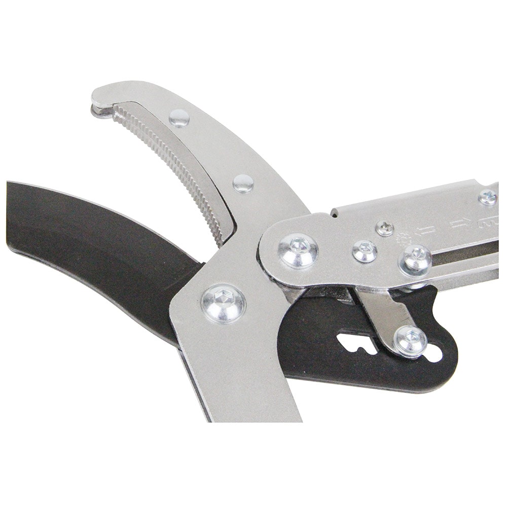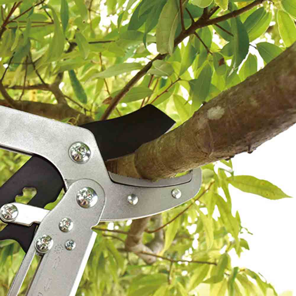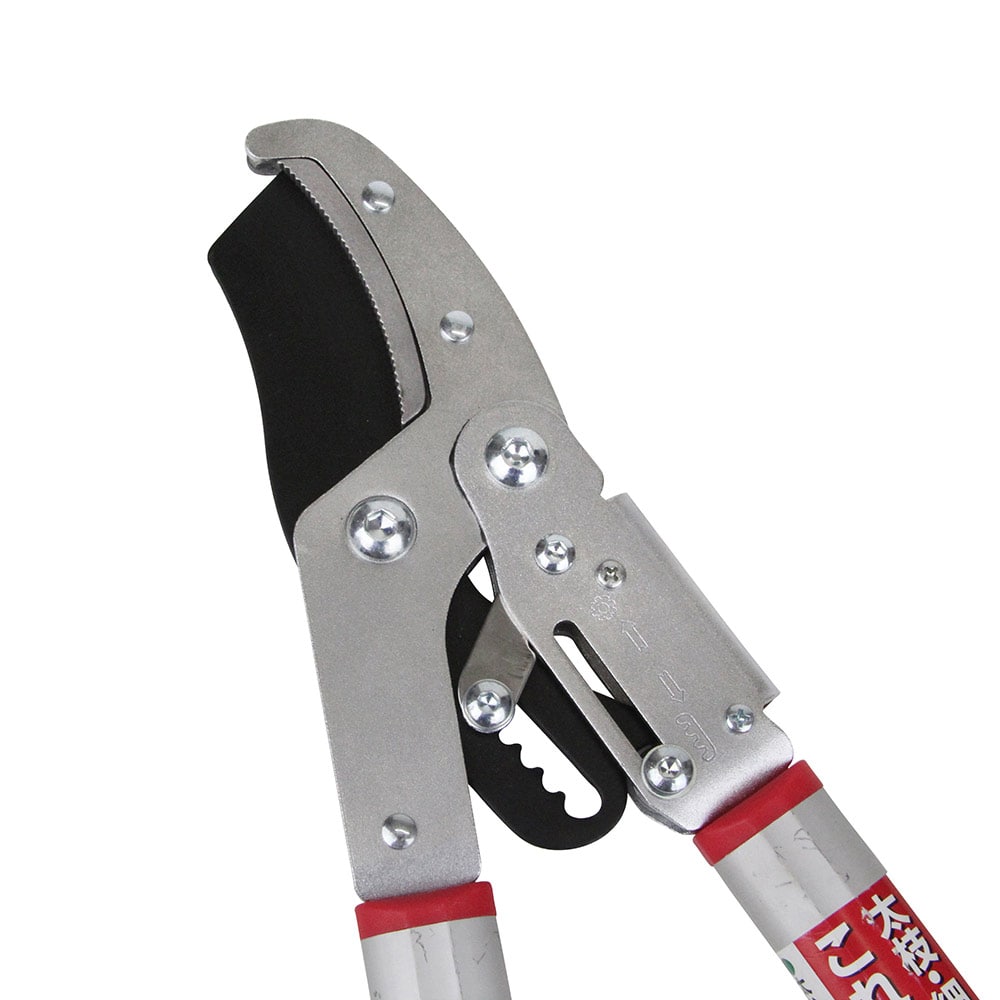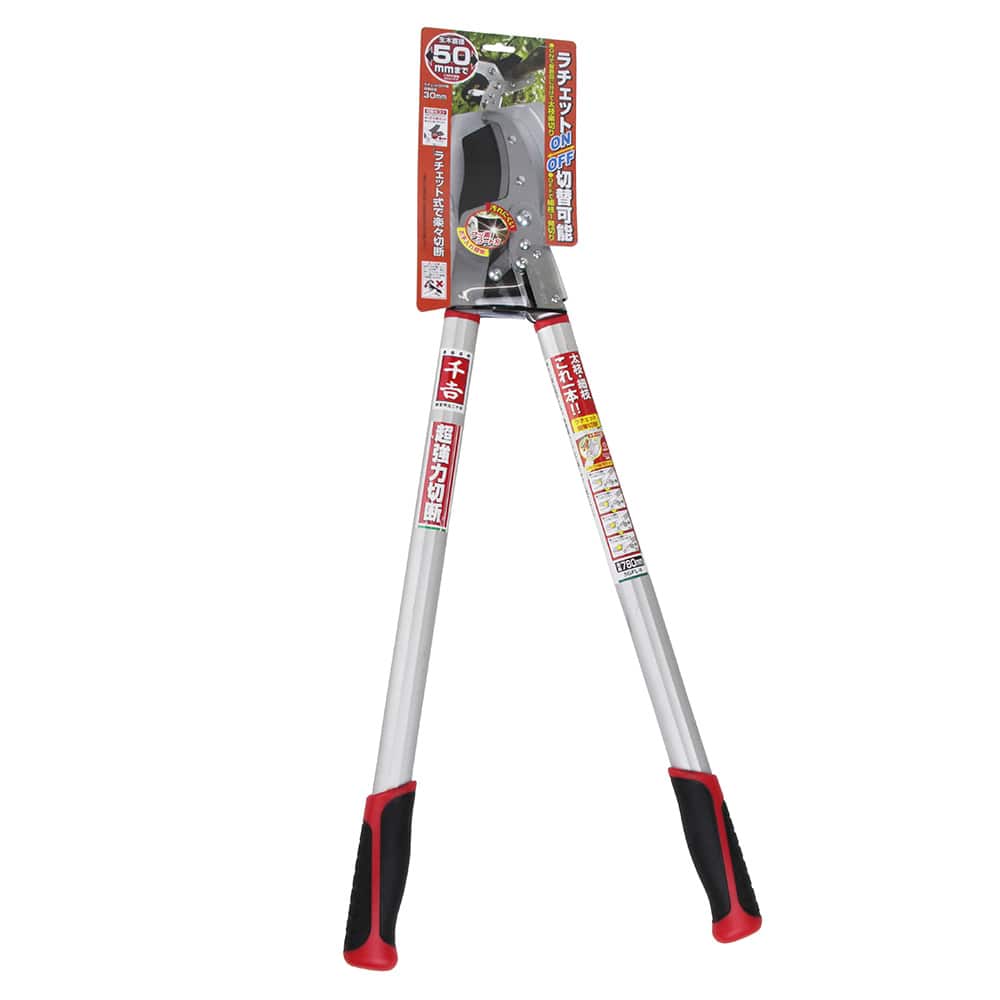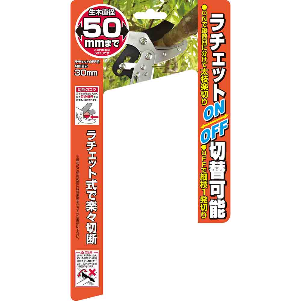 ラチェット機能の有無を切り替えられる、切替式の太枝切鋏です。 生木の剪定、整枝作業。 ワンタッチでラチェット機能のオンのオフが切替られます。 太い枝の切断、細い枝の連続切断等、シーンに合わせて使い分けが可能です。 フッ素コート刃でお手入れ簡単です。 ●生木切断目安:50mm(ラチェットON時)。 ●生木切断目安:35mm(ラチェットOFF時)。 ●刃部:フッ素コート。 ●刃部硬度:HRC53±2。