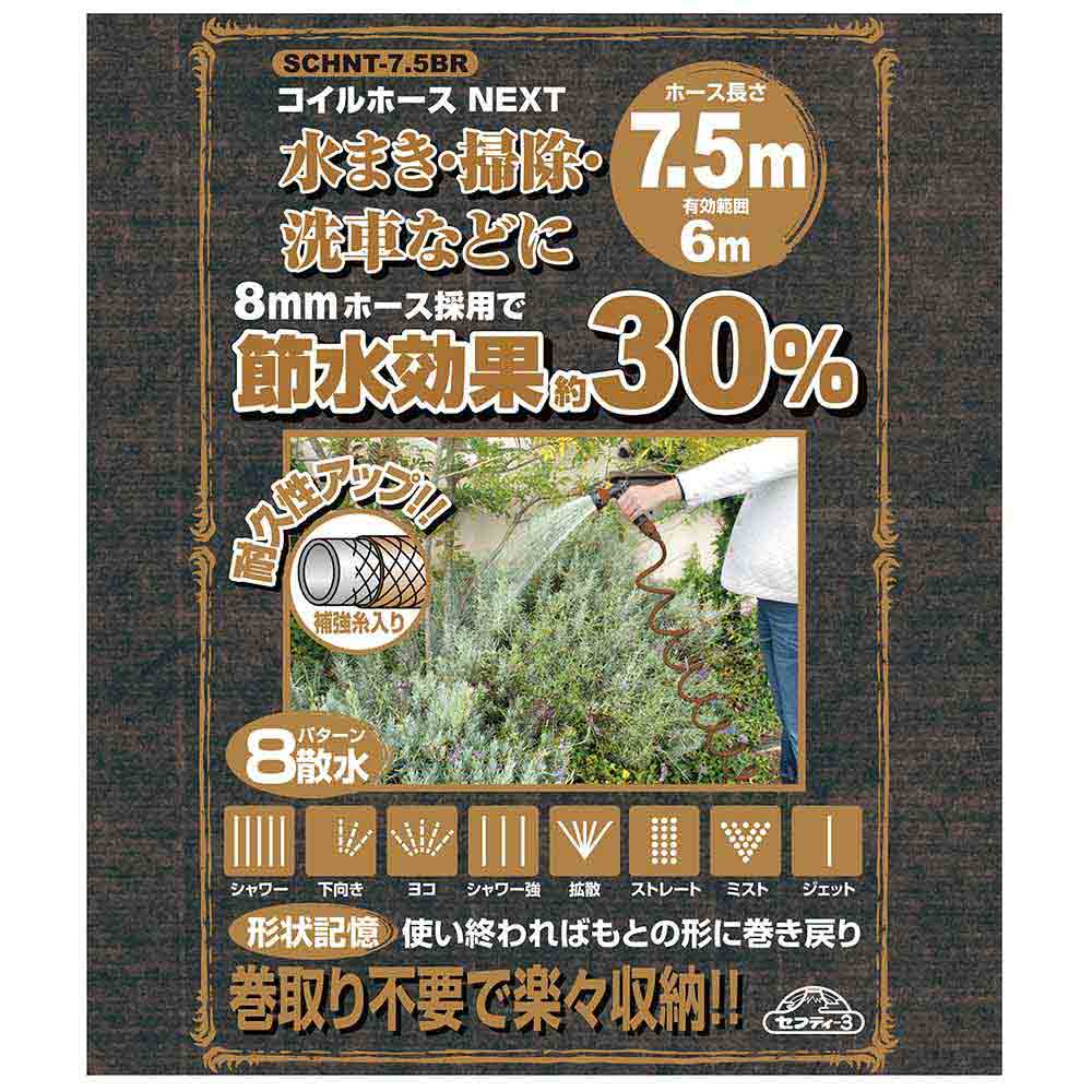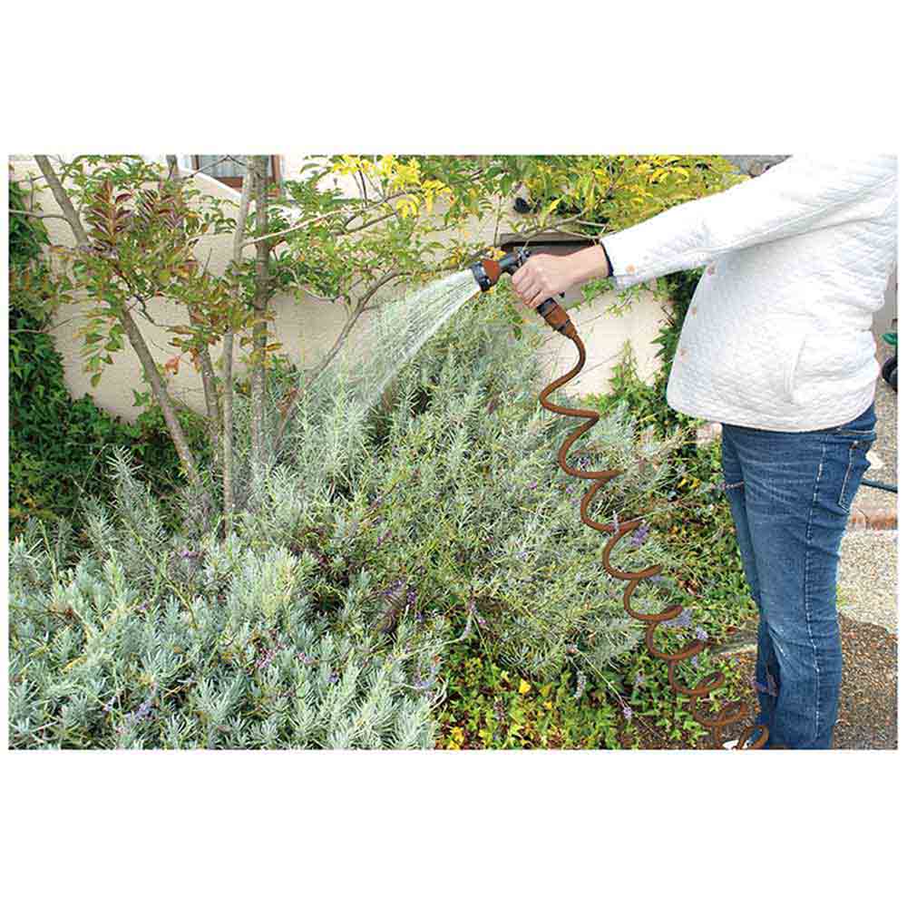 巻きとり不要なコイルタイプなので、楽に収納が出来ます。 水まき・掃除・洗車など多用途対応の散水コイルホース。 8mmホース採用で節水効果が約30%です(当社従来比)。 コイルタイプなので、使い終わればすぐ元に戻ります。 糸入りホース採用で耐久性をアップさせています。 水形は8パターンで最適な水まきが可能です。 材質はEVAを採用、従来のPUに比べ軽量で丈夫です。 ●ホース長さ:7.5m、有効範囲:6m。 ●ホース内径:8mm。 ●散水ノズル:8パターン。 ●切替タイプ:シャワー・下向き・ヨコ・シャワー強・拡散・ストレート・ミスト・ジェット。