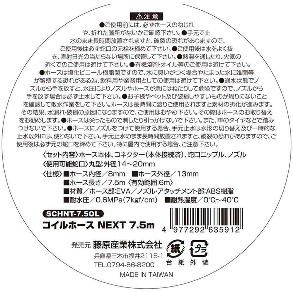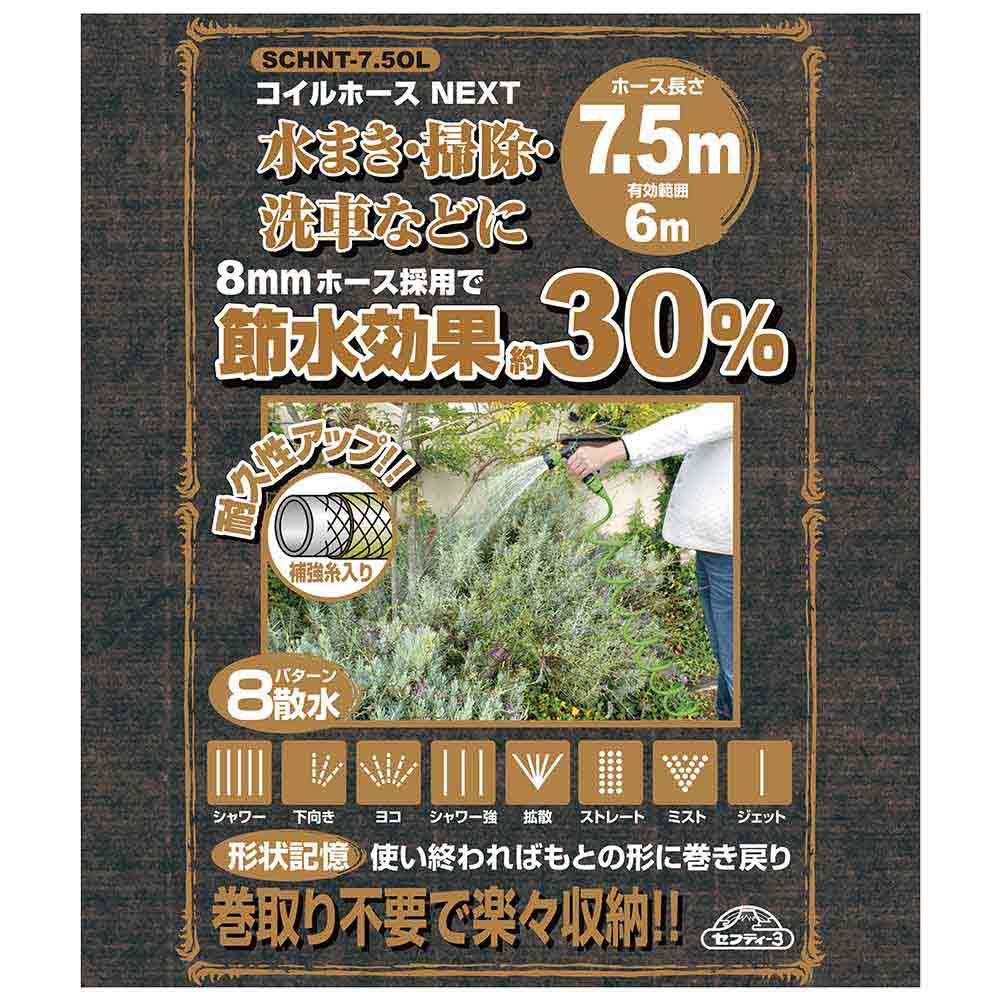 巻きとり不要なコイルタイプなので、楽に収納が出来ます。 水まき・掃除・洗車など多用途対応の散水コイルホース。 8mmホース採用で節水効果が約30%です(当社従来比)。 コイルタイプなので、使い終わればすぐ元に戻ります。 糸入りホース採用で耐久性をアップさせています。 水形は8パターンで最適な水まきが可能です。 材質はEVAを採用、従来のPUに比べ軽量で丈夫です。 ●ホース長さ:7.5m、有効範囲:6m。 ●ホース内径:8mm。 ●散水ノズル:8パターン。 ●切替タイプ:シャワー・下向き・ヨコ・シャワー強・拡散・ストレート・ミスト・ジェット。