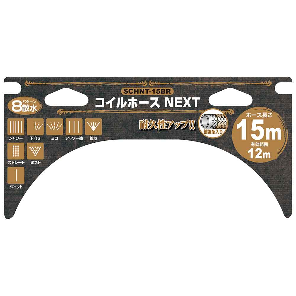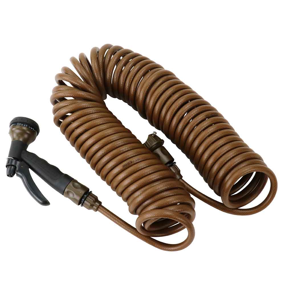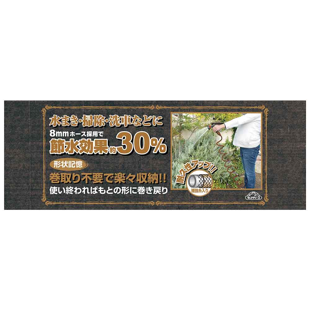 巻きとり不要なコイルタイプなので、楽に収納が出来ます。 水まき・掃除・洗車など多用途対応の散水コイルホース。 8mmホース採用で節水効果が約30%です(当社従来比)。 コイルタイプなので、使い終わればすぐ元に戻ります。 糸入りホース採用で耐久性をアップさせています。 水形は8パターンで最適な水まきが可能です。 材質はEVAを採用、従来のPUに比べ軽量で丈夫です。 ●ホース長さ:15m、有効範囲:12m。 ●ホース内径:8mm。 ●散水ノズル:8パターン。 ●切替タイプ:シャワー・下向き・ヨコ・シャワー強・拡散・ストレート・ミスト・ジェット。