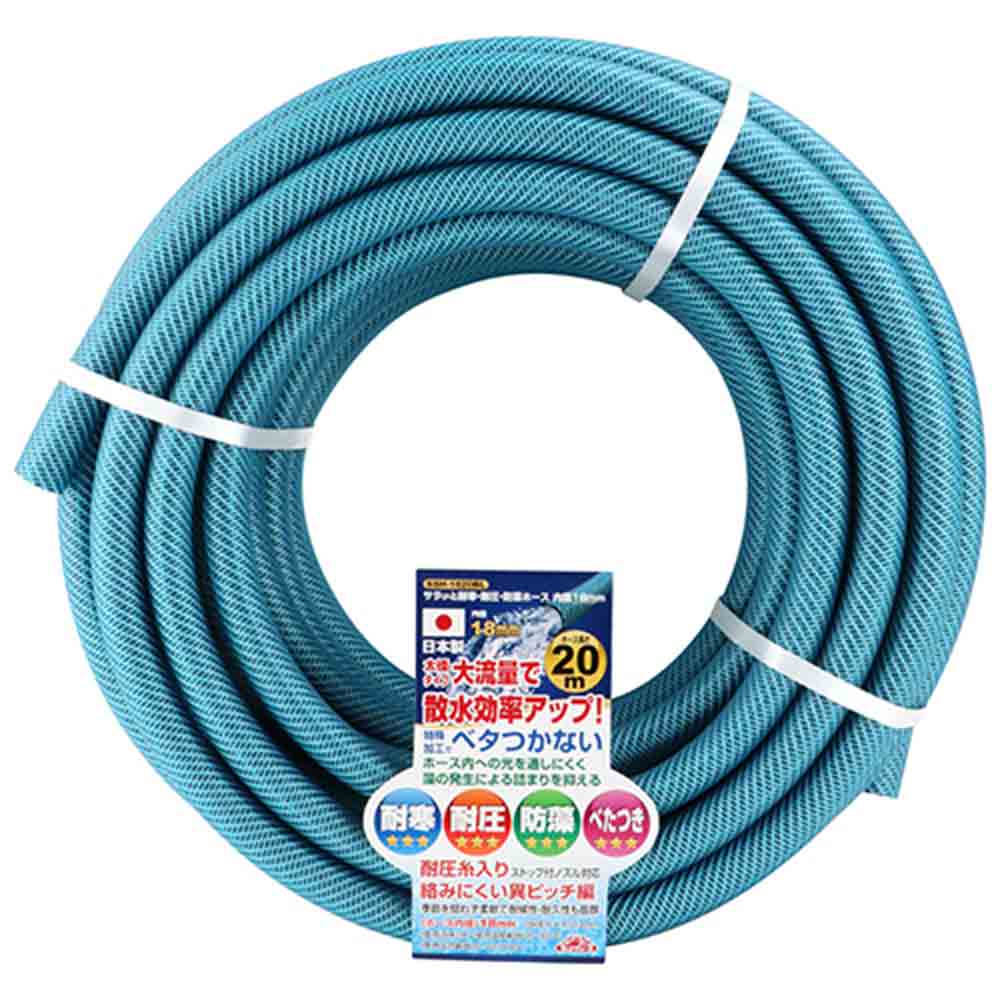 内径18mmの太径タイプで大流量なので効率よく散水できます。 水まき・掃除・洗車など多用途対応の散水。 べたつきにくい特殊加工で、サラッと快適に作業できます。 ホースがもつれにくい異ピッチ編みです。 ホース内への光をカットし藻の発生による詰まりを抑えます。 耐圧糸入りなのでストップ付ノズルにも装着・使用可能です。 季節を問わず柔軟性・耐候性・耐久性に優れた耐圧散水ホースです。 ●ホース内径:18mm。 ●ホース外径:23mm。 ●ホース長さ:20m。 ●使用圧力範囲:0~0.7MPa。 ●使用温度範囲:0~60度。 ●使用流体:水。