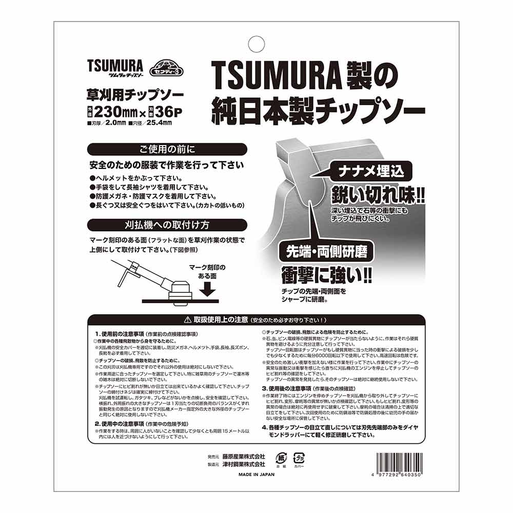 純日本製、藤原産業×津村鋼業共同企画チップソーです。 草刈り・刈払い作業。 研磨やロウ付け作業等全て日本で製造・加工を行ったチップソーになります。 4面研磨+最高級チップ搭載で抜群の切味と耐久性を実現しました。 安心の斜め埋め込みのため耐久性抜群です。 ツムラ製翼チップソーと同等品になり、純日本製のツムラ製品をお求めやすい価格で提供します。 ●外径:230mm。 ●刃数:36P。 ●刃厚:2.0mm。 ●穴径:25.4mm。 ●刈払機推奨排気量:25cc未満。 ●JIS規格適合商品。 ●最高級超硬チップ使用。 ●日本製。