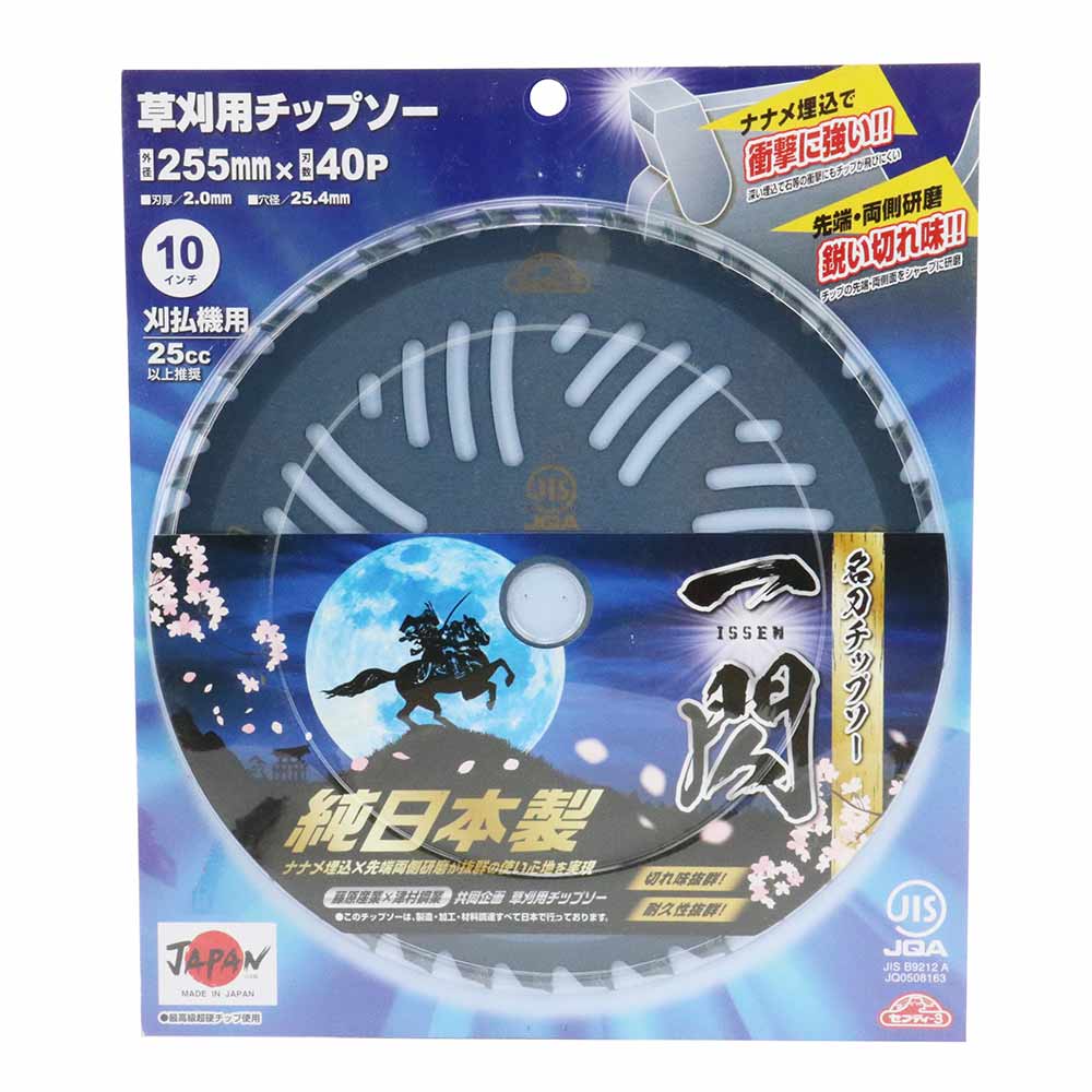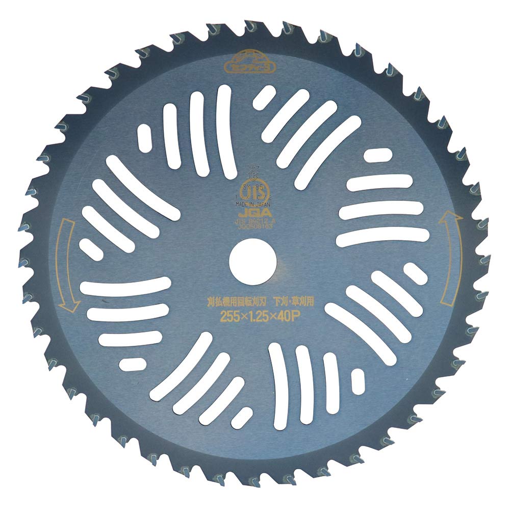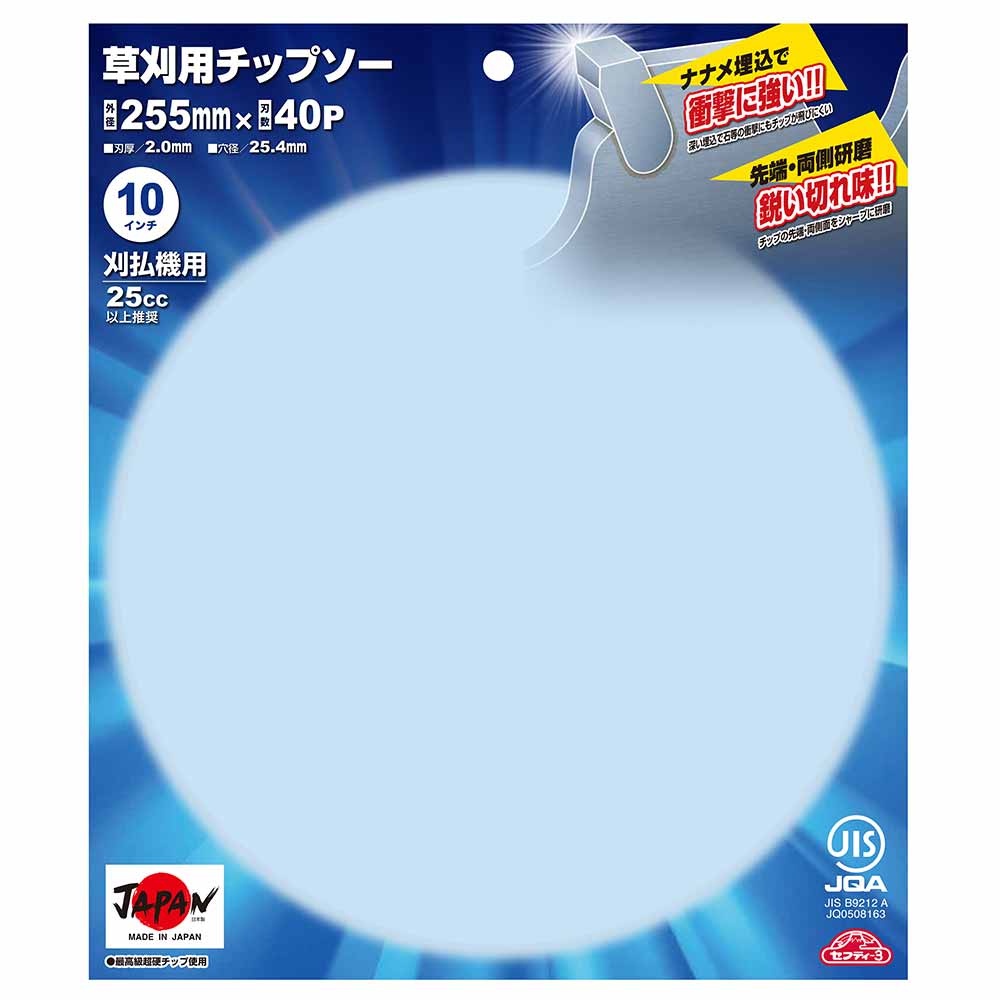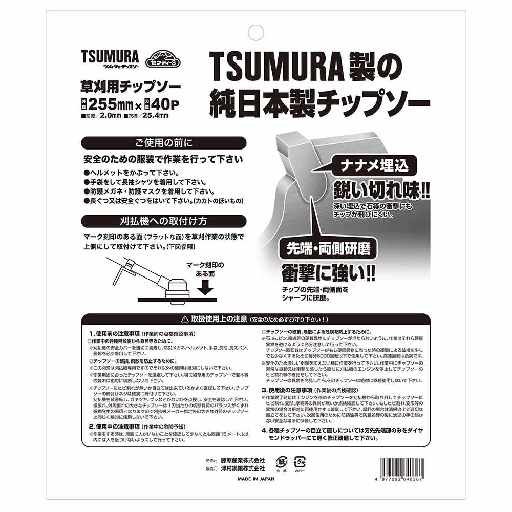 純日本製、藤原産業×津村鋼業共同企画チップソーです。 草刈り・刈払い作業。 研磨やロウ付け作業等全て日本で製造・加工を行ったチップソーになります。 4面研磨+最高級チップ搭載で抜群の切味と耐久性を実現しました。 安心の斜め埋め込みのため耐久性抜群です。 ツムラ製翼チップソーと同等品になり、純日本製のツムラ製品をお求めやすい価格で提供します。 ●外径:255mm。 ●刃数:40P。 ●刃厚:2.0mm。 ●穴径:25.4mm。 ●刈払機推奨排気量:25cc以上。 ●JIS規格適合商品。 ●最高級超硬チップ使用。 ●日本製。