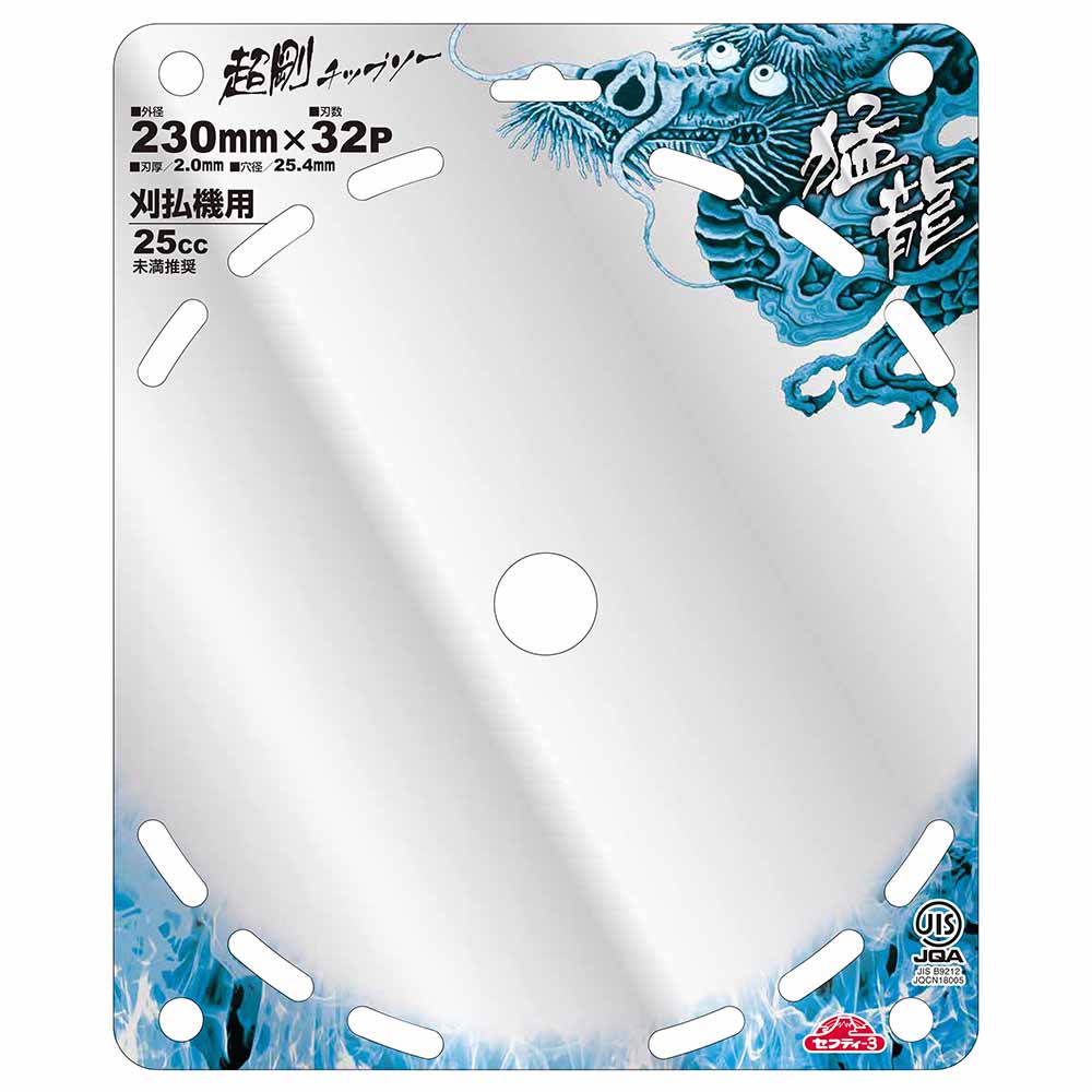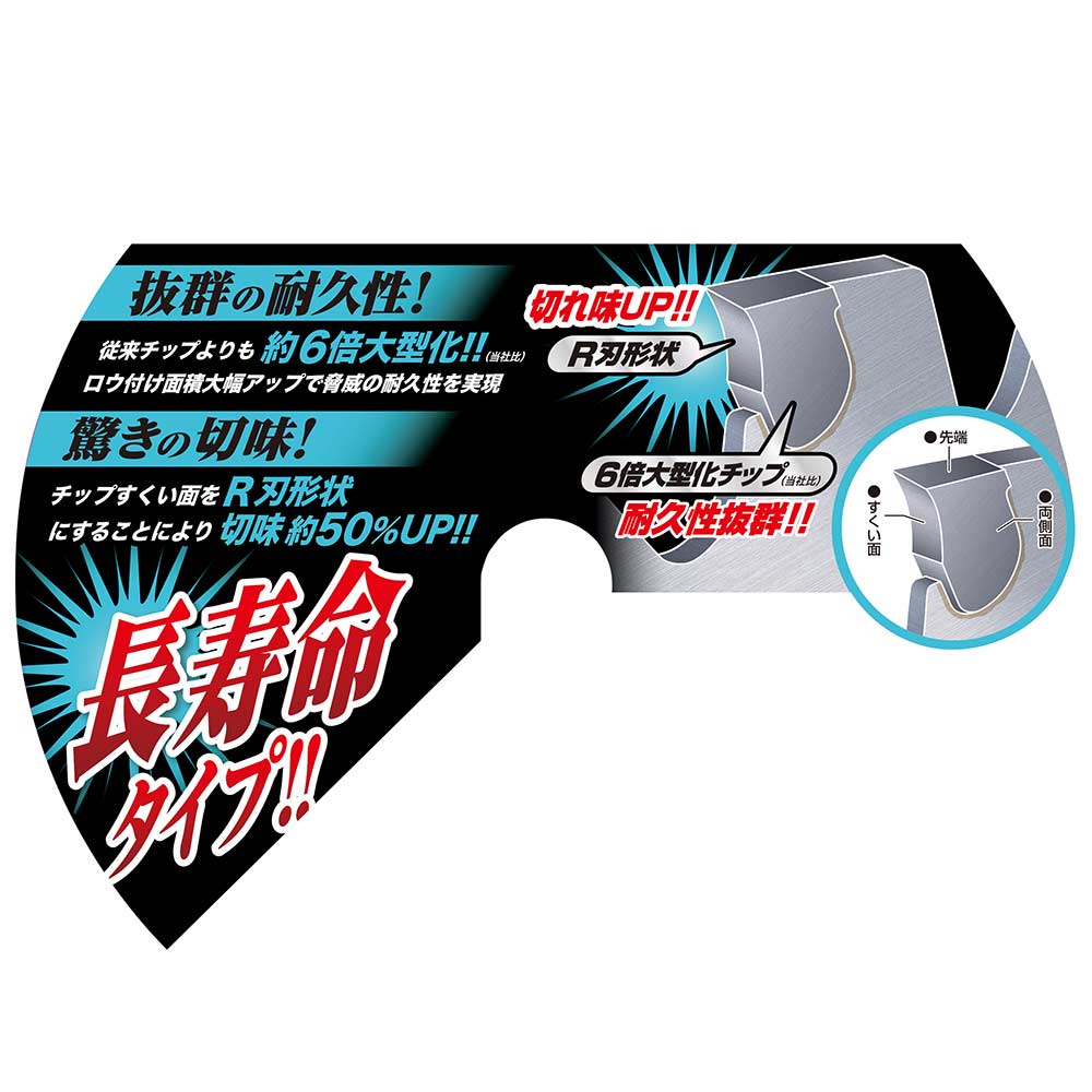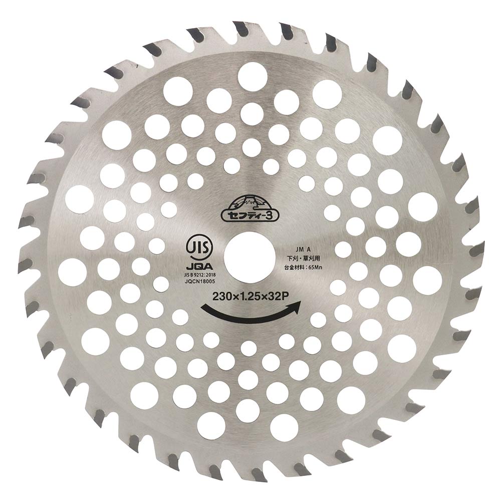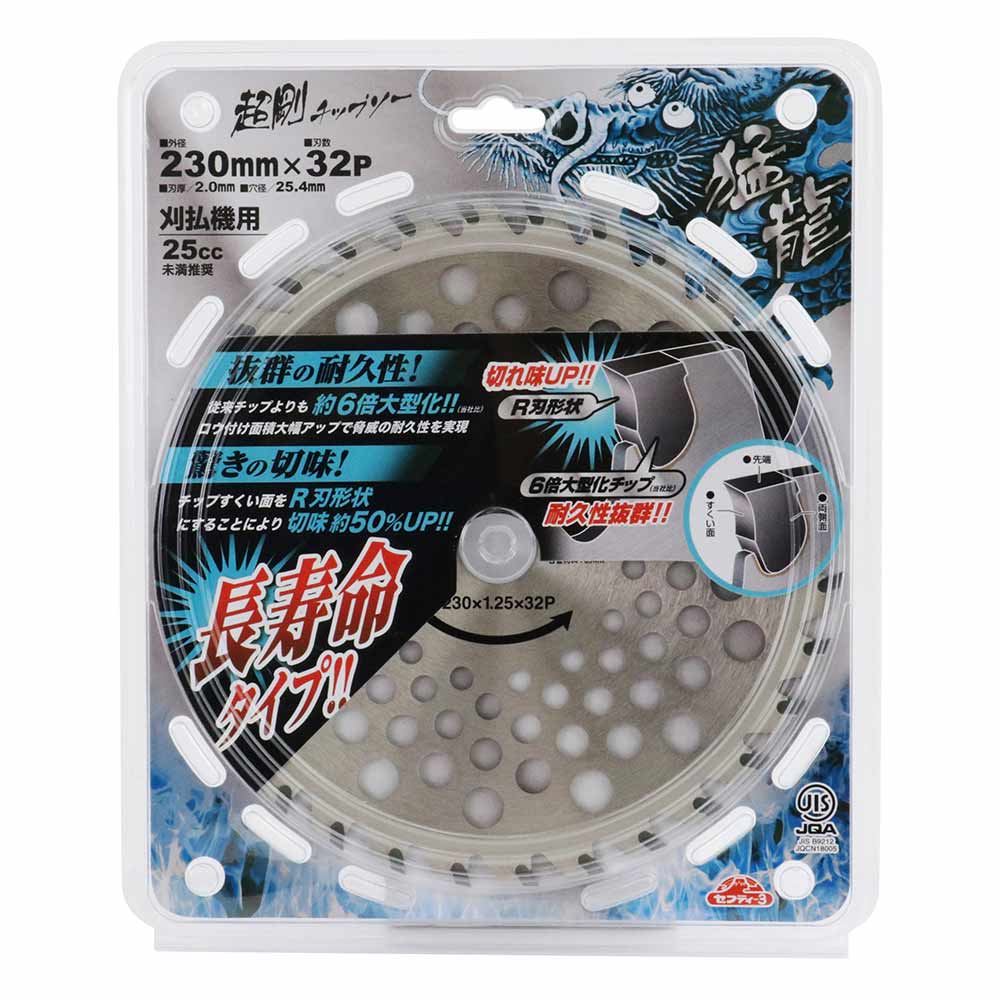 6倍大型チップ+R刃で抜群の耐久性と切味を両立しました。 草刈り・刈払い作業。 従来チップより約6倍大型化(当社比)、ロウ付け面積大幅アップし抜群の耐久性を実現しました。 R刃形状チップ採用で抜群の切味を実現しました。 ●外径:230mm。 ●刃数:32P。 ●刃厚:2.0mm。 ●台金厚:1.25mm。 ●穴径:25.4mm。 ●刈払機推奨排気量:25cc未満。 ●JIS規格適合商品。 ●表面クロームメッキ加工。