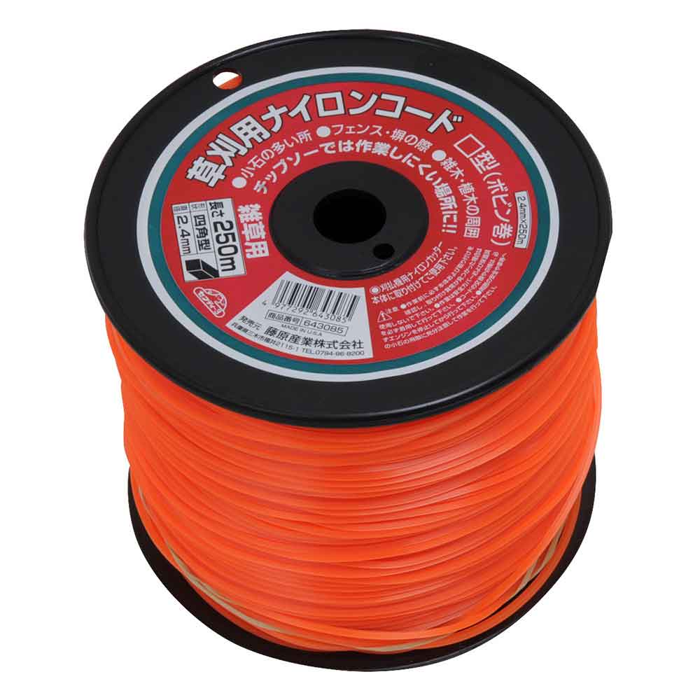 チップソーでは作業しにくい場所、狭い場所での草刈作業に最適です。 刈払機用ナイロンコード。 小石の多いところ・フェンス、塀の際・雑草、植木の周囲での作業に最適です。 狭い場所での草刈作業に最適です。 ●四角型。 ●直径:2.4mm。 ●長さ:約250m。