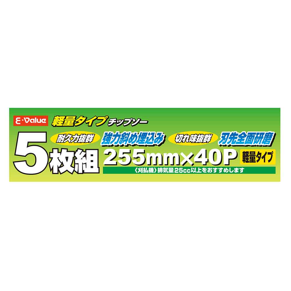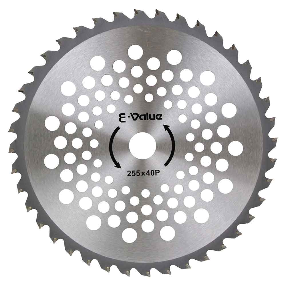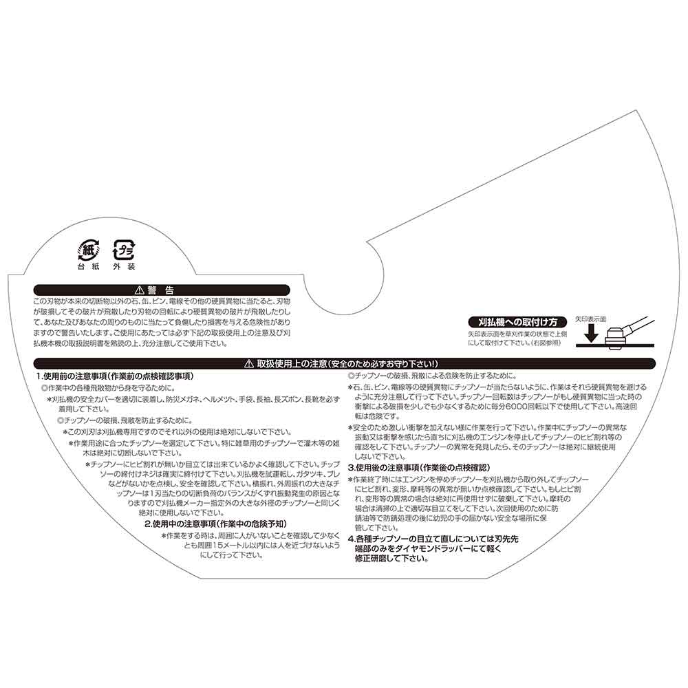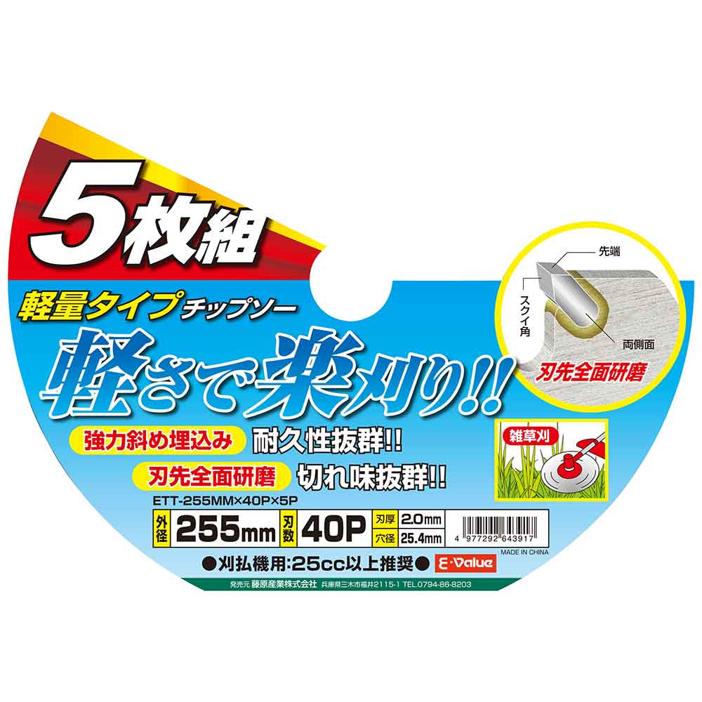 軽量タイプで刈払作業の負担を減らします。 草刈り作業。 強力斜め埋め込みのため耐久性抜群です。 刃先全面研磨により切れ味抜群です。 ●外径:255mm。 ●刃数:40P。 ●刃厚:2.0mm。 ●穴径:25.4mm。 ●刈払機推奨排気量:25cc以上。 ●5枚組。