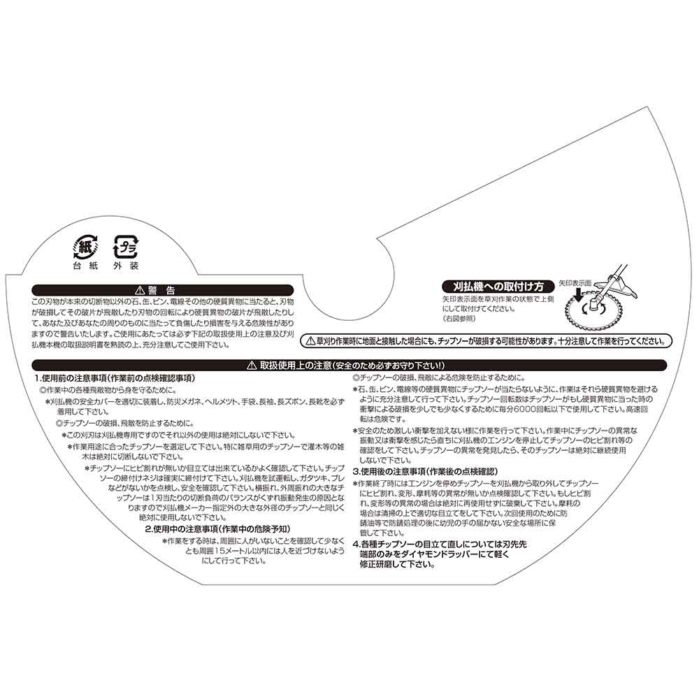 刈払機の安全カバーを適切に装着し、防災メガネ、ヘルメット、手袋、長袖、長ズボン、長靴を必ず着用して下さい。この刈刃は刈払機専用ですのでそれ以外の使用は絶対にしないで下さい。 作業用途に合ったチップソーを選定して下さい。特に雑草用のチップソーで灌木等の雑木は絶対に切断しないで下さい。チップソーにヒビ割れが無いか目立ては出来ているかよく確認して下さい。チップソーの締付けネジは確実に締付けて下さい。 刈払機を試運転し、ガタツキ、ブレなどがないかを点検し、安全を確認して下さい。横振れ、外周振れの大きなチップソーは1刃当たりの切断負荷のバランスがくずれ振動発生の原因となりますので刈払機メーカー指定外の大きな外径のチップソーと同じく絶対に使用しないで下さい。作業をする時は、周囲に人がいないことを確認して少なくとも周囲15メートル以内には人を近づけないようにして行ってください。