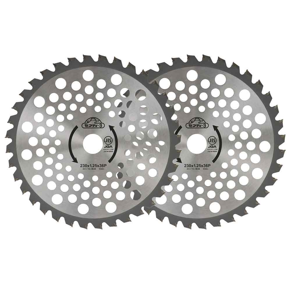 安心のJIS規格適合認証商品、軽量タイプで快適に作業できます。 刈払機用チップソー。 チップ部4面研磨で切れ味抜群です。 強力斜め埋込みで耐久性抜群です。 ●外径:230mm。 ●刃数:36P。 ●刃厚:2.0mm。 ●台金厚:1.25mm。 ●穴径:25.4mm。 ●25cc未満刈払機推奨。 ●JIS規格適合商品。 ●2枚組。