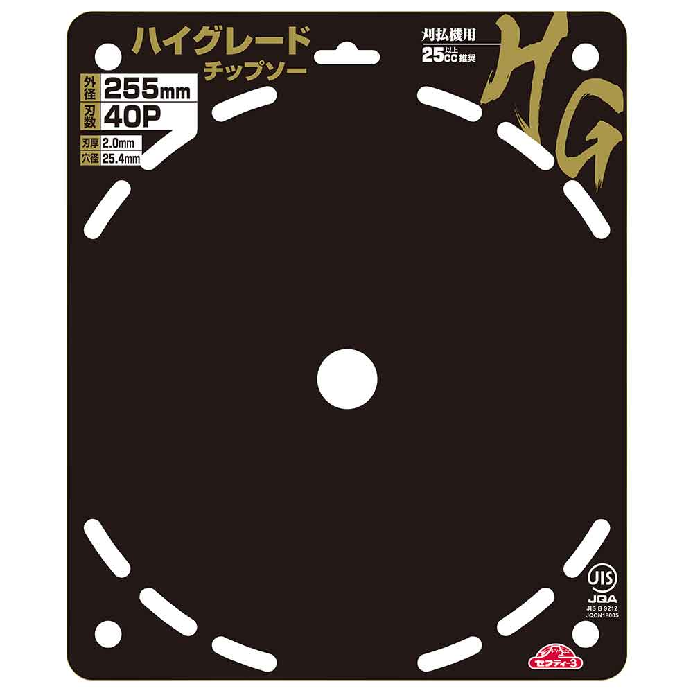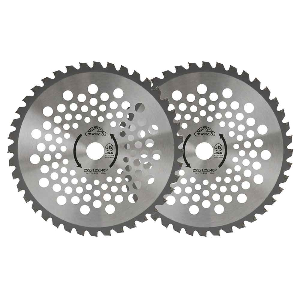 安心のJIS規格適合認証商品、軽量タイプで快適に作業できます。 刈払機用チップソー。 チップ部4面研磨で切れ味抜群です。 強力斜め埋込みで耐久性抜群です。 ●外径:255mm。 ●刃数:40P。 ●刃厚:2.0mm。 ●台金厚:1.25mm。 ●穴径:25.4mm。 ●25cc以上刈払機推奨。 ●JIS規格適合商品。 ●2枚組。