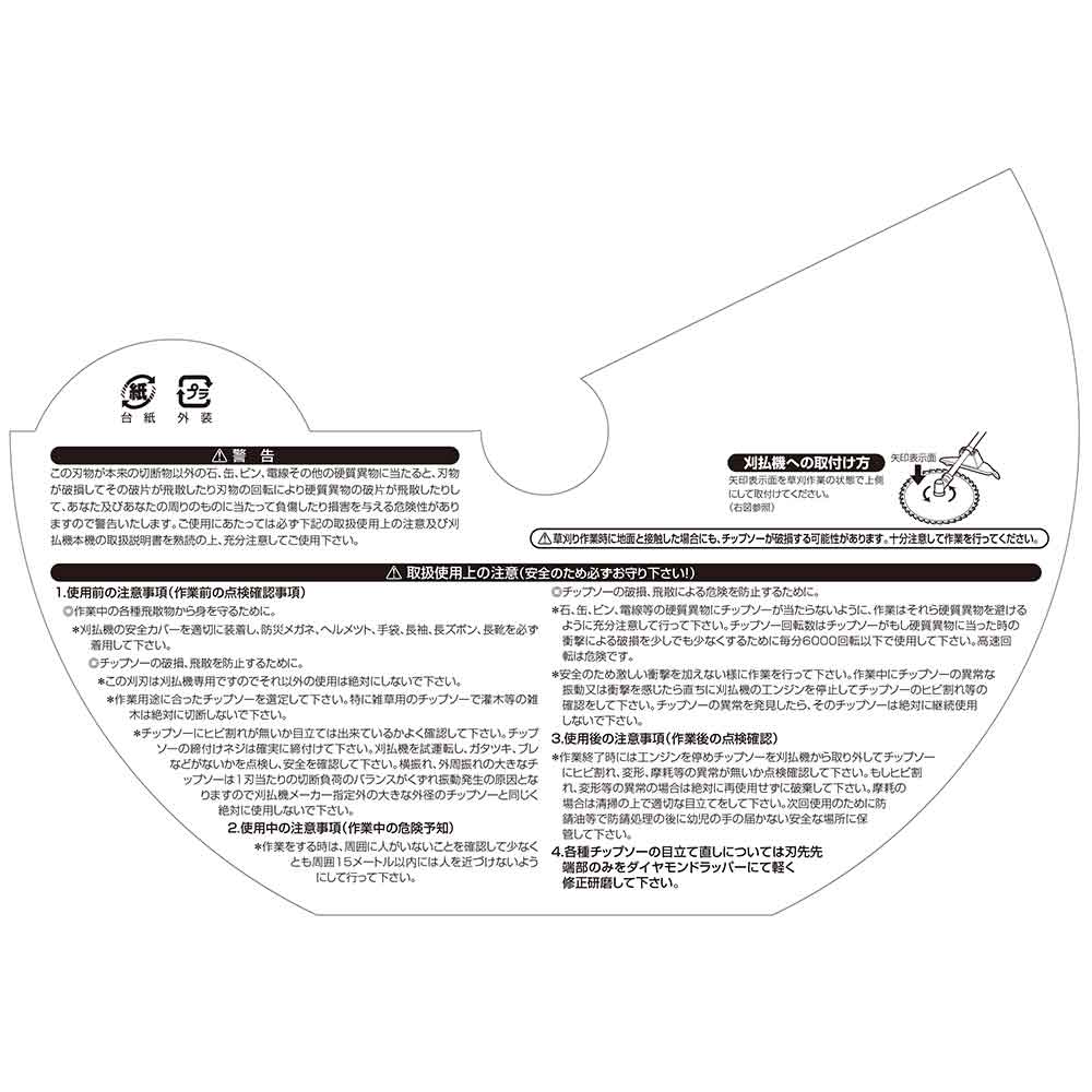 刈払機の安全カバーを適切に装着し、防災メガネ、ヘルメット、手袋、長袖、長ズボン、長靴を必ず着用して下さい。この刈刃は刈払機専用ですのでそれ以外の使用は絶対にしないで下さい。 作業用途に合ったチップソーを選定して下さい。特に雑草用のチップソーで灌木等の雑木は絶対に切断しないで下さい。チップソーにヒビ割れが無いか目立ては出来ているかよく確認して下さい。チップソーの締付けネジは確実に締付けて下さい。 刈払機を試運転し、ガタツキ、ブレなどがないかを点検し、安全を確認して下さい。横振れ、外周振れの大きなチップソーは1刃当たりの切断負荷のバランスがくずれ振動発生の原因となりますので刈払機メーカー指定外の大きな外径のチップソーと同じく絶対に使用しないで下さい。作業をする時は、周囲に人がいないことを確認して少なくとも周囲15メートル以内には人を近づけないようにして行ってください。