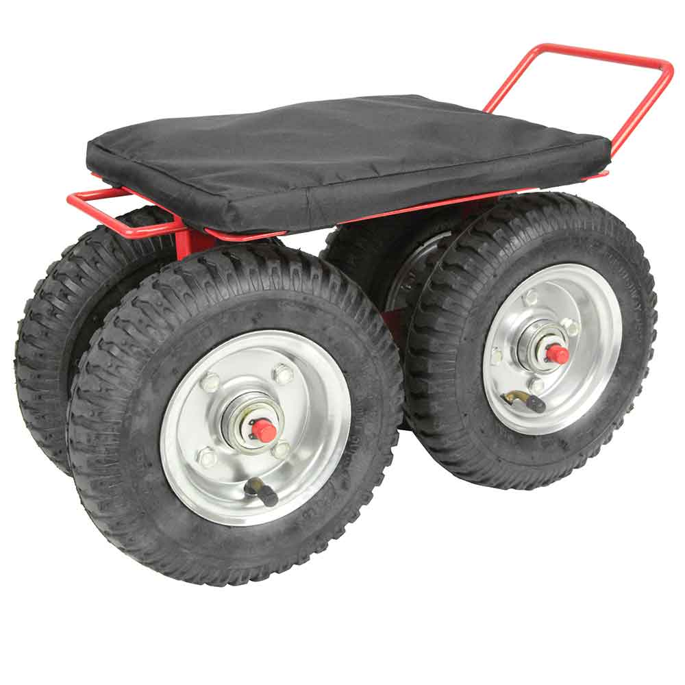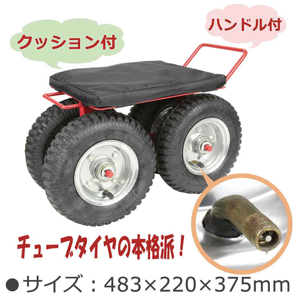 園芸作業をより快適にします。 畑・ガーデニングの座り作業。 丈夫なチューブタイヤ仕様です。 座ったまま移動が出来て作業が楽々出来ます。 座り心地の良い座布団付です。 持ち運びに便利なハンドル付です。 ●サイズ:483×220×375mm。 ●耐荷重:100kg。 ●チューブタイヤ仕様。