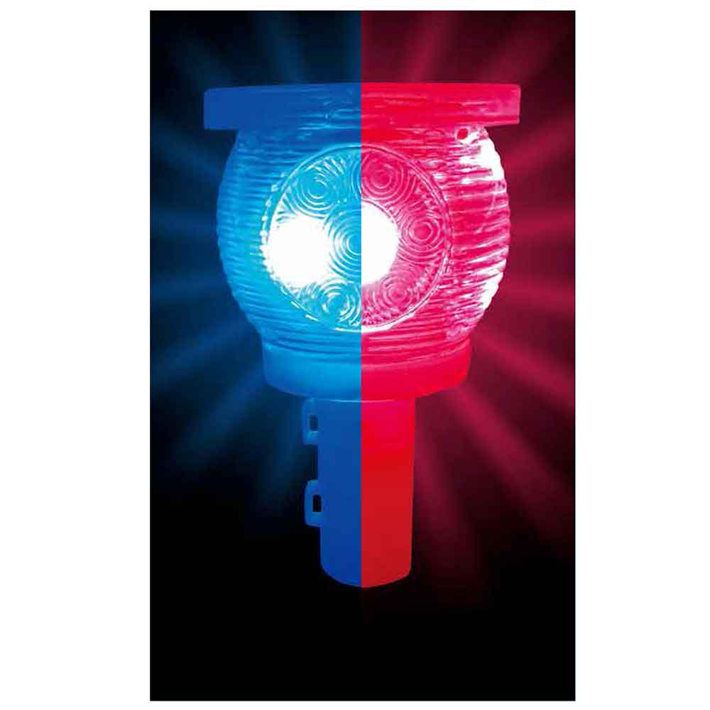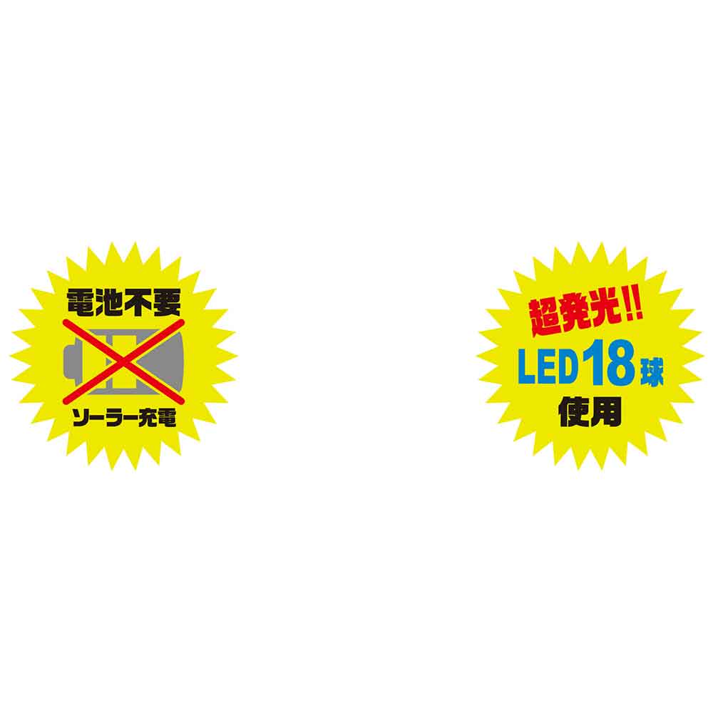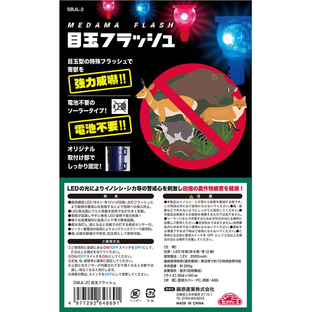 LEDの光によりイノシシ・シカ等の警戒心を刺激し田畑の農作物被害を軽減します。 畑・お庭の獣避け、防犯・防災用。 超高輝度LED(赤6ヶ・青12ヶ)が回転・点灯フラッシュにより動物の警戒心を刺激することで田畑への侵入防止します。 LED発光面にアルミ蒸着を採用しているので、360度光が大きく拡散します。 様々な設置場所に結束バンド等で簡単に設置でき、害獣が認識しやすい青色LED採用で強力に刺激します。 昼は消灯し、夜になると自動で点灯する昼夜センサー付です。 ソーラー蓄電池の採用によりメンテナンスフリーで経済的です。 ●光源:LED18個(赤6個/青12個)。 ●使用電池:1.2V2000mAh。 ●連続使用時間:無日照で約70時間使用可能。 ●設置場所:屋外(防雨構造)。