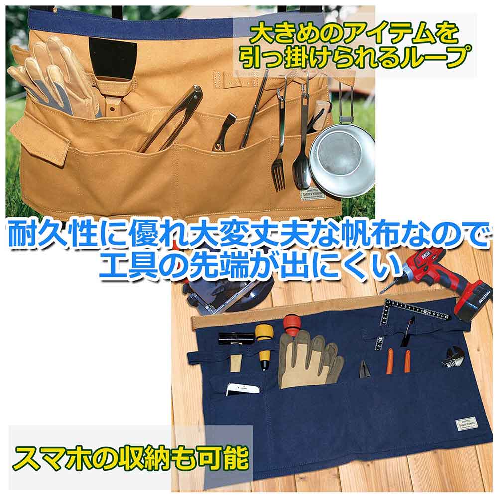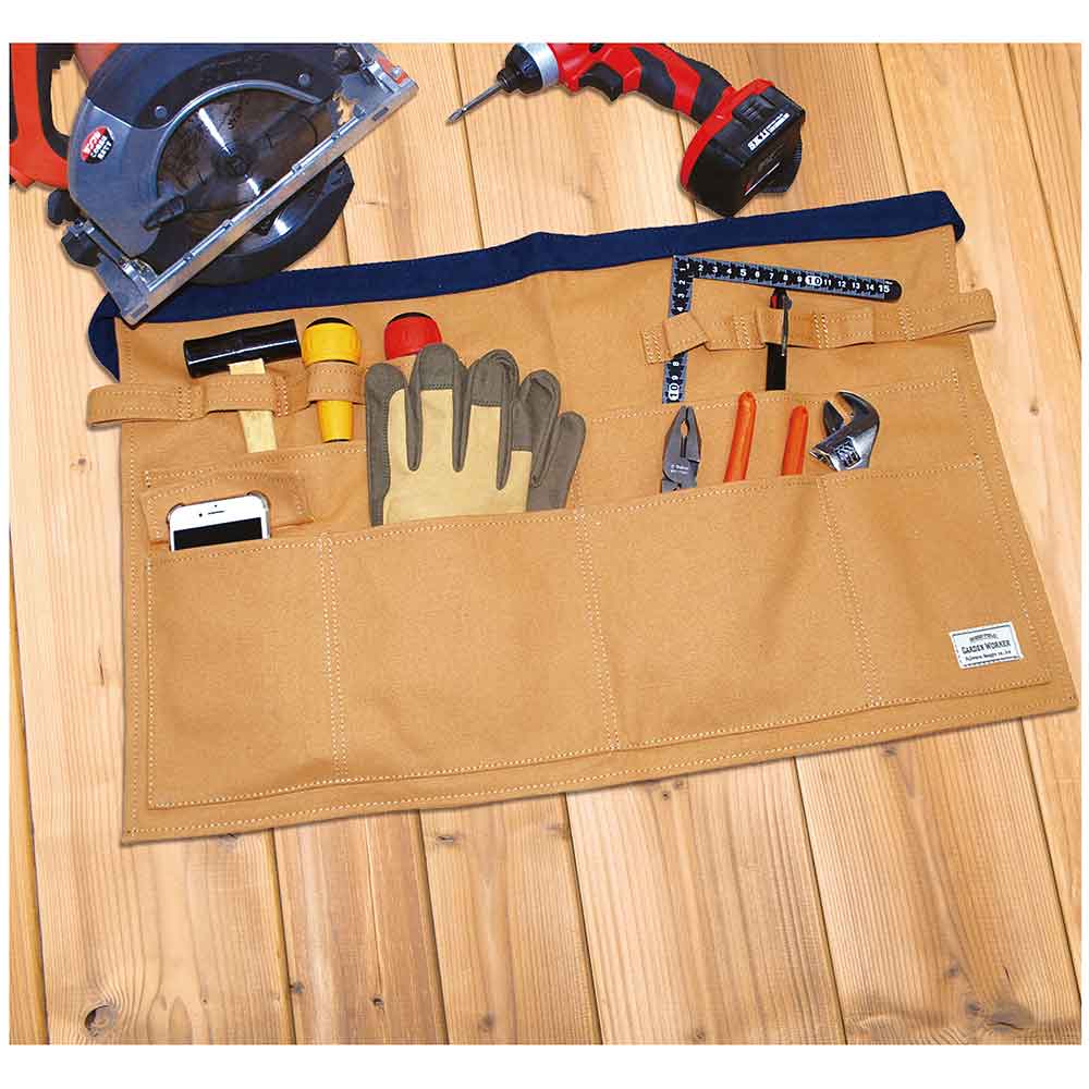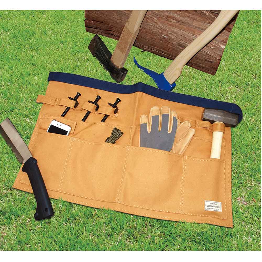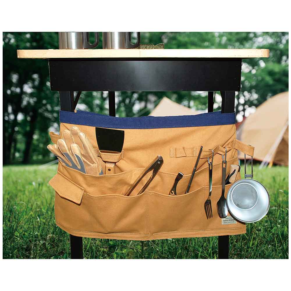 ガーデニング・DIY・テント設営などあらゆるシーンに適した多機能エプロンです。 園芸・アウトドア等の作業時の保護具。 複数のポケット付きで道具の保管・収納が可能です。 園芸・アウトドアで動きやすいショートタイプです。 耐久性に優れとにかく丈夫な帆布生地を採用しています。 アウトドアテーブルの金具に取り付けが可能です。 ●サイズ:幅600mm×長さ440mm×左右紐1000mm。 ●カラー:ブラウン。