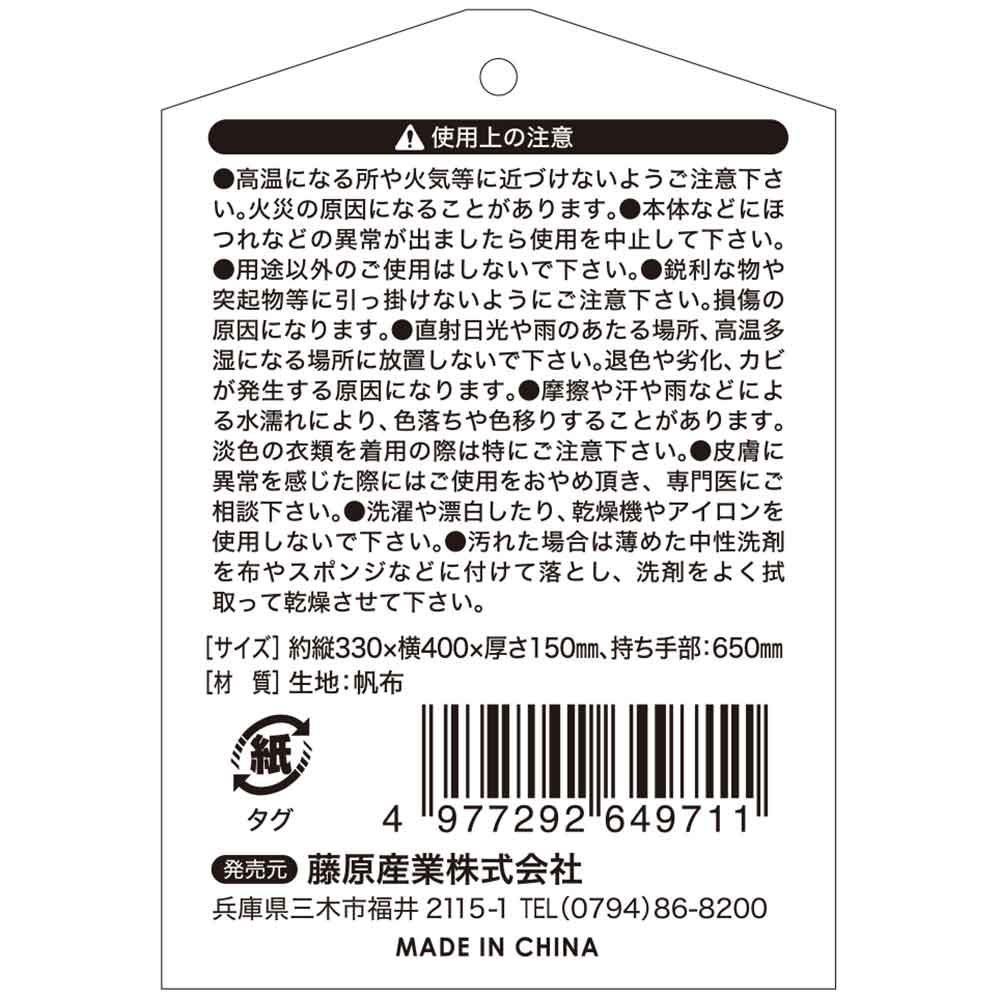 高温になる所や火気等に近づけないようご注意ください。火災の原因になることがあります。 本体などにほつれなどの異常が出ましたら仕様を中止してください。 用途以外のご使用はしないでください。汚れた場合は薄めた中性洗剤を布やスポンジなどに付けて落とし、洗剤をよく拭取って乾燥させてください。